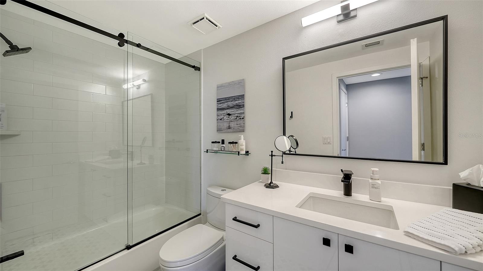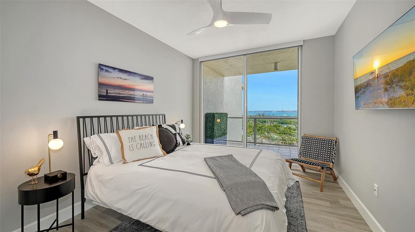 Showcasing breathtaking bay and city skyline views, this impeccably remodeled furnished residence delivers refined coastal elegance and effortless waterfront living. From the moment you enter, panoramic water and skyline vistas take center stage, setting the tone for a light-filled interior designed for both comfort and entertaining. The open floor plan features an inviting living room and dining area with designer lighting and walls of glass opening to the extraordinary 40+ foot terrace, an ideal setting for morning coffee or hosting guests against a stunning waterfront backdrop. The beautifully appointed kitchen blends style and function with custom cabinetry, quartz countertops, under-cabinet lighting, tile backsplash, and a full suite of Bosch appliances including refrigerator with freezer drawer, dishwasher, built-in microwave, oven with warming drawer, electric 5-burner cooktop, and vent hood. A Silhouette Professional dual-zone beverage center completes the space for effortless entertaining. The tranquil primary suite is a private retreat with terrace access, ceiling fan, and a thoughtfully redesigned spa-style bath featuring dual vanities, walk-in shower, and private water closet with Toto toilet and bidet. An office with a Murphy bed offers a closet with barn door enclosure, accent wall, frosted glass double doors, and ceiling fan, while an additional bedroom enjoys terrace access. The guest bath includes a tub/shower combination with Kohler fixtures, and the elegant powder bath showcases marble countertops, textured accent wall, and decorative lighting. A separate laundry room with built-in cabinetry adds everyday convenience. The chic powder bath is perfectly positioned for guests. Outdoor living is exceptional on the expansive terrace, complete with patio furnishings and a Coyote electric grill. Additional features include a hallway trash chute, new water heater (2022), assigned gated under-building parking space, and private storage locker. Located within the prestigious L'Elegance on Lido Key, residents enjoy a secure gated beachfront community with guard service, direct beach access, heated lap pool, spa, children's pool, fitness center with saunas, tennis courts, kayak and bike storage, social rooms, underground parking, and full-time maintenance staff. Extensive building enhancements are underway including renovated common areas, brand-new elevators nearing completion, and a new roof in 2025. Assessments are fully paid and reserves are funded. With city beach re-nourishment underway, this is a rare opportunity to enjoy turnkey coastal luxury in one of Sarasota's premier beachfront communities, where every day feels like a private resort escape.