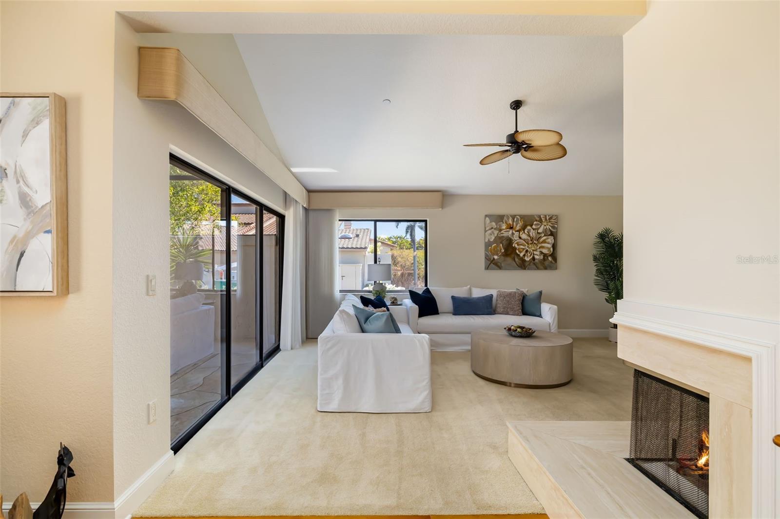 Perfectly positioned and fully furnished this exceptional end-unit villa is located on prestigious Longboat Key within the double-gated Bay Isles community, offering the rare opportunity to embrace true island living with expansive private terrace space and tranquil pond views fed by the saltwater bay. Encompassing nearly 2,400 square feet of thoughtfully designed interiors, this residence delivers privacy, security, and effortless elegance in one of Sarasota's most coveted coastal enclaves and just moments from world-renowned Gulf beaches.Inside, soaring vaulted ceilings and inviting natural light pour in, creating an airy and refined atmosphere. The well-appointed floorplan balances sophistication with comfort, featuring multiple gathering spaces including a formal living room anchored by a charming wood-burning fireplace. Expansive sliding doors seamlessly connect the interior to an impressive 740-square-foot private terrace overlooking the serene pond waters, creating a seamless indoor-outdoor lifestyle ideal for sunset entertaining, morning coffee, or elegant evenings under the island sky.Rich wood flooring, plantation shutters, granite countertops, and updated cabinetry reflect timeless coastal luxury. A skylight enhances the kitchen with beautiful natural light, while recent improvements including a brand-new air conditioning system (2025) and new roof (2025) provide peace of mind.Two private atriums introduce lush greenery and architectural interest, adding intimate moments within the home. A thoughtfully designed office with a built-in Murphy bed offers flexibility and can easily function as a fourth bedroom, accommodating guests with ease.The primary suite serves as a spacious sanctuary, while guest bedrooms offer privacy and comfort for family and visitors alike. The private two-car garage features organized storage for beach and recreational essentials, supporting a seamless island lifestyle.Residents of Harbour Circle enjoy a heated community pool and spa surrounded by manicured tropical landscaping, along with exclusive membership to the gated Bay Isles Beach Club -- providing private Gulf-front access with convenient dedicated parking. Living on Longboat Key means enjoying easy access to world-renowned beaches, boating, fine dining, and the amenities of the Longboat Key Club, including golf, tennis, pickleball, marina access, and multiple private dining venues (membership available separately). Everyday conveniences including Publix, banks, the post office, and Longboat Key's Town Center are just moments away.Quiet, private, and impeccably maintained, this fully furnished end-unit villa offers the feel of a single-family residence while delivering the sophistication and prestige of island living on Longboat Key.Schedule your private showing today and experience the elevated coastal lifestyle that awaits.