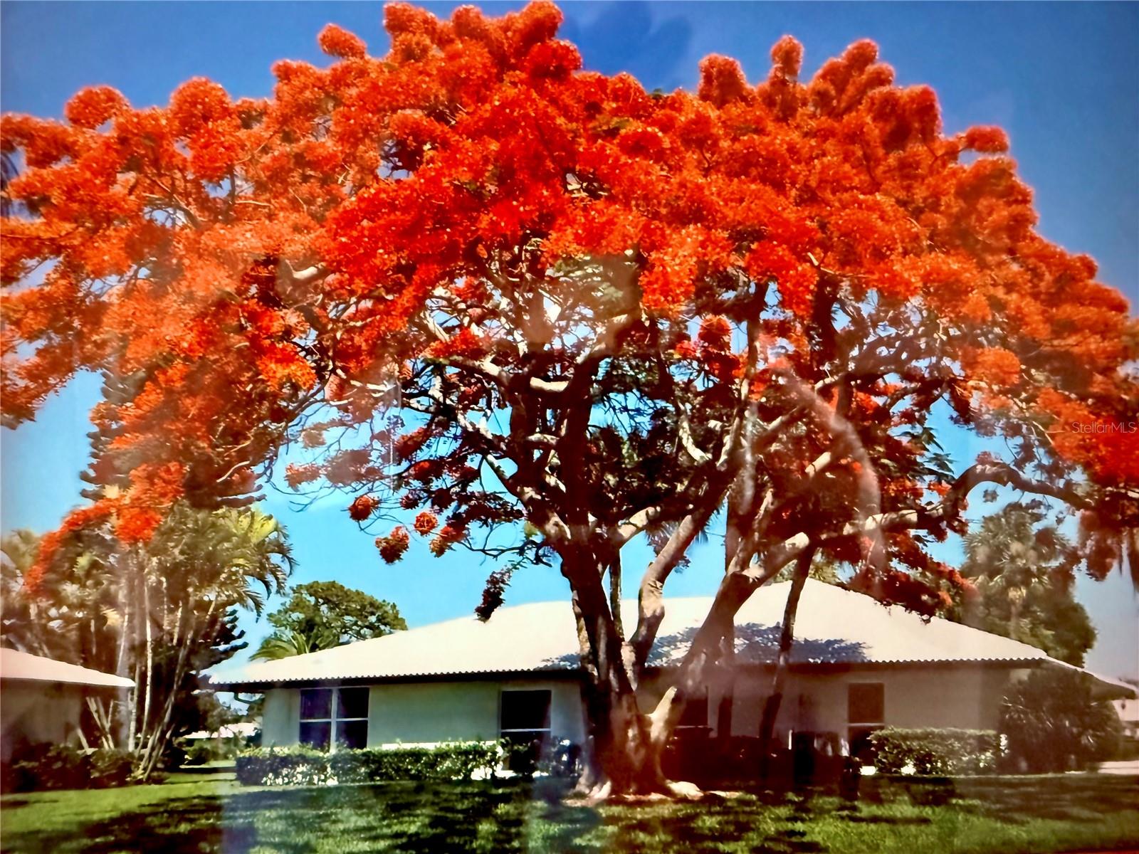 This home has an outstanding location situated on a corner lot with a spacious yard under the grand Royal Poinciana tree all maintained by the association. Enjoy gorgeous sunset views with the gulf breezes coming from Palma Sola bay a few blocks away. Entering the home, notice the easy flow from the updated kitchen with a breakfast nook to the living area, including a formal dining area and end up in the bright and cheerful sunroom where enjoying morning coffee or a favorite evening beverage is a must. The large primary suite sits far away from the living area for privacy and includes an en-suite bath with updated walk-in shower. There is a sizable second bedroom and bath with a tub. The laundry/mud room has lots of space for storage or simple laundry tasks and the previous owner installed a clever storage area to use as your "basement". Have the peace of mind that IMPACT WINDOWS are installed and that you are located in FLOOD ZONE X. Village Green offers comfortable maintenance free living with a swimming pool, located behind the home on the "green". A few minutes' drive can get you to Bradenton Beach on Cortez or Anna Maria Island via Manatee Avenue. Blake Medical Center is close by and there is access to shopping galore. Sarasota, Tampa and St. Pete Airports are all a short distance away.