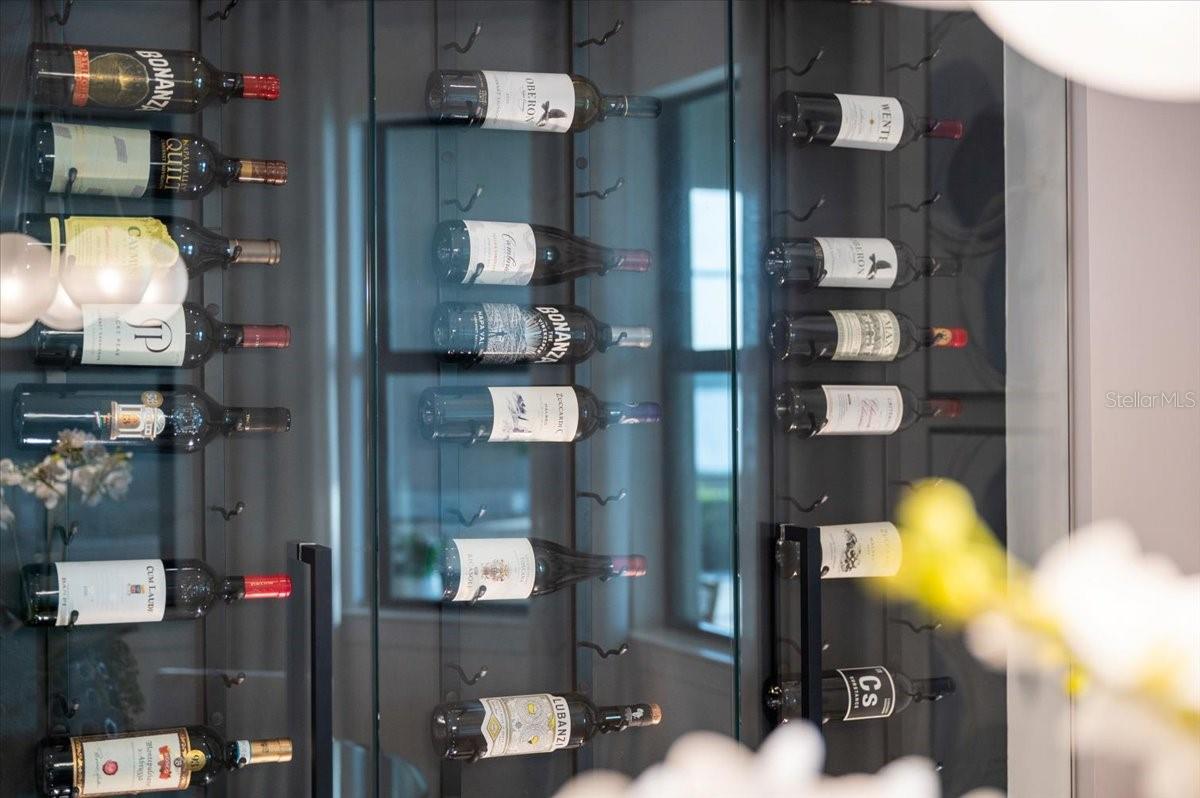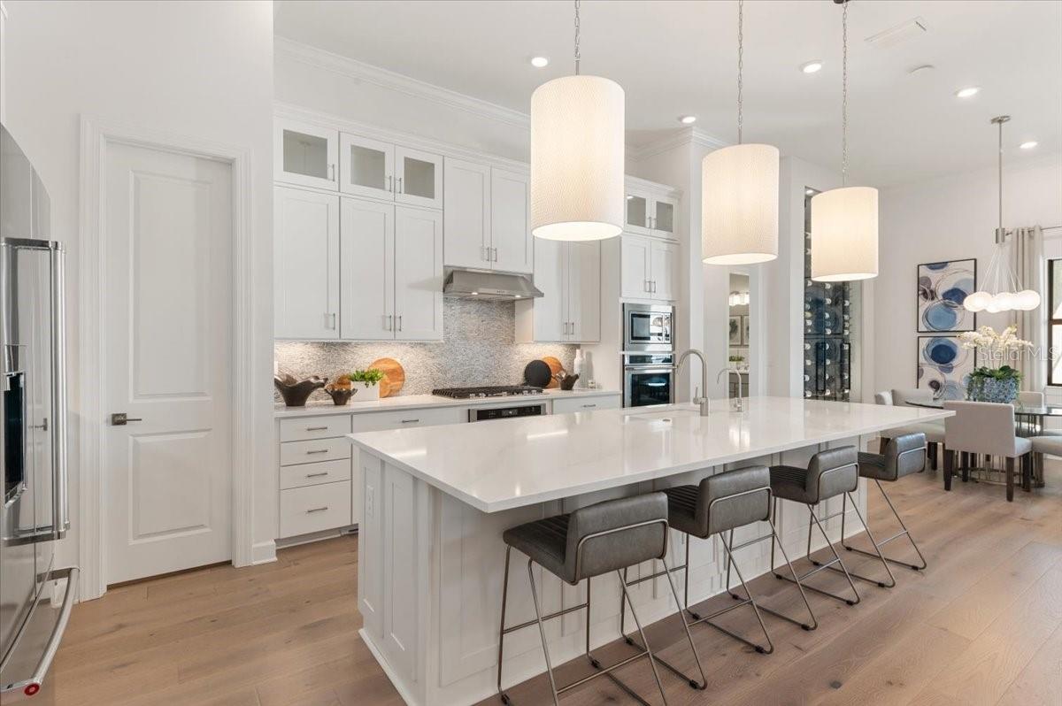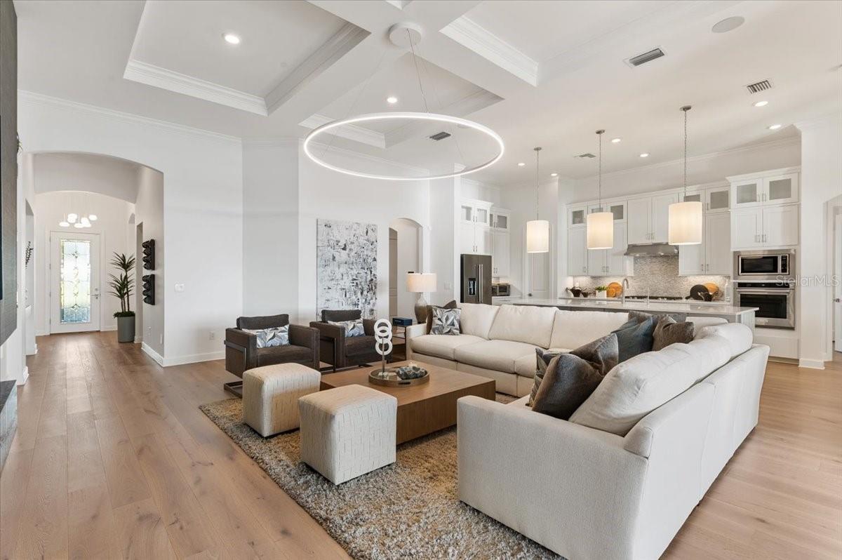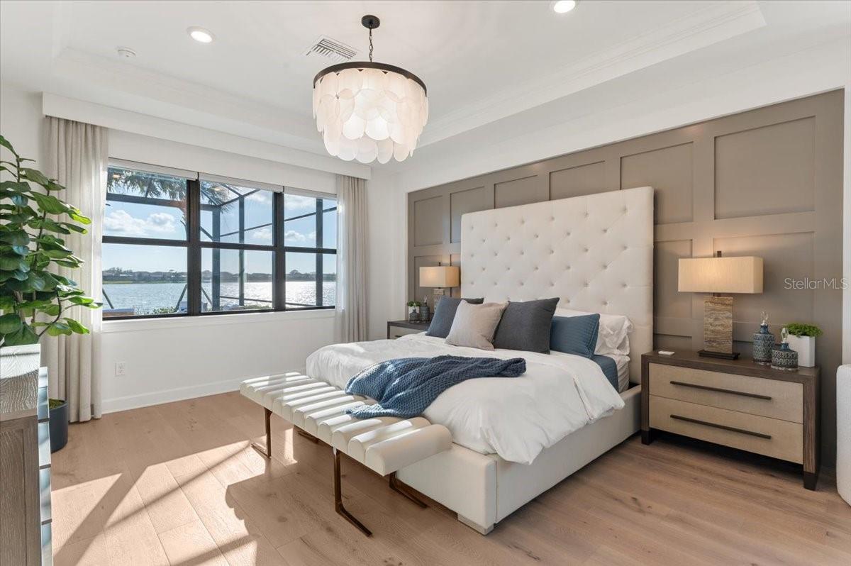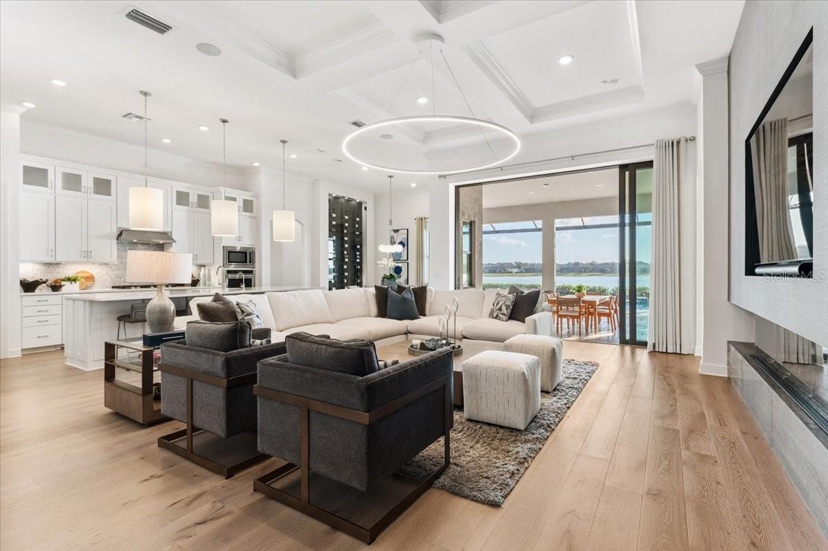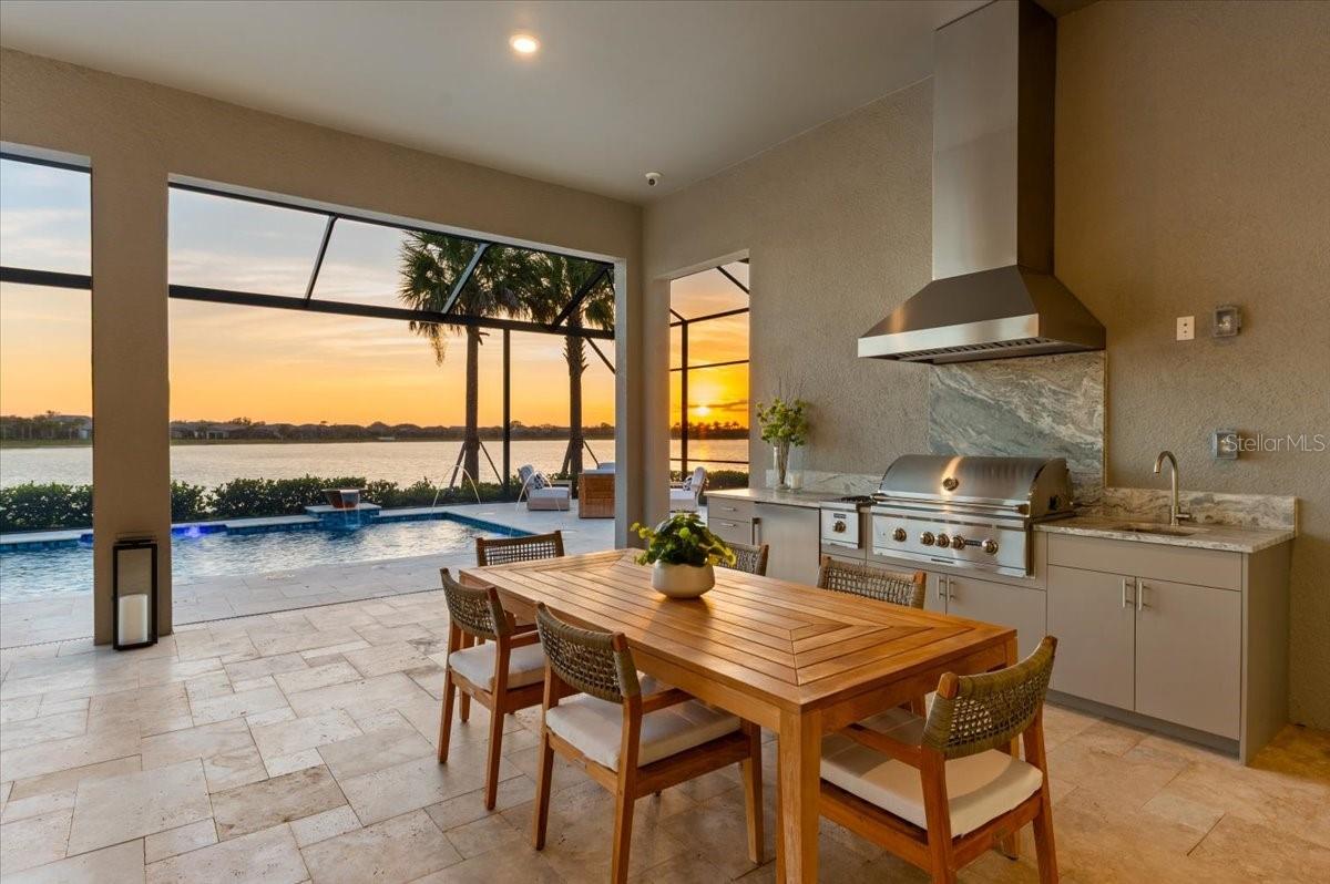 An extraordinary expression of lakeside luxury, this impeccably fully upgraded residence is perfectly positioned along one of the largest lakes in the highly sought-after community of Shoreview at Waterside. Fully upgraded with nothing left to be desired, this home offers four bedrooms, three full baths, two half baths, and a versatile flex room all one level. Upon entering, you will be welcomed by a captivating water view and rich wood flooring that flows throughout the main living spaces. The gourmet kitchen is expertly suited for entertaining with double ovens, quartz countertops, an oversized island with seating, reverse osmosis system, a walk-in pantry, a gas cooktop, and a custom tile backsplash. The great room impresses with soaring ceilings and a custom built-in TV wall with fireplace. Integrated Sonos speakers throughout the home create the perfect ambiance as upgraded 10-foot sliders open seamlessly to the outdoor retreat. Unwind in the resort-style pool and spa while taking in expansive water views and coveted southwest exposure. The entertaining space continues with an extended lanai, natural stone pavers, a convenient pool bath, and a fully equipped outdoor kitchen featuring a Coyote grill, side burner, beverage refrigerator, and sink. The owner's retreat serves as a private sanctuary, highlighted by tray ceilings, motorized blinds, and a spacious sitting area. The adjoining primary bath offers a large soaking tub, a custom tile feature wall, and an expansive custom closet. Three separate guest suites--one with a private en-suite bath--provide comfortable accommodations for family and visitors. A dedicated flex space near the kitchen, complete with a wet bar, offers versatility and is ideal for a home office, bonus room or dining room. This home offers added peace of mind with impact windows, a security system, and exterior cameras. The two-and-a-half-car garage features epoxy flooring, an electric vehicle charger, built-in shelving, and dedicated golf-cart parking. Additional highlights include a designer powder room with upgraded tile, built-in wine wall, enhanced landscaping, easement for a dock, a widened driveway and custom closet systems throughout. Shoreview at Waterside Lakewood Ranch is a highly-sought-after community that features resort-style amenities such as a beach area, heated pool and spa, clubhouse, tennis and pickleball courts, and a state-of-the-art fitness center. This home is in close proximity to Waterside Place - Lakewood Ranch's newest town center and the only waterfront retail and lifestyle destination in Sarasota. HOA includes all landscaping.