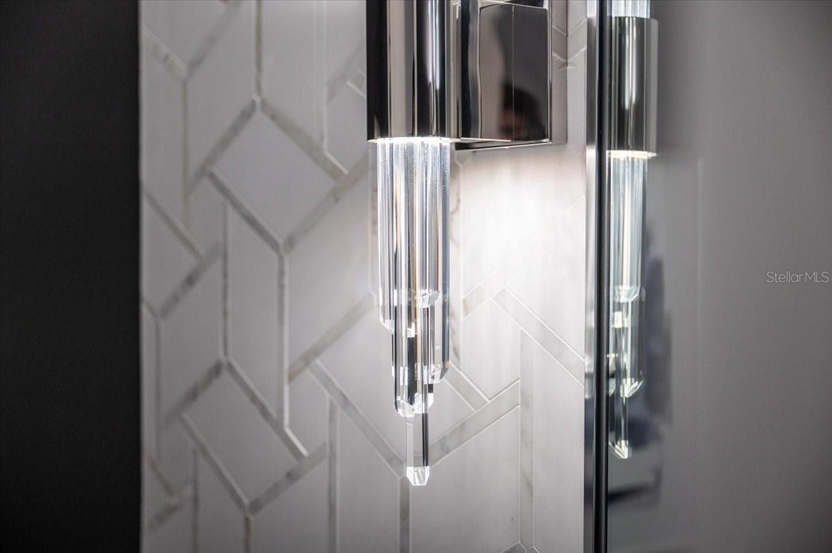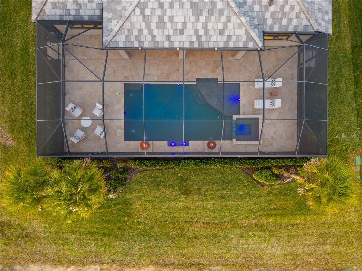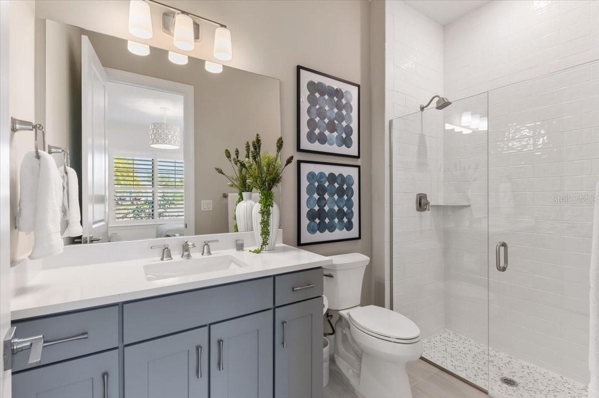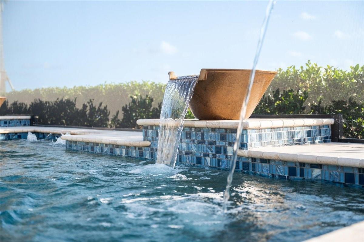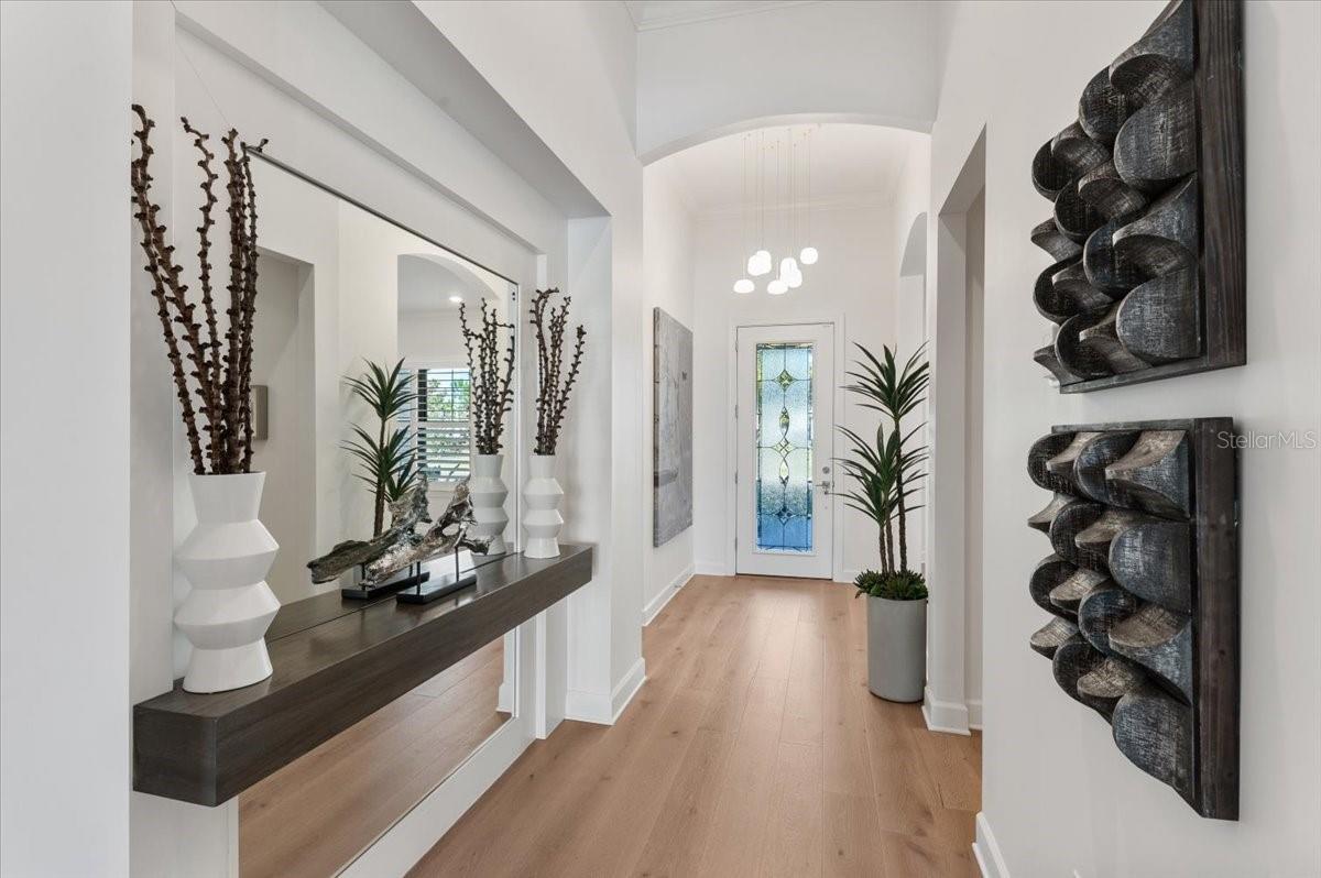 An extraordinary expression of lakeside luxury, this impeccably fully upgraded residence is perfectly positioned along one of the largest lakes in the highly sought-after community of Shoreview at Waterside. Fully upgraded with nothing left to be desired, this home offers four bedrooms, three full baths, two half baths, and a versatile flex room all one level. Upon entering, you will be welcomed by a captivating water view and rich wood flooring that flows throughout the main living spaces. The gourmet kitchen is expertly suited for entertaining with double ovens, quartz countertops, an oversized island with seating, reverse osmosis system, a walk-in pantry, a gas cooktop, and a custom tile backsplash. The great room impresses with soaring ceilings and a custom built-in TV wall with fireplace. Integrated Sonos speakers throughout the home create the perfect ambiance as upgraded 10-foot sliders open seamlessly to the outdoor retreat. Unwind in the resort-style pool and spa while taking in expansive water views and coveted southwest exposure. The entertaining space continues with an extended lanai, natural stone pavers, a convenient pool bath, and a fully equipped outdoor kitchen featuring a Coyote grill, side burner, beverage refrigerator, and sink. The owner's retreat serves as a private sanctuary, highlighted by tray ceilings, motorized blinds, and a spacious sitting area. The adjoining primary bath offers a large soaking tub, a custom tile feature wall, and an expansive custom closet. Three separate guest suites--one with a private en-suite bath--provide comfortable accommodations for family and visitors. A dedicated flex space near the kitchen, complete with a wet bar, offers versatility and is ideal for a home office, bonus room or dining room. This home offers added peace of mind with impact windows, a security system, and exterior cameras. The two-and-a-half-car garage features epoxy flooring, an electric vehicle charger, built-in shelving, and dedicated golf-cart parking. Additional highlights include a designer powder room with upgraded tile, built-in wine wall, enhanced landscaping, easement for a dock, a widened driveway and custom closet systems throughout. Shoreview at Waterside Lakewood Ranch is a highly-sought-after community that features resort-style amenities such as a beach area, heated pool and spa, clubhouse, tennis and pickleball courts, and a state-of-the-art fitness center. This home is in close proximity to Waterside Place - Lakewood Ranch's newest town center and the only waterfront retail and lifestyle destination in Sarasota. HOA includes all landscaping.