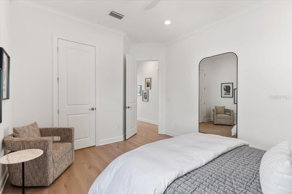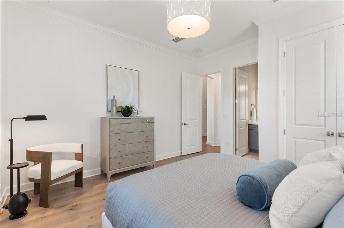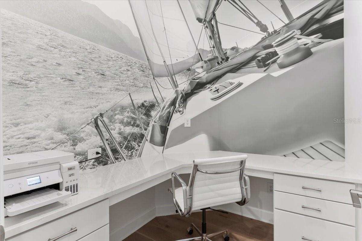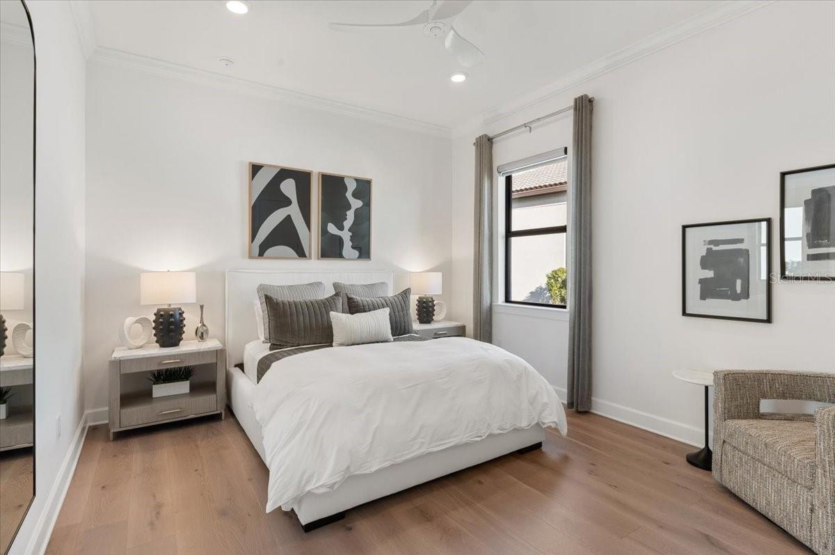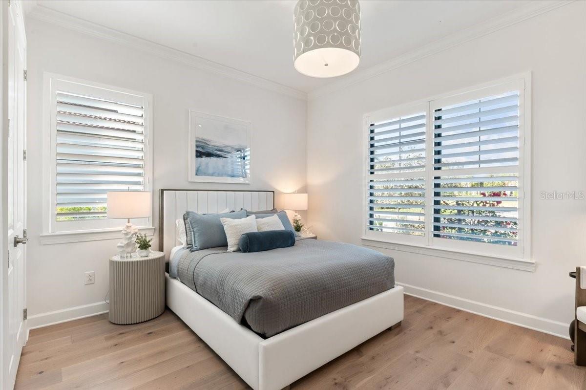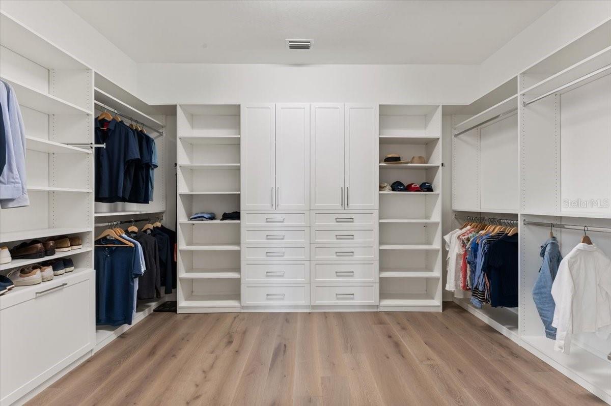 An extraordinary expression of lakeside luxury, this impeccably fully upgraded residence is perfectly positioned along one of the largest lakes in the highly sought-after community of Shoreview at Waterside. Fully upgraded with nothing left to be desired, this home offers four bedrooms, three full baths, two half baths, and a versatile flex room all one level. Upon entering, you will be welcomed by a captivating water view and rich wood flooring that flows throughout the main living spaces. The gourmet kitchen is expertly suited for entertaining with double ovens, quartz countertops, an oversized island with seating, reverse osmosis system, a walk-in pantry, a gas cooktop, and a custom tile backsplash. The great room impresses with soaring ceilings and a custom built-in TV wall with fireplace. Integrated Sonos speakers throughout the home create the perfect ambiance as upgraded 10-foot sliders open seamlessly to the outdoor retreat. Unwind in the resort-style pool and spa while taking in expansive water views and coveted southwest exposure. The entertaining space continues with an extended lanai, natural stone pavers, a convenient pool bath, and a fully equipped outdoor kitchen featuring a Coyote grill, side burner, beverage refrigerator, and sink. The owner's retreat serves as a private sanctuary, highlighted by tray ceilings, motorized blinds, and a spacious sitting area. The adjoining primary bath offers a large soaking tub, a custom tile feature wall, and an expansive custom closet. Three separate guest suites--one with a private en-suite bath--provide comfortable accommodations for family and visitors. A dedicated flex space near the kitchen, complete with a wet bar, offers versatility and is ideal for a home office, bonus room or dining room. This home offers added peace of mind with impact windows, a security system, and exterior cameras. The two-and-a-half-car garage features epoxy flooring, an electric vehicle charger, built-in shelving, and dedicated golf-cart parking. Additional highlights include a designer powder room with upgraded tile, built-in wine wall, enhanced landscaping, easement for a dock, a widened driveway and custom closet systems throughout. Shoreview at Waterside Lakewood Ranch is a highly-sought-after community that features resort-style amenities such as a beach area, heated pool and spa, clubhouse, tennis and pickleball courts, and a state-of-the-art fitness center. This home is in close proximity to Waterside Place - Lakewood Ranch's newest town center and the only waterfront retail and lifestyle destination in Sarasota. HOA includes all landscaping.