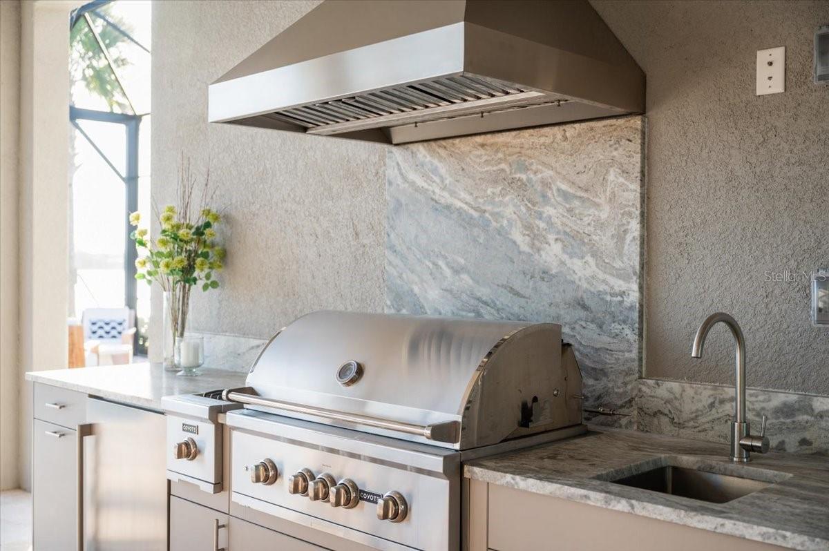 Exterior: Lighting, Outdoor Kitchen, Rain Gutters, Sidewalk, Sliding Doors