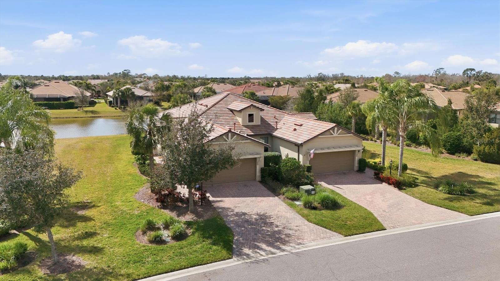 Wake up to water views in this beautiful paired villa in Del Webb at Lakewood Ranch. Enjoy the convenient access at the end of the cul-de-sac to the path leading directly to the clubhouse and resort-style amenities. Offered furnished, this residence is well maintained and has 2 bedrooms plus a spacious office adding flexibility for a 3rd bedroom. Designed with an open-concept layout, the main living areas feature ceramic tile flooring and flow seamlessly toward the water. The kitchen has granite counters, a bar and a pantry. The primary bedroom has water views and an en-suite bathroom with dual sinks, shower, walk-in and linen closets, and a water closet. The second bedroom has a large walk-in closet and is adjacent to the second bathroom. The inside laundry room has plenty of storage and hosts a utility sink. Enjoy quiet mornings on the cozy screened lanai overlooking the water before heading out to enjoy your new lifestyle in the premier 55+ pet friendly community of Del Webb. The amenities include an abundance of social activities, pools, a restaurant, live music, tennis, pickleball, bocce ball, fitness center, and an impressive array of amenities designed for active living. Take advantage of peaceful common area walking trails set along scenic ponds and enjoy the ease of a golf cart friendly community. Endless opportunities to stay active and social, with everything you need to live well and stay engaged. Vibrant lifestyles just beyond your front door includes farmers markets, live music, boutique shopping, and waterfront dining. Easy access to I75, UTC Mall, Waterside, downtown Sarasota and Bradenton, Gulf Coast's award-winning beaches and medical facilities. This is Lakewood Ranch living, done beautifully.
