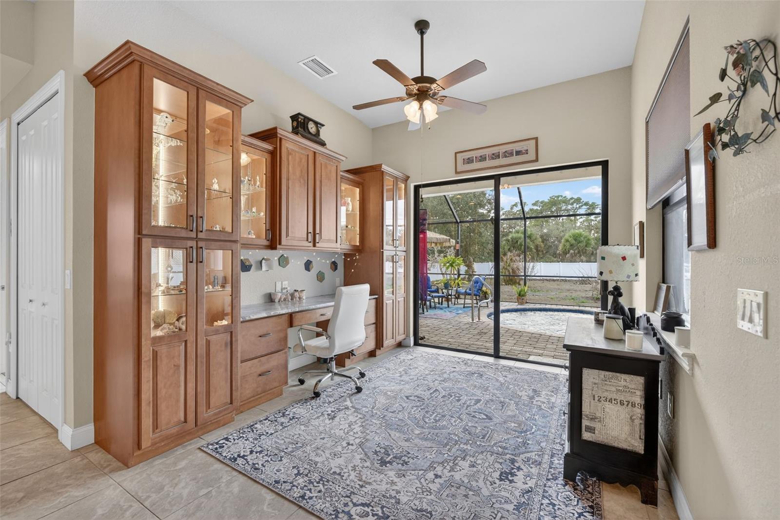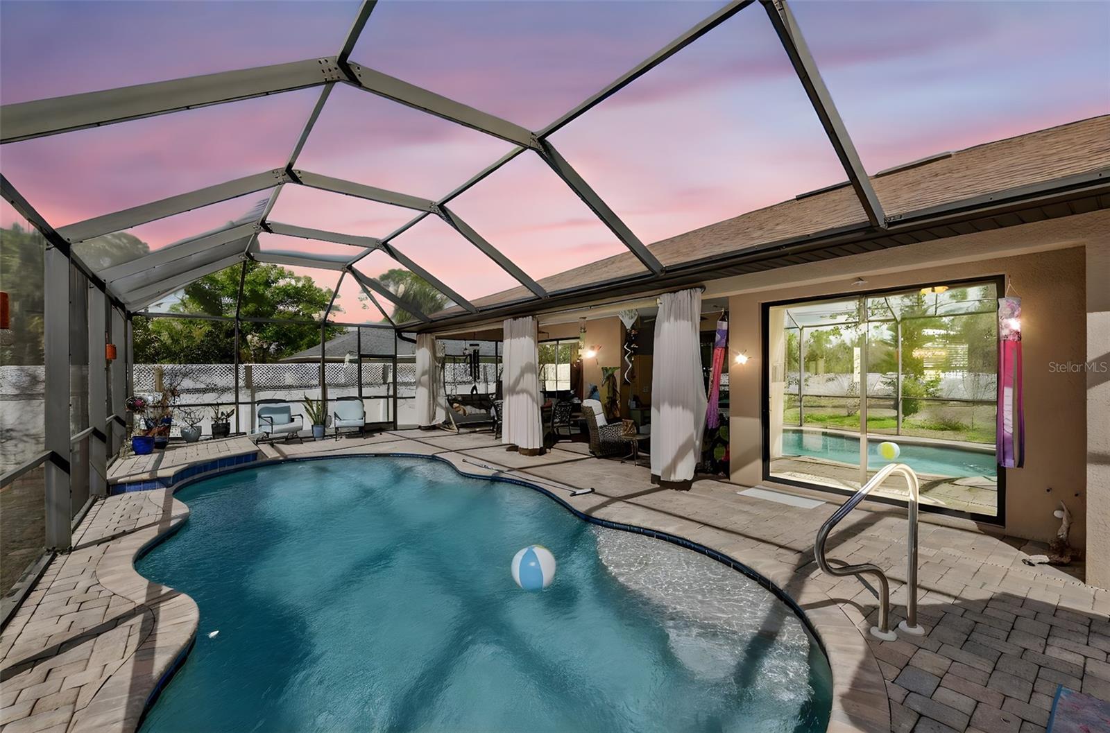 3,291sq ft residence on THREE continuous lots, 3bedrooms, 3full bathrooms, and oversized 3car garage (22'x30') This property boasts a privacy fence, screened cobblestone lanai, heated saltwater pool, (33' x14' x7') an open cobblestone patio, and a cobblestone driveway. The cut-glass double door screened entry welcomes you into this open space floor plan with split bedrooms. The interior showcases a living area accented by high double tray ceiling with concealed subdued lighting, formal dining room and foyer both featuring glistening chandeliers. An extensive chef-designed kitchen is equipped with solid wood cabinetry featuring a multitude of drawer space, granite counters, and granite breakfast bar lit by pendant lights. An office space adjoins the kitchen with a full wall of lit display shelves, desk, storage and filing cabinetry. Ceramic tile and hardwood flooring are utilized in the great room. Spacious Primary Suite accents are tray ceiling, crown molding, AND sound resistance for the light or daytime sleeper! Dual walk-in closets, separate vanities, private commode room, en-suite shower is equipped with a MULTITUDE of shower heads, Divine experience! SECONDARY Suite is roomy & bright, full en-suite bath, walk-in closet & accesses pool side. Third bedroom and guest bath finish this left wing. NO RESTRICTIONS build RV garage, or shop, garden shed, or she-shack! Back to back lots plus corner lot. Come & Appreciate! Custom built by HARBOR HOMES, extras are included.