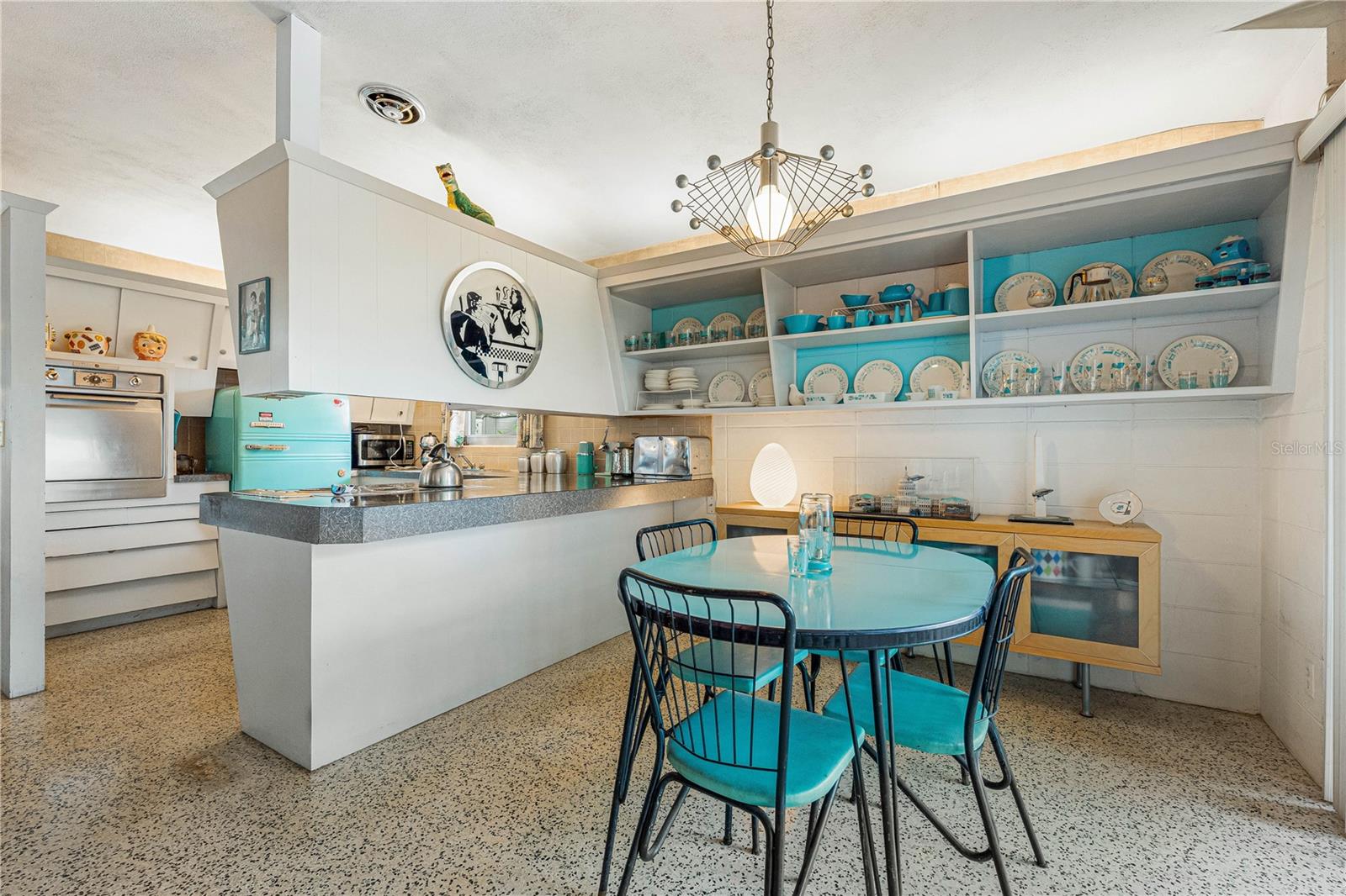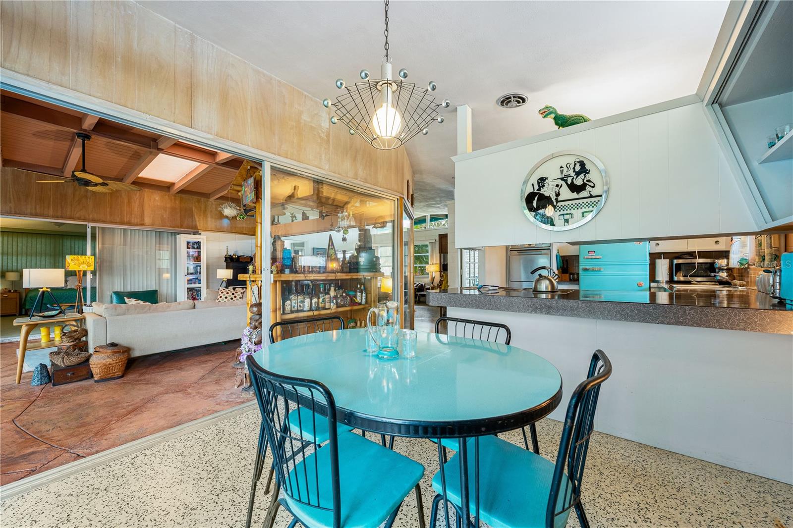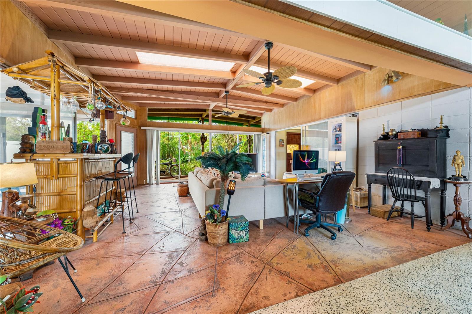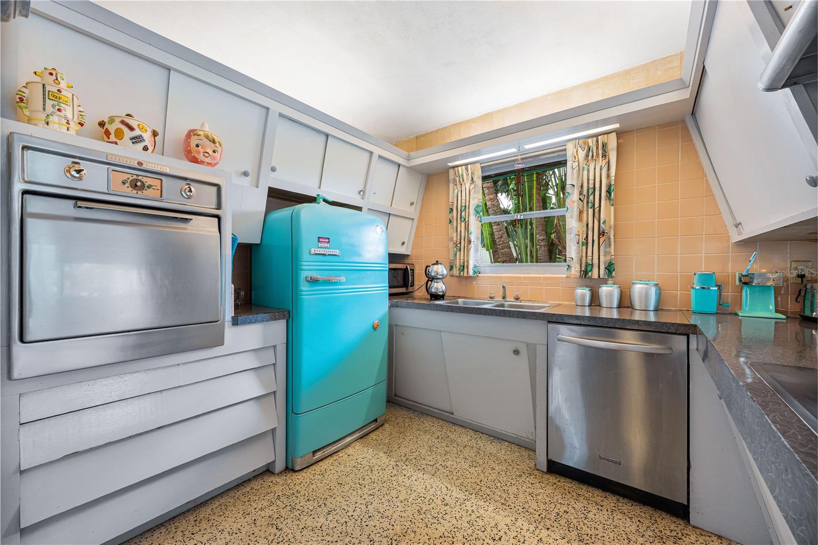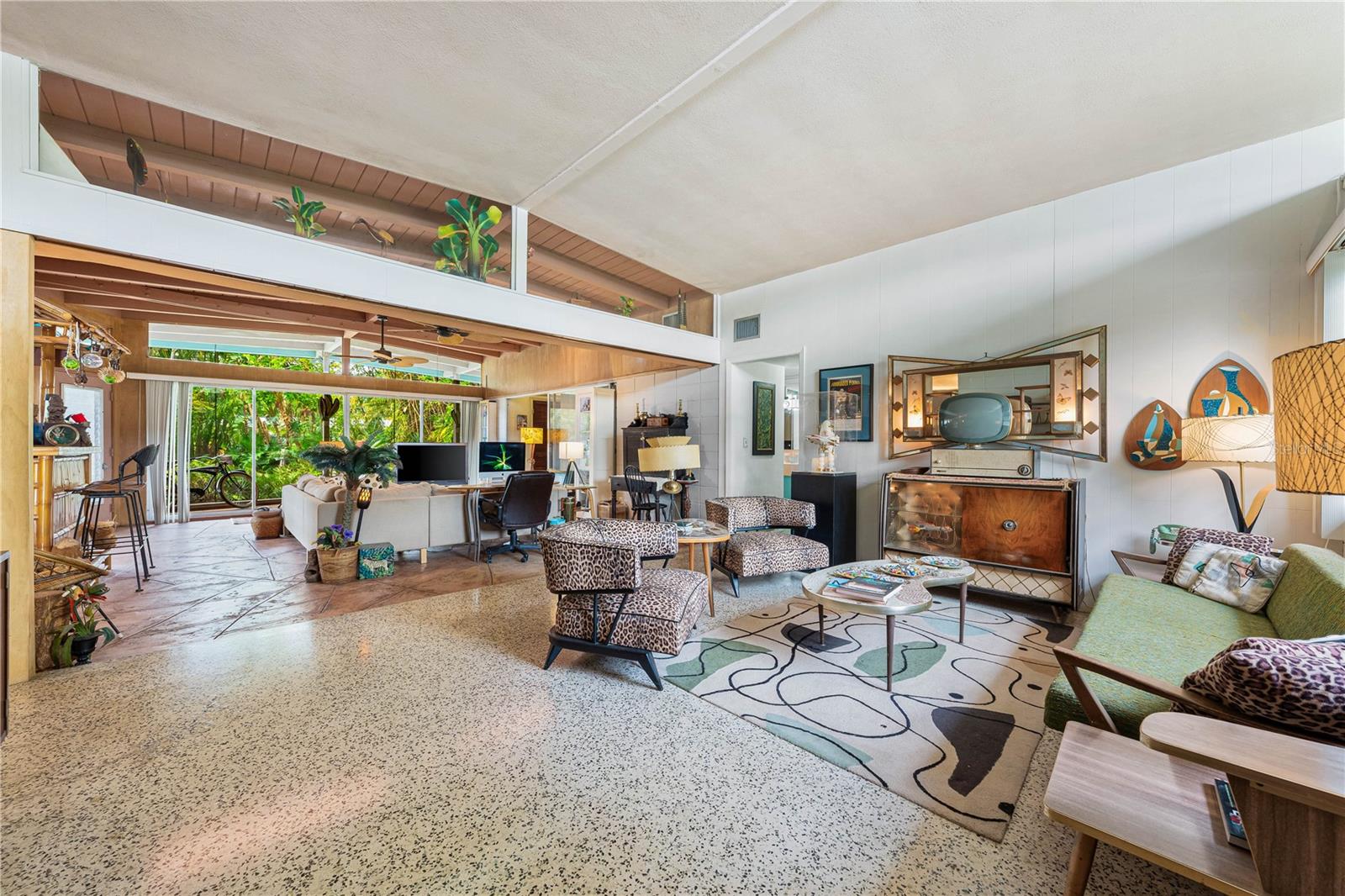 Presenting a time capsule home, perfectly frozen in 1956, when cars had tail-fins and Elvis was on the airwaves. The current owner of 25 years was once a museum conservator and used museum conservation techniques to bring this house back to its glory years. As you enter, feel embraced by the open feel of the space and the panoramic view of the backyard! The tropical foliage in the backyard allows for privacy and is the perfect backdrop for your outdoor activities. You will find details of the past throughout the home. Original matching grey and pink boomerang formica cover the kitchen countertops and the built in dresser countertops. The original angled kitchen cabinets are a rarity to see today! As your eyes focus in the center of the room, enjoy the cozy, oversized great room. Notice the high ceilings with original ceiling beams! In the primary bathroom, a unique "L" shaped vanity with Jack & Jill sinks maximizes the space with the shower and toilet privately tucked behind the vanity. Every room has clerestory windows allowing natural light throughout the home. Under the carpeting and in areas of the home, you will find the original cuban green terrazzo. The 3rd guest bedroom ensuite has a wall of glass blocks and is perfect for an office/studio/craft room. This space has a separate side entrance and its own dedicated mini split AC system. You will find the gulf beaches just a short trip away! 4.7 miles to Siesta Key Beach, 6.5 miles to Lido Beach. Sarasota Memorial Hospital is 1.8 miles away and the new mixed development coming soon in The Westfield Siesta Key Mall is walking distance. Bring your 45's and enjoy 1956 again! This home has survived 70 years with no water intrusion!!
