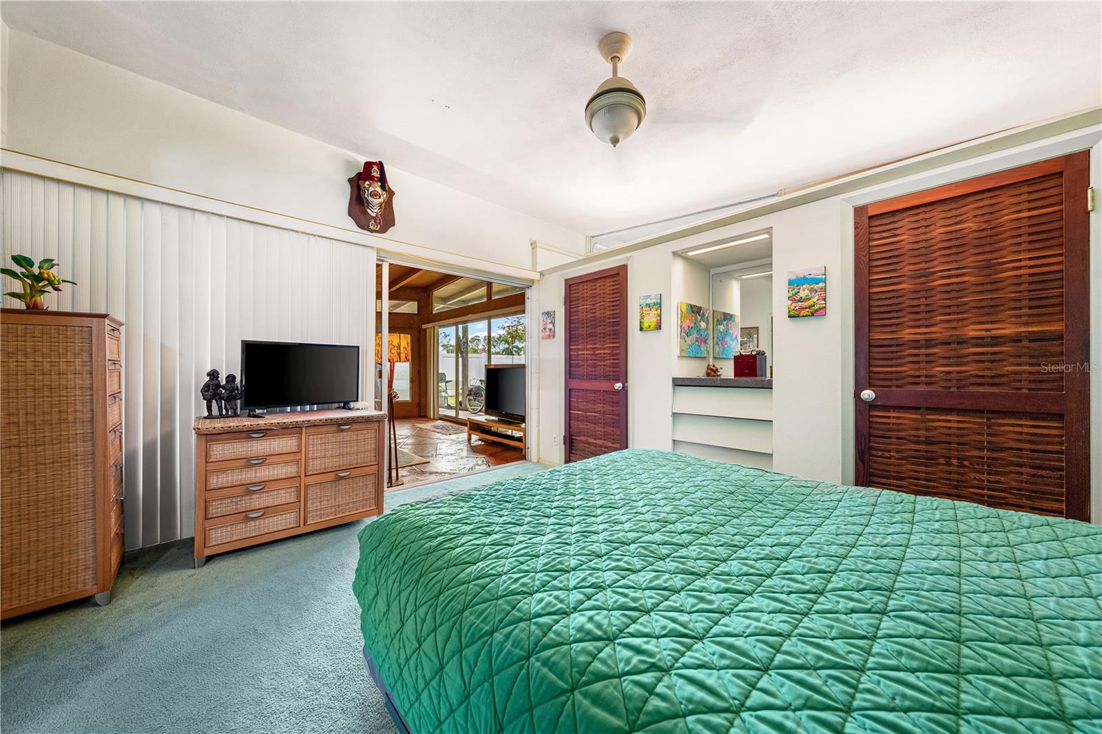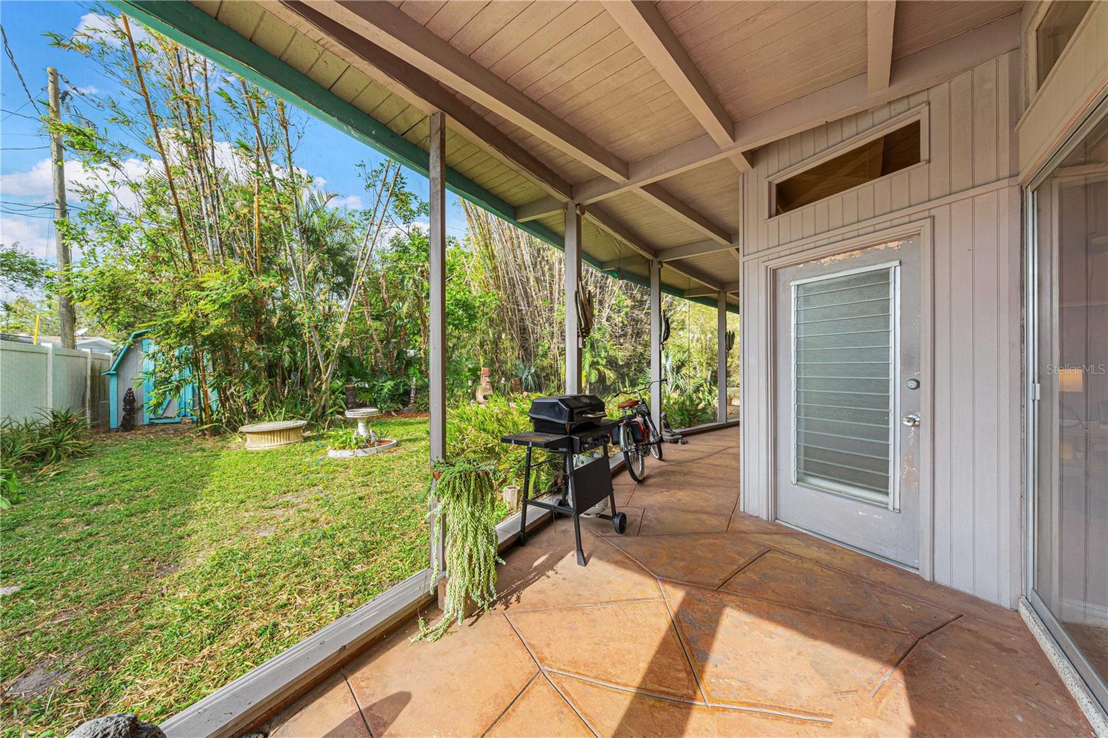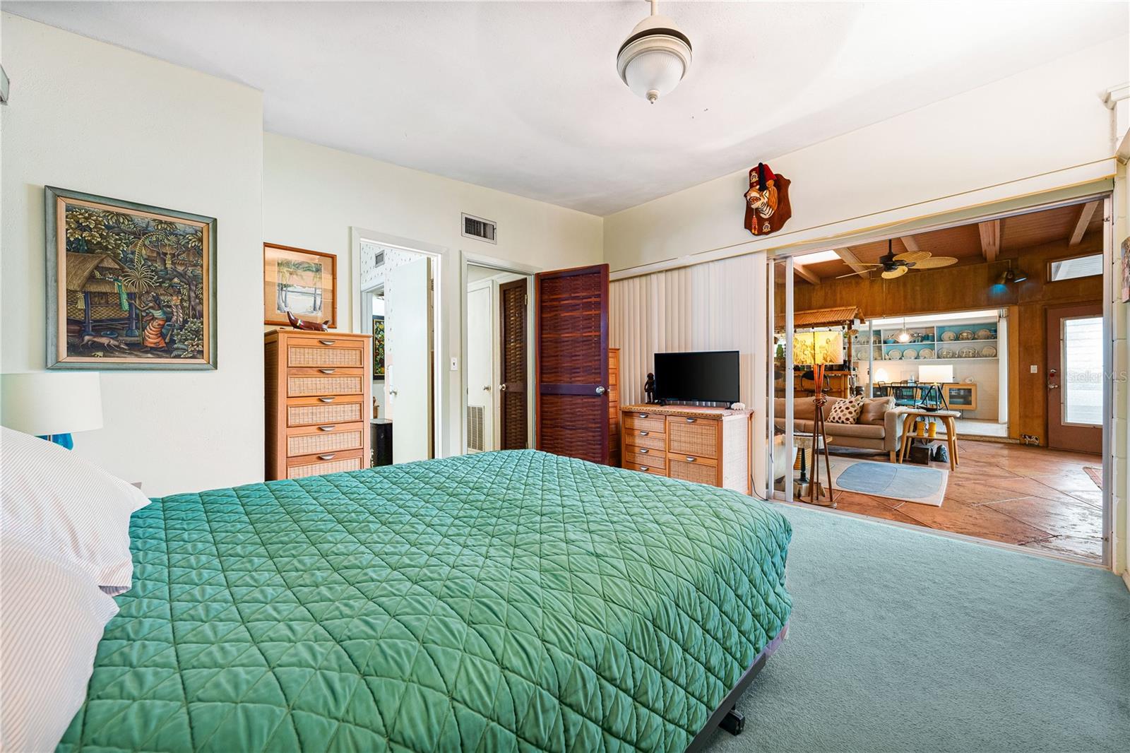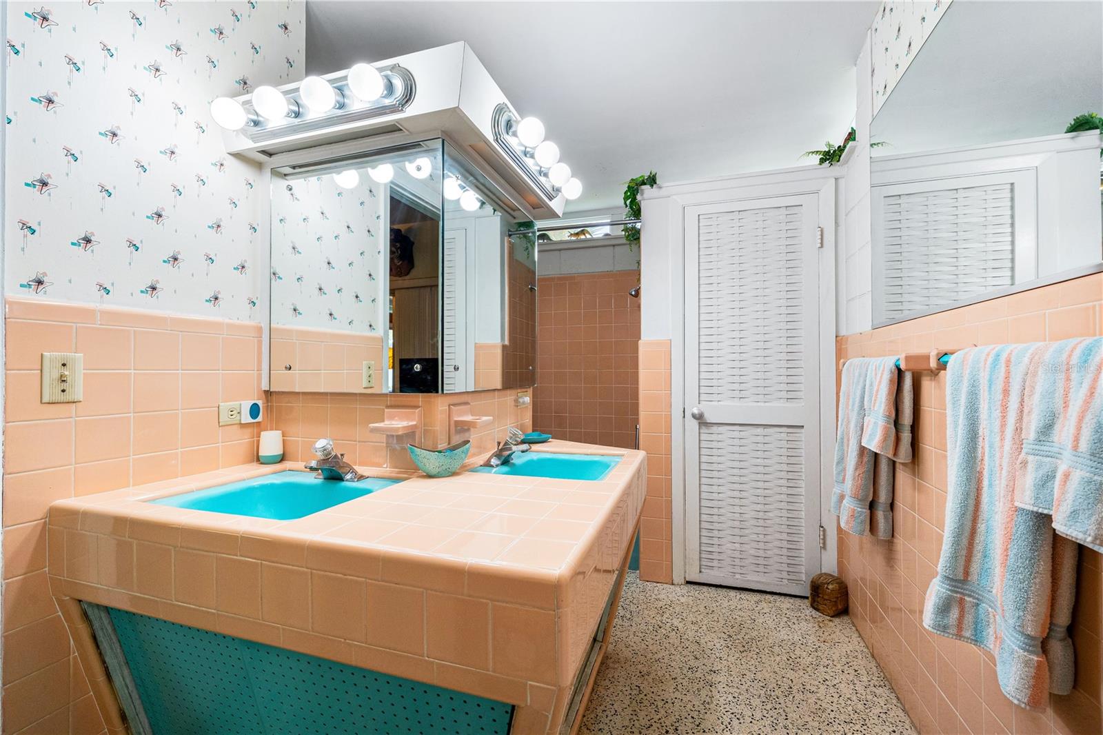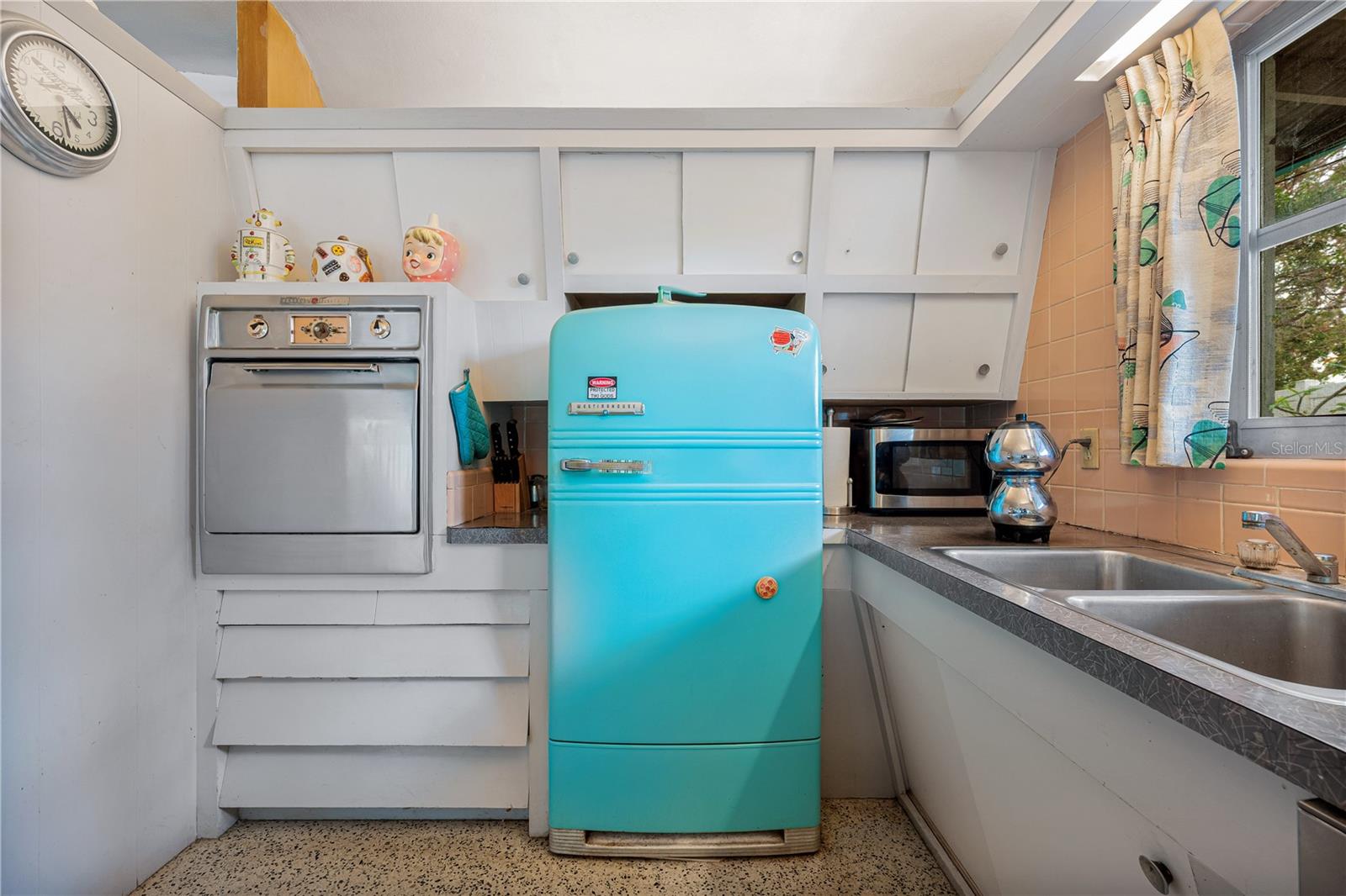Presenting a time capsule home, perfectly frozen in 1956, when cars had tail-fins and Elvis was on the airwaves. The current owner of 25 years was once a museum conservator and used museum conservation techniques to bring this house back to its glory years. As you enter, feel embraced by the open feel of the space and the panoramic view of the backyard! The tropical foliage in the backyard allows for privacy and is the perfect backdrop for your outdoor activities. You will find details of the past throughout the home. Original matching grey and pink boomerang formica cover the kitchen countertops and the built in dresser countertops. The original angled kitchen cabinets are a rarity to see today! As your eyes focus in the center of the room, enjoy the cozy, oversized great room. Notice the high ceilings with original ceiling beams! In the primary bathroom, a unique "L" shaped vanity with Jack & Jill sinks maximizes the space with the shower and toilet privately tucked behind the vanity. Every room has clerestory windows allowing natural light throughout the home. Under the carpeting and in areas of the home, you will find the original cuban green terrazzo. The 3rd guest bedroom ensuite has a wall of glass blocks and is perfect for an office/studio/craft room. This space has a separate side entrance and its own dedicated mini split AC system. You will find the gulf beaches just a short trip away! 4.7 miles to Siesta Key Beach, 6.5 miles to Lido Beach. Sarasota Memorial Hospital is 1.8 miles away and the new mixed development coming soon in The Westfield Siesta Key Mall is walking distance. Bring your 45's and enjoy 1956 again! This home has survived 70 years with no water intrusion!!