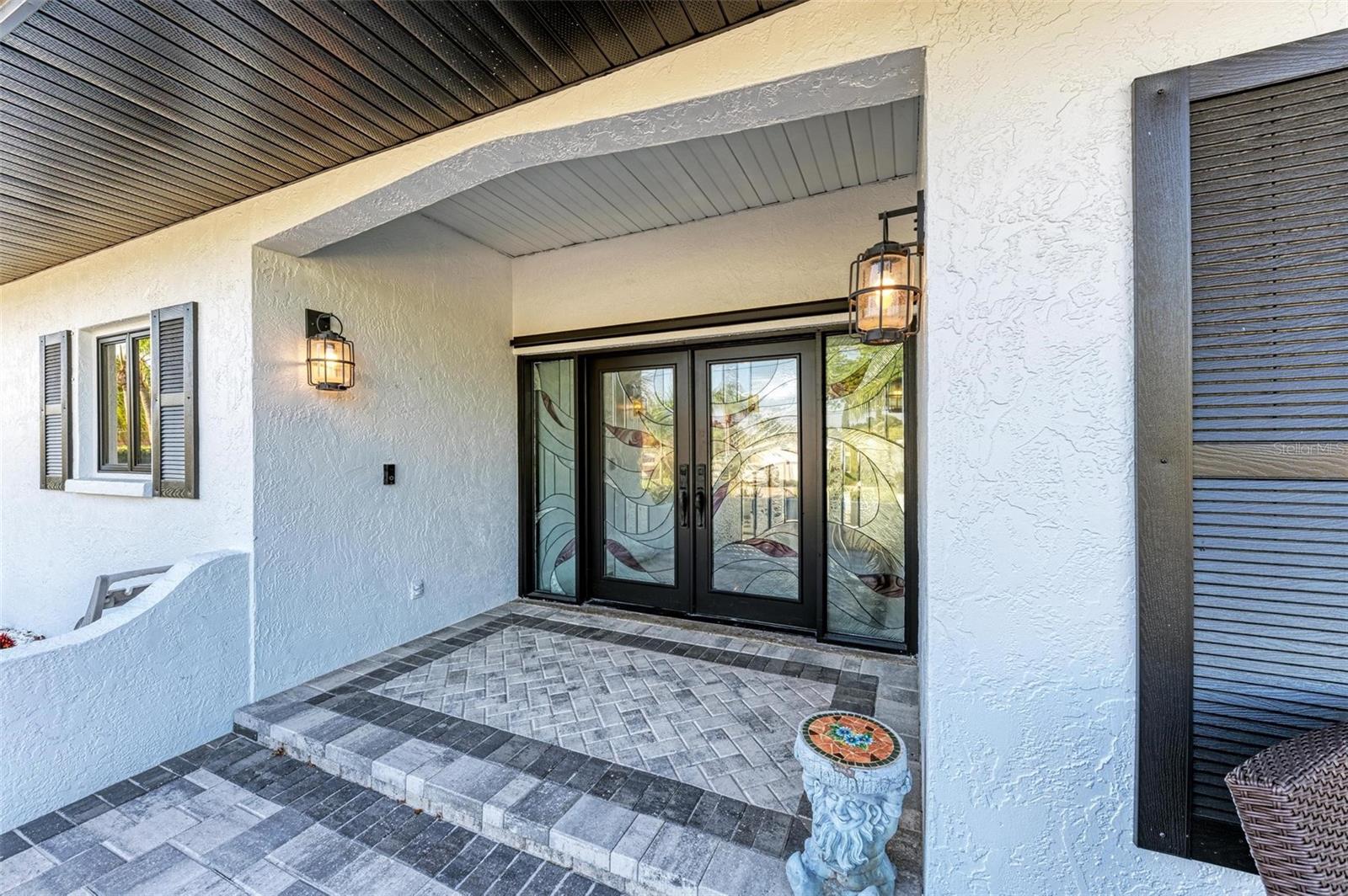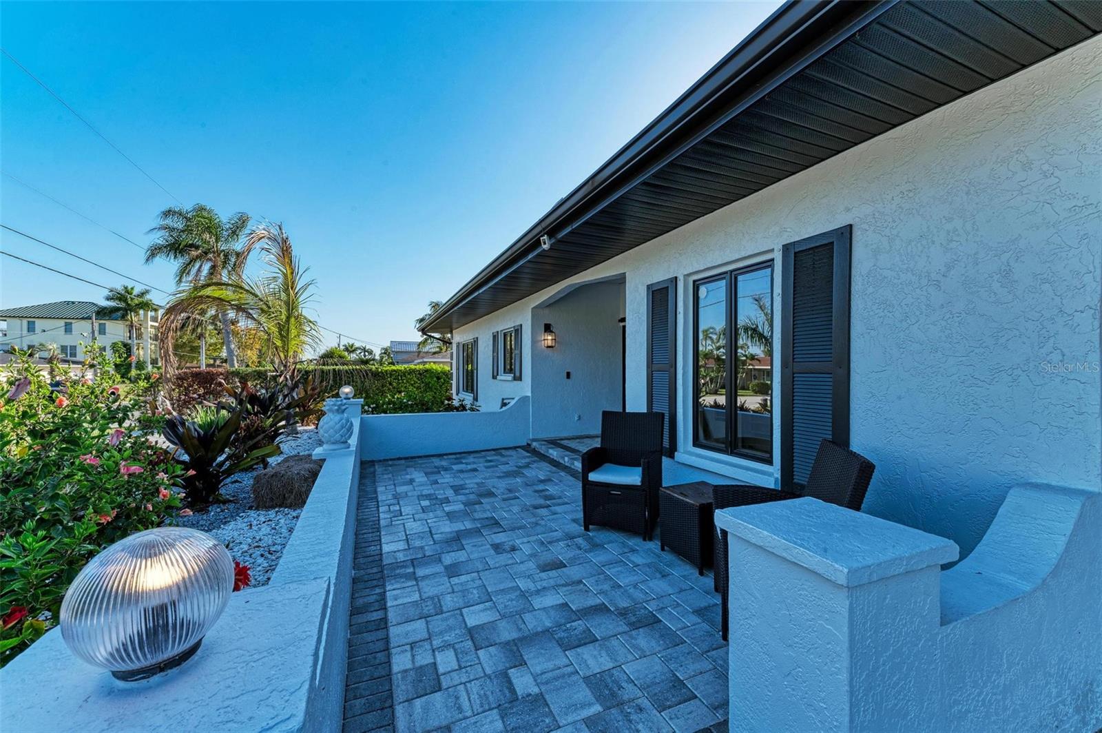 Exterior: Hurricane Shutters, Lighting, Private Mailbox, Rain Gutters, Sidewalk, Sliding Doors