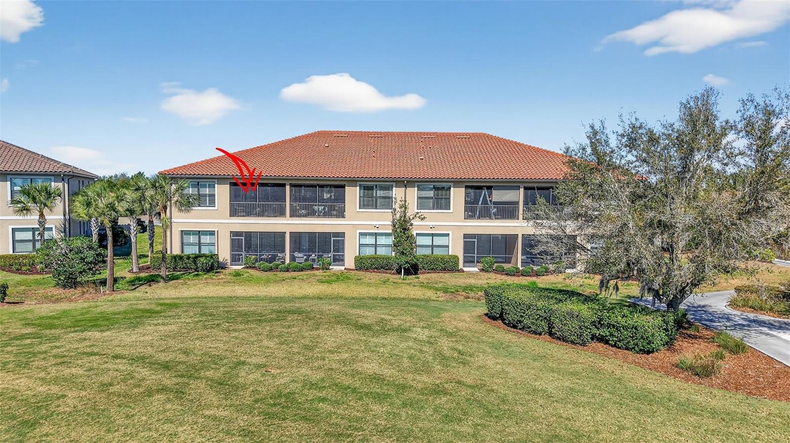 FULL GOLF MEMBERSHIP INCLUDED. PREMIER END UNIT CONDOMINIUM ON THE GOLF COURSE. WALK TO RESORT AMENITIES. An exceptional offering within the gates of Esplanade Golf & Country Club, this beautifully positioned corner residence captures tranquil views of the 10th hole and pond while offering effortless walkability to the clubhouse, resort pool, culinary center, fitness facilities, golf and tennis. Vaulted ceilings and an expansive open-concept design create a light-filled interior with impressive volume and flow. The coveted corner placement enhances privacy and natural light, while plantation shutters, custom designer lighting, and upgraded ceiling fans provide refined architectural detail throughout. The kitchen is thoughtfully appointed with updated appliances including a newer dishwasher and microwave, seamlessly connecting to the living and dining areas--ideal for elegant entertaining or relaxed evenings overlooking the fairway. Step onto the tranquil private lanai and enjoy sweeping golf and water vistas, a peaceful backdrop for morning coffee or sunset gatherings. The primary suite serves as a serene retreat featuring dual granite vanities and custom-fitted closet organizers. Newer carpeting in both bedrooms enhances comfort, and the versatile den offers the perfect space for a private office or refined guest accommodations. Modern enhancements include keyless entry, integrated security system, smart thermostat, and an HVAC system equipped with ultraviolet purification technology designed to promote cleaner air quality and year-round comfort. A rare opportunity where golf, luxury, and walkable resort living converge in one of Lakewood Ranch's most desirable communities. Esplanade offers a wide array of amenities and activities such as an 18-hole championship golf course, two resort pools, hot tubs, resistance pool, pickleball, tennis, bocce ball, two fitness centers, exercise classes, two dog parks, firepit, spa/salon, an on-site lifestyle director, social events, and various clubs plus a Tiki bar. The state-of-the-art Culinary Center offers residents several dining options such as the Barrel House as well as catering services, wine tastings, and special events. There are cameras on the present. Some furniture and furnishings are negotiable.