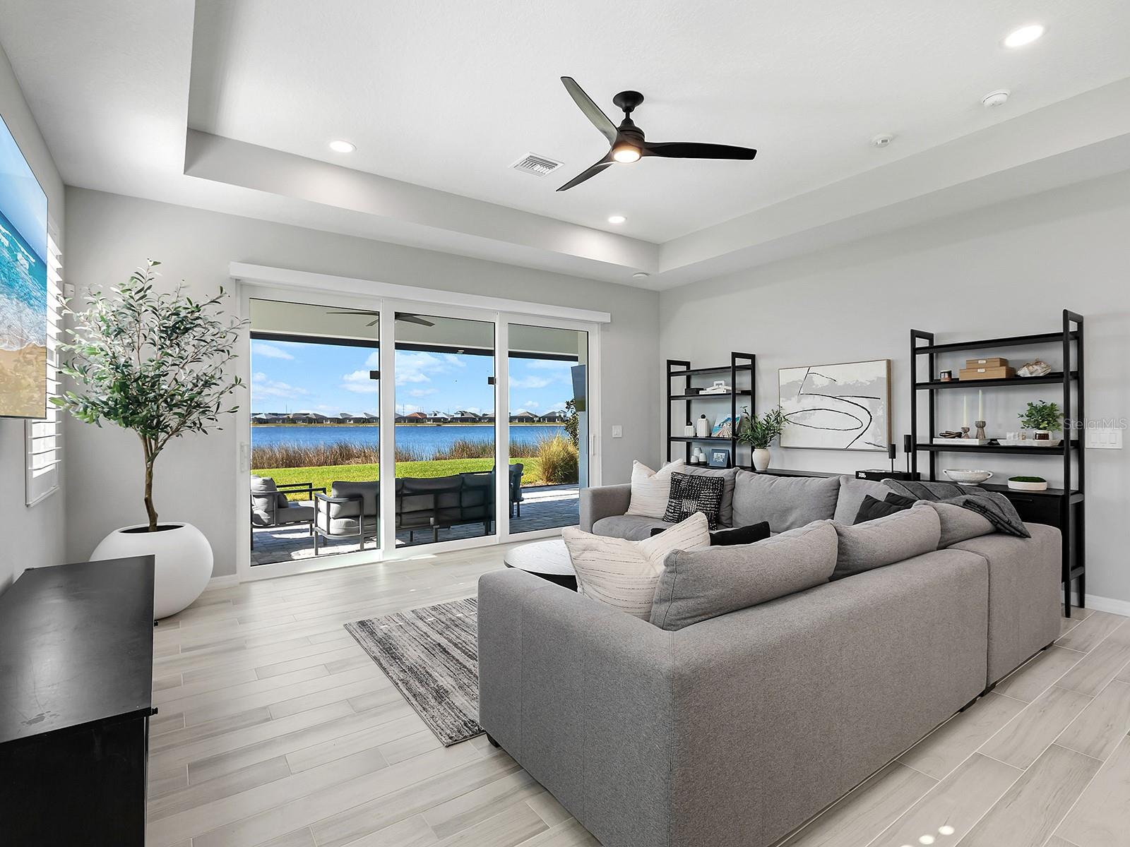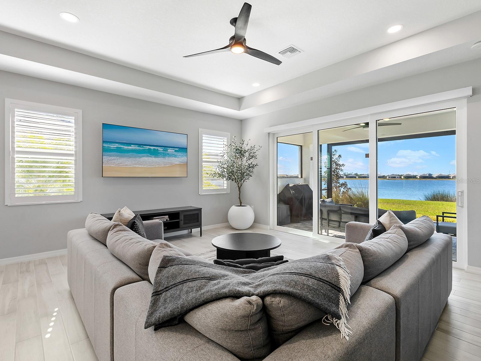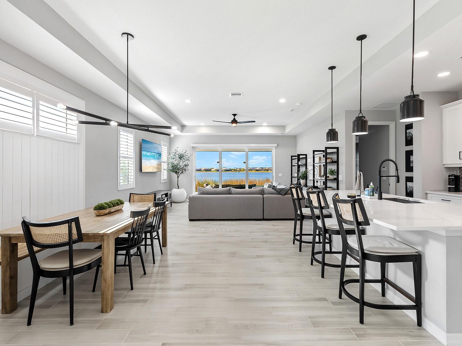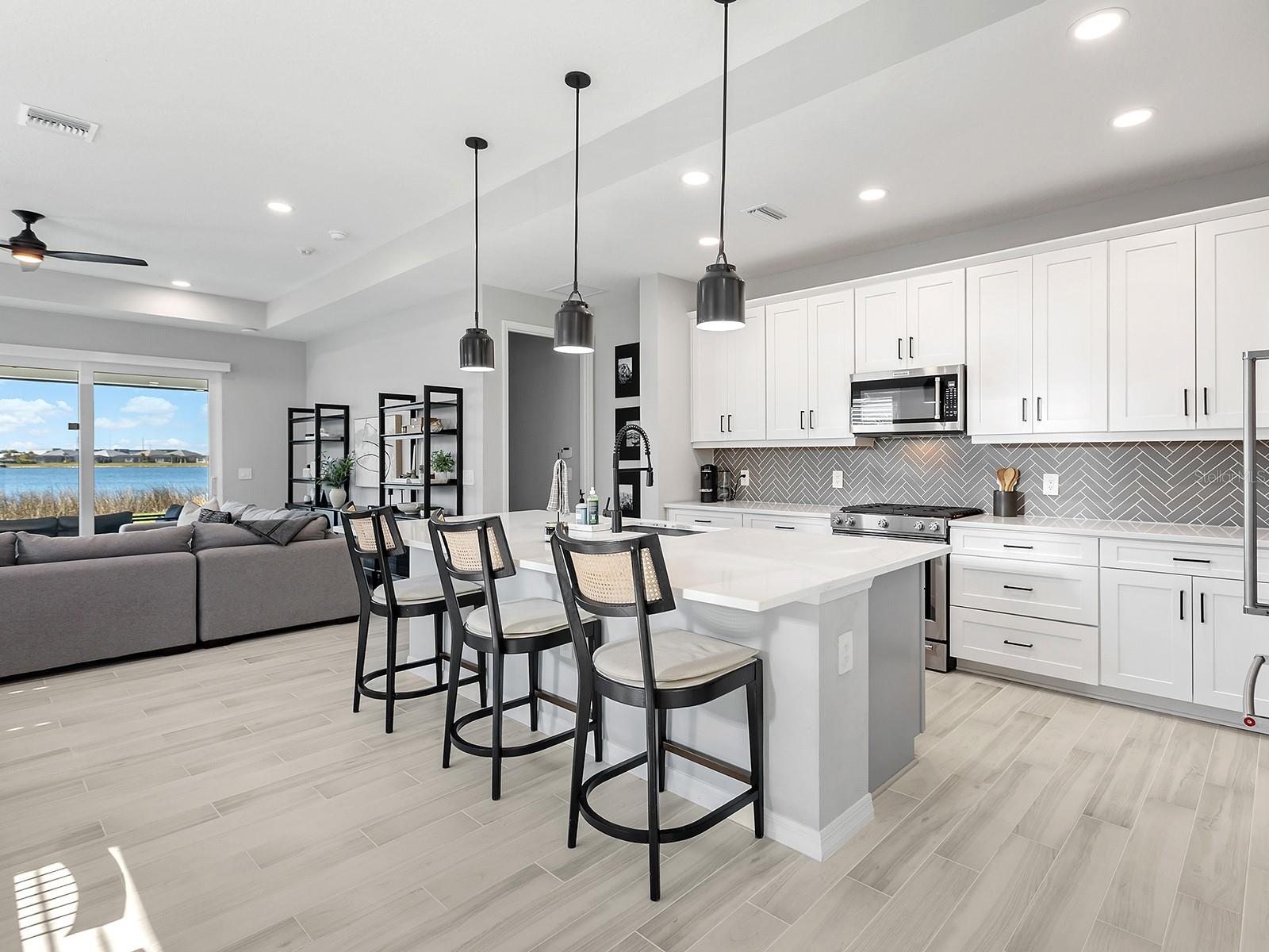 Experience elevated waterfront living in Lakehouse Cove at Waterside, one of the sought-after luxury enclaves in Lakewood Ranch. Positioned on a private southwest-facing lake-view lot along Lake Ibis, this exceptional coastal-contemporary residence captures sweeping water views and breathtaking sunsets in a serene natural setting. Completed in 2023 by Homes by Towne, the popular Skiff floor plan offers 2,157 square feet of thoughtfully designed living space with an open-concept layout that seamlessly connects elegant interiors to stunning outdoor scenery. The home features three bedrooms, two full baths, a dedicated den/office with custom doors, and expansive living areas ideal for comfort and entertaining. Refined craftsmanship and upscale finishes shine throughout. Impact windows, sliders, and doors provide peace of mind and energy efficiency, while tray ceilings, plantation shutters, custom upgrades and a hard-wired security system reflect exceptional attention to detail. The beautifully appointed kitchen anchors the home with quartz countertops, soft-close cabinetry, an oversized island with seating, a herringbone backsplash, and premium KitchenAid stainless steel appliances. A built-in dining banquette with shiplap detailing adds charm and hidden storage. The spacious great room opens to an extended screened lanai where panoramic lake and wildlife views create a setting for morning coffee or evening cocktails. An outdoor kitchen rough-in offers future entertaining potential. The owner's suite is a tranquil waterfront retreat with lake views, a generous walk-in closet, and a spa-inspired bath featuring dual quartz vanities and a floor-to-ceiling tiled walk-in shower. Two additional bedrooms provide comfort and ample closet space, while the secondary bath mirrors the home's elevated style. The laundry room includes custom cabinetry and a utility sink, and the two-car garage offers abundant storage. Lakehouse Cove residents enjoy a resort-style pool and spa, fitness center, clubhouse, kayak launches, pickleball courts, dog parks and a vibrant social calendar. Nearby Waterside Place offers lakefront dining, shopping, farmers markets and outdoor concerts. Lakewood Ranch Main Street, UTC Mall, Sarasota's arts and dining, and Gulf Coast beaches including Siesta Key, Lido Beach, and Anna Maria Island are all within easy reach, along with Sarasota-Bradenton International Airport. More than a home, this is a lifestyle defined by waterfront beauty, modern luxury and convenience. Sellers are open to a sale-leaseback through September 2026. Schedule your private tour today.