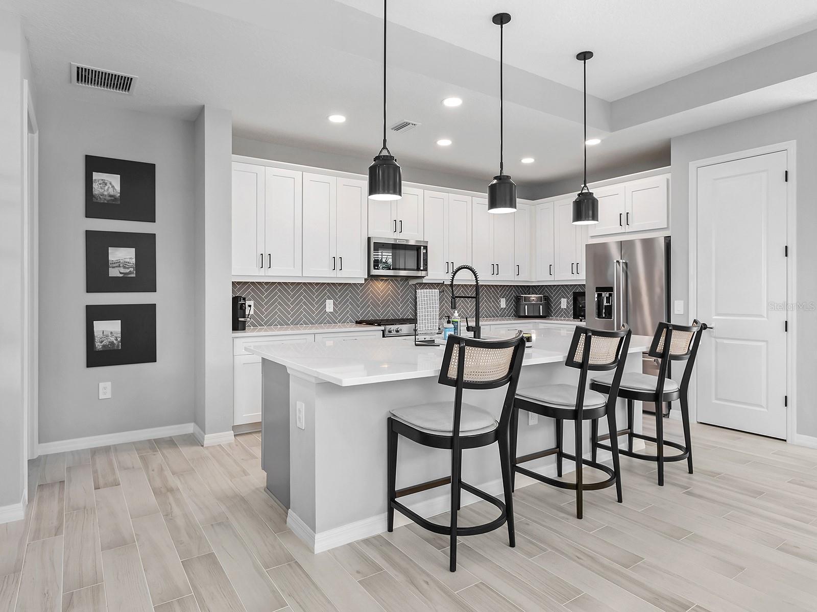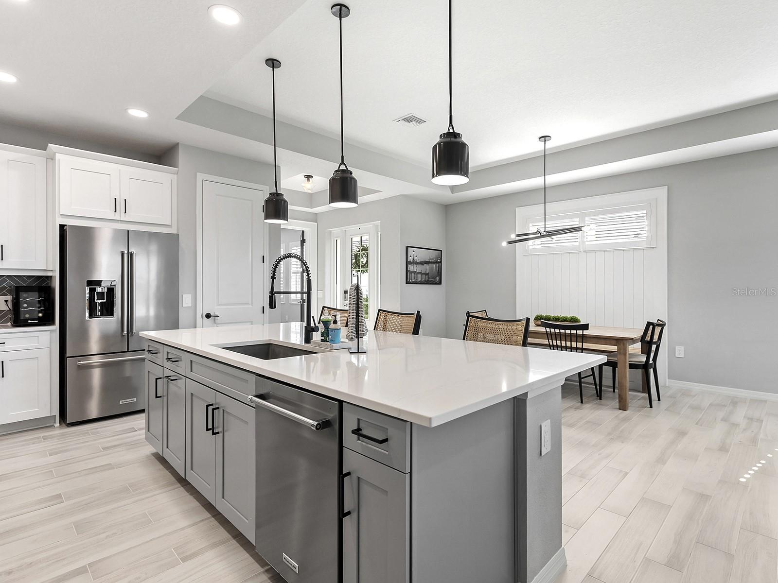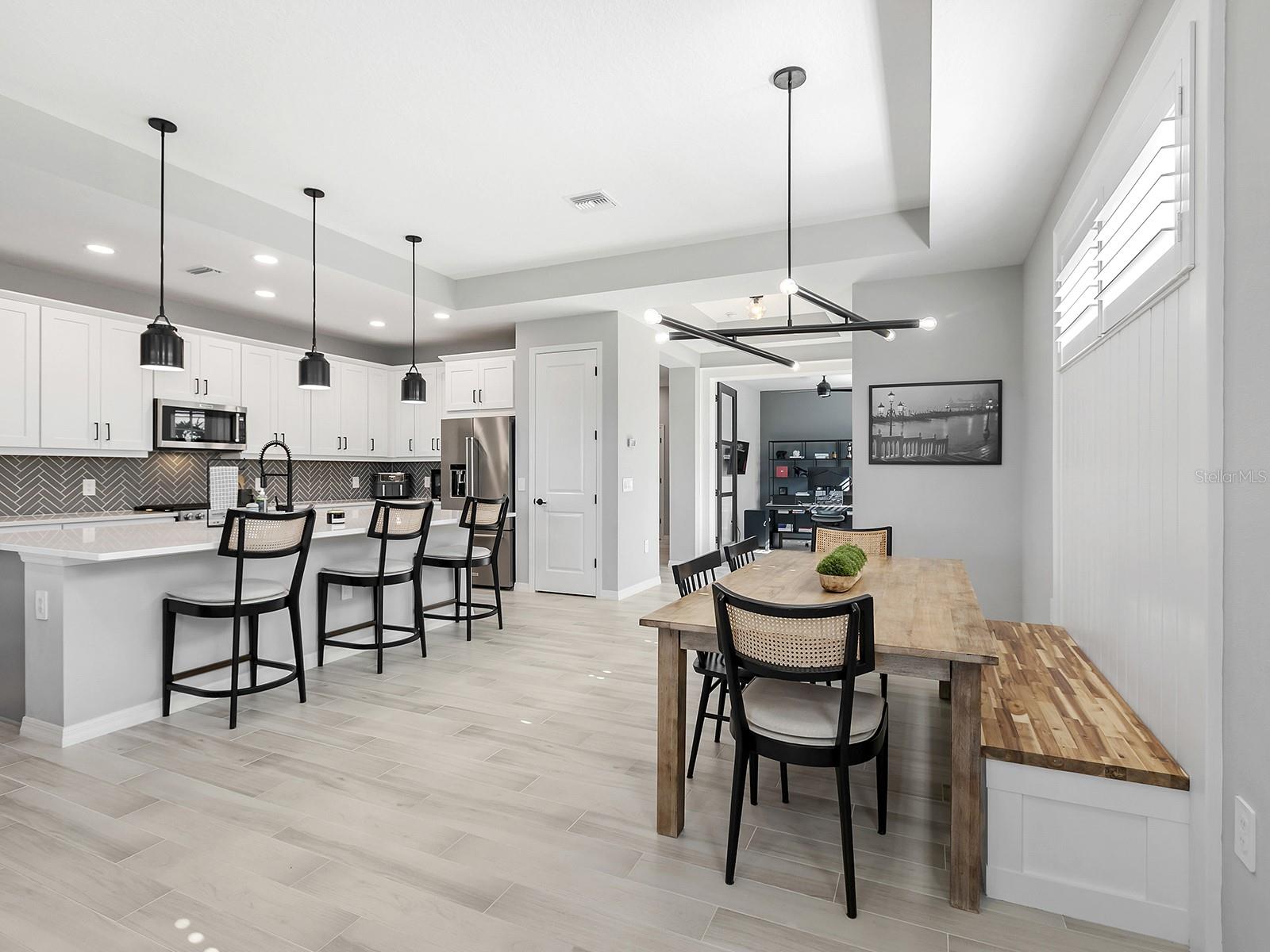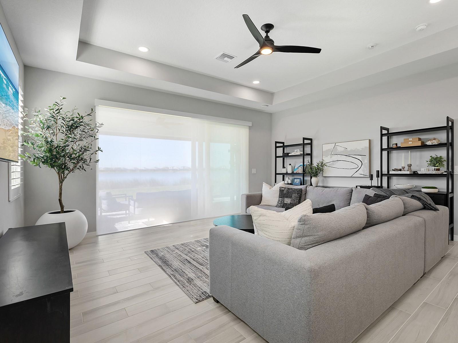 Experience elevated waterfront living in Lakehouse Cove at Waterside, one of the sought-after luxury enclaves in Lakewood Ranch. Positioned on a private southwest-facing lake-view lot along Lake Ibis, this exceptional coastal-contemporary residence captures sweeping water views and breathtaking sunsets in a serene natural setting. Completed in 2023 by Homes by Towne, the popular Skiff floor plan offers 2,157 square feet of thoughtfully designed living space with an open-concept layout that seamlessly connects elegant interiors to stunning outdoor scenery. The home features three bedrooms, two full baths, a dedicated den/office with custom doors, and expansive living areas ideal for comfort and entertaining. Refined craftsmanship and upscale finishes shine throughout. Impact windows, sliders, and doors provide peace of mind and energy efficiency, while tray ceilings, plantation shutters, custom upgrades and a hard-wired security system reflect exceptional attention to detail. The beautifully appointed kitchen anchors the home with quartz countertops, soft-close cabinetry, an oversized island with seating, a herringbone backsplash, and premium KitchenAid stainless steel appliances. A built-in dining banquette with shiplap detailing adds charm and hidden storage. The spacious great room opens to an extended screened lanai where panoramic lake and wildlife views create a setting for morning coffee or evening cocktails. An outdoor kitchen rough-in offers future entertaining potential. The owner's suite is a tranquil waterfront retreat with lake views, a generous walk-in closet, and a spa-inspired bath featuring dual quartz vanities and a floor-to-ceiling tiled walk-in shower. Two additional bedrooms provide comfort and ample closet space, while the secondary bath mirrors the home's elevated style. The laundry room includes custom cabinetry and a utility sink, and the two-car garage offers abundant storage. Lakehouse Cove residents enjoy a resort-style pool and spa, fitness center, clubhouse, kayak launches, pickleball courts, dog parks and a vibrant social calendar. Nearby Waterside Place offers lakefront dining, shopping, farmers markets and outdoor concerts. Lakewood Ranch Main Street, UTC Mall, Sarasota's arts and dining, and Gulf Coast beaches including Siesta Key, Lido Beach, and Anna Maria Island are all within easy reach, along with Sarasota-Bradenton International Airport. More than a home, this is a lifestyle defined by waterfront beauty, modern luxury and convenience. Sellers are open to a sale-leaseback through September 2026. Schedule your private tour today.