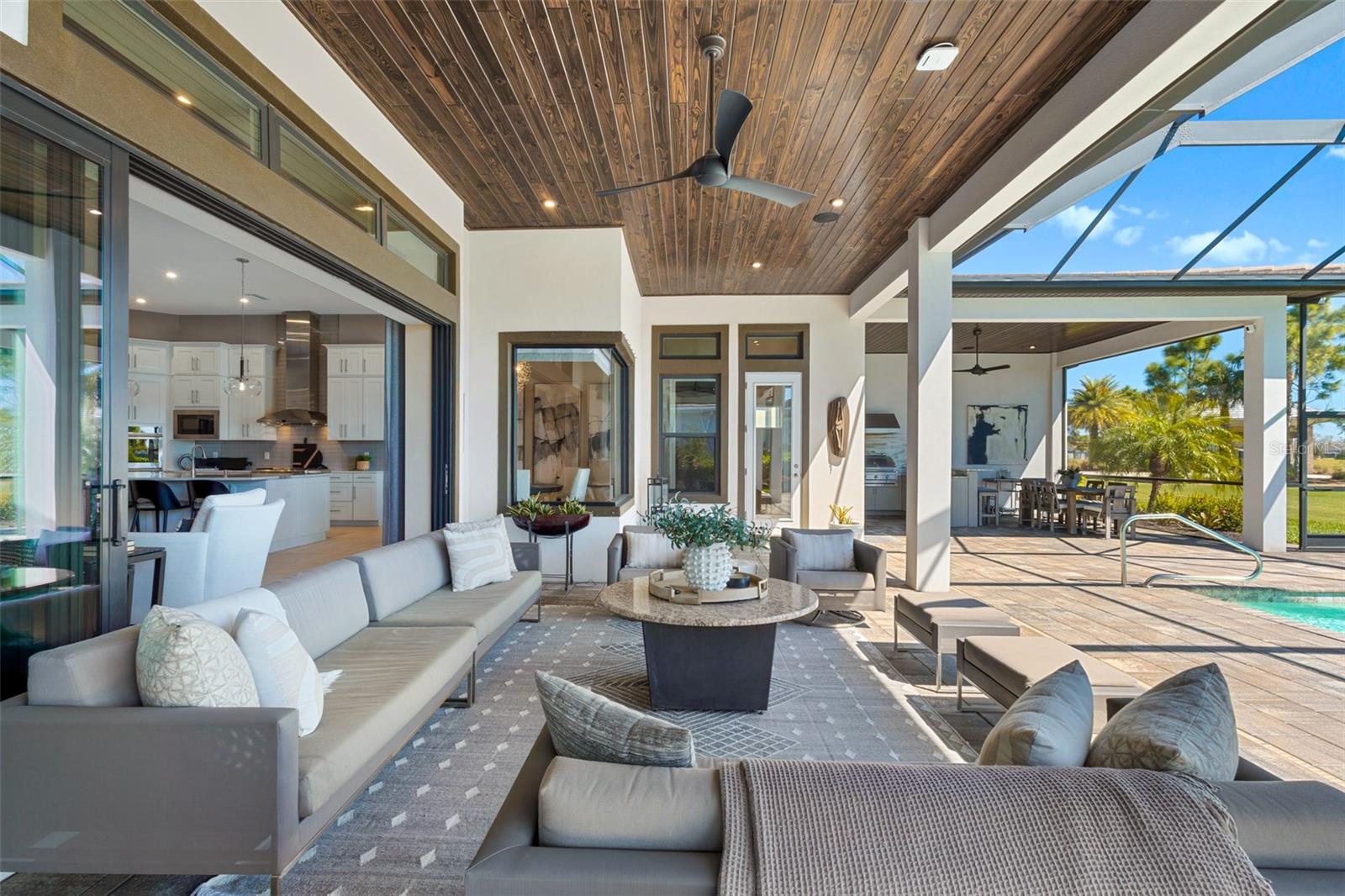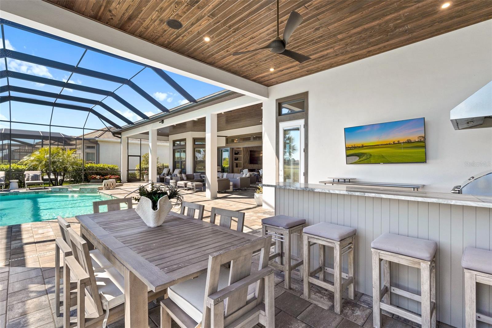 Now offered in the highly desirable Esplanade at Azario in Lakewood Ranch, a Premier Gated, Resort-Style, Golf Course Community in the Lakewood Ranch area. This GOLF DEEDED Beacon model delivers luxury living with panoramic golf and water views. A West Indies inspired estate home features over 4,400+ sq ft under air, including 4 bedrooms, 4.5 baths, and a 1,120 sq ft upstairs bonus suite with private ensuite. One of the community's most sought-after and no-longer-available floor plans. From the moment you arrive, the home makes a statement with a courtyard-entry garage, paver driveway, lush tropical landscaping, and epoxy-finished 3-car garage with AC splitter. Inside, the residence showcases designer upgrades throughout, including a dramatic floor-to-ceiling stone feature wall with 86" LED TV and fireplace, custom built-ins, tray ceilings, 12' ceilings throughout main living, upgraded light fixtures and tile flooring, and an open-concept layout designed for modern luxury living. Impact-rated windows and doors, plus pocketing hurricane-rated sliding glass doors, seamlessly connect indoor and outdoor spaces. The chef's kitchen is both elevated and functional, featuring GE Monogram stainless steel appliances, Double convection wall ovens & microwave, Bosch 36" refrigerator + beverage refrigerator, oversized center island, Custom cabinetry with stacked uppers, statement stainless vent hood, Tile backsplash, Expanded casual dining area, and Custom walk-in pantry. This plan also features formal dining area and separate study/den. The primary suite is a private retreat overlooking the pool and golf course, complete with custom dual closets and a spa-style bath featuring spacious vanity and cabinets, soaking tub, and an oversized walk-in shower. A desirable split floor plan includes two additional main-level ensuites with one fully ADA compliant. Upstairs, enjoy a spacious bonus/game room with wet bar (sink, microwave, dishwasher, beverage fridge), oversized half bath, and a fourth private ensuite, ideal for guests or multi-generational living. Outdoor living is exceptional. The expansive screened lanai with clear-view screening captures both long lake and golf course views. Highlights include oversized heated saltwater pool, 8-person spa with spillovers, decorative copper water bowls, outdoor kitchen with stainless gas grill & hood, sink, beverage fridge, granite countertops & polymer cabinetry, and covered lanai areas with stained shiplap ceilings. Additional features include three-zone HVAC systems and whole-house generator. Residents of Esplanade at Azario enjoy world-class amenities, including 18-hole championship golf course, resort-style pool & Bahama Bar, Culinary Center with teaching kitchen, Full-service fitness center & spa, Tennis, pickleball & bocce, 24-hour gated security. This is luxury golf and waterfront living at its finest in Lakewood Ranch. Schedule your private showing and start living the good life - Azario lifestyle.