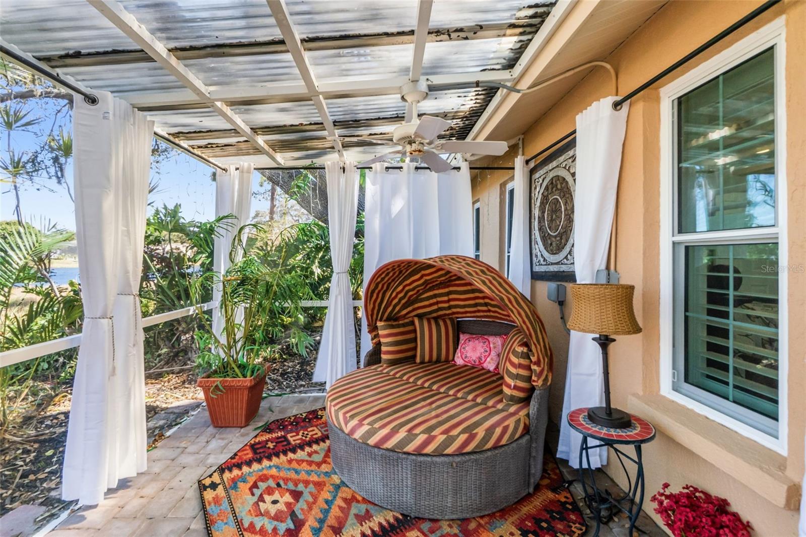 Exterior: Awning(s), Garden, Lighting, Rain Gutters, Sidewalk, Sliding Doors
