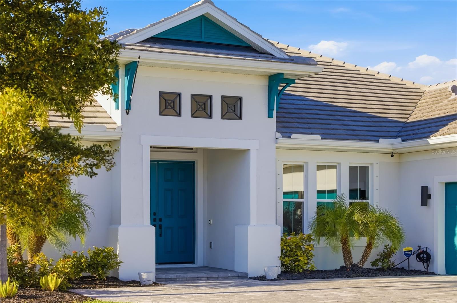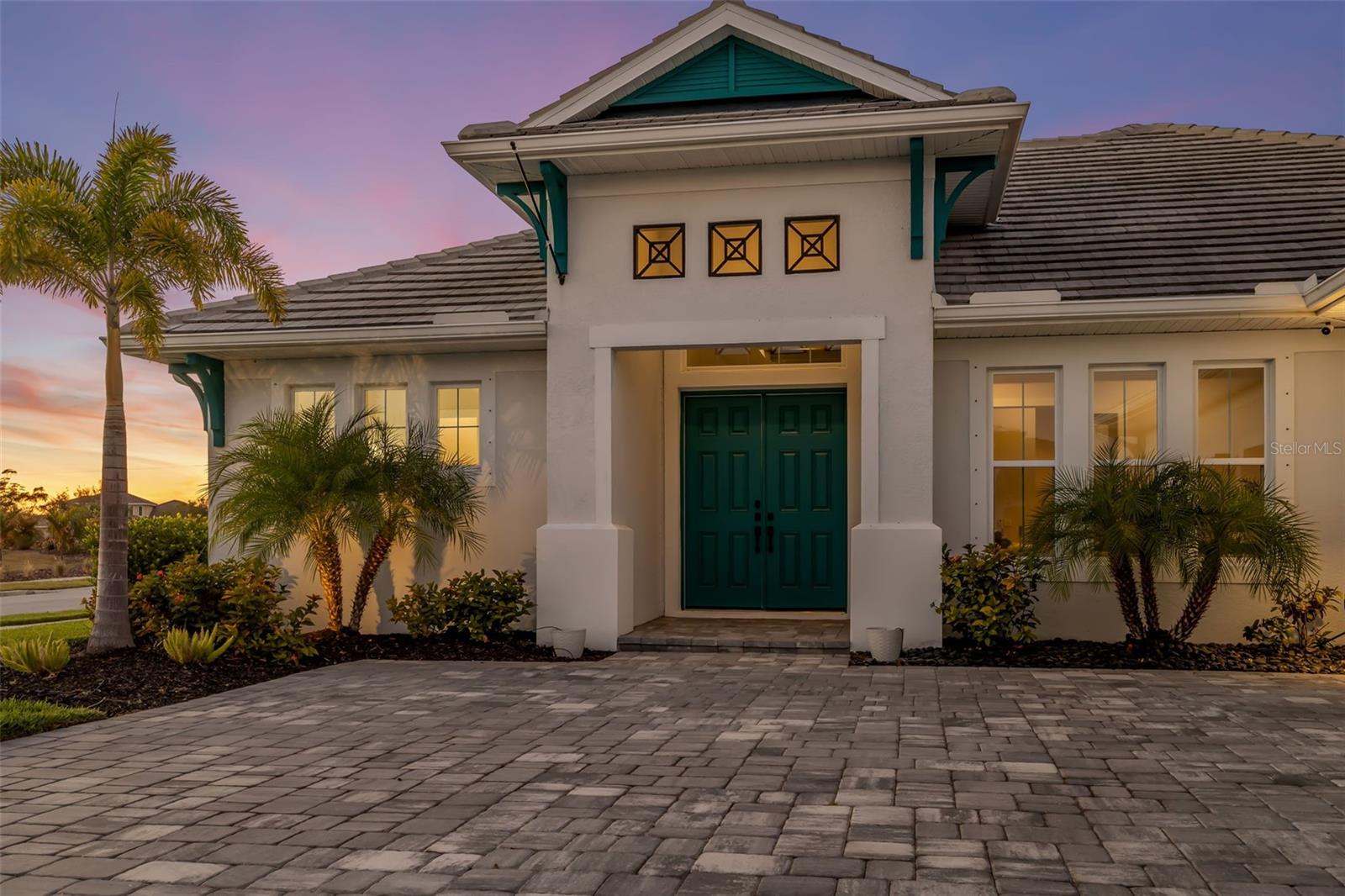 Exterior: Garden, Hurricane Shutters, Lighting, Sidewalk, Sliding Doors