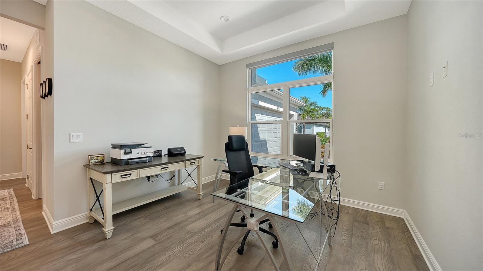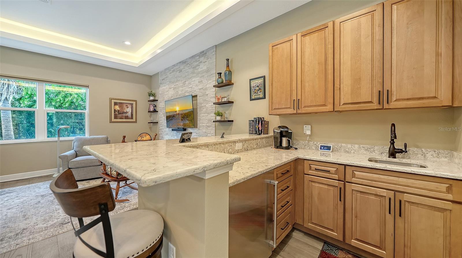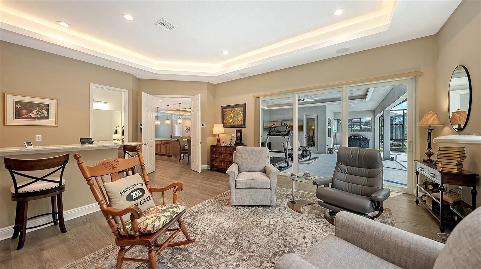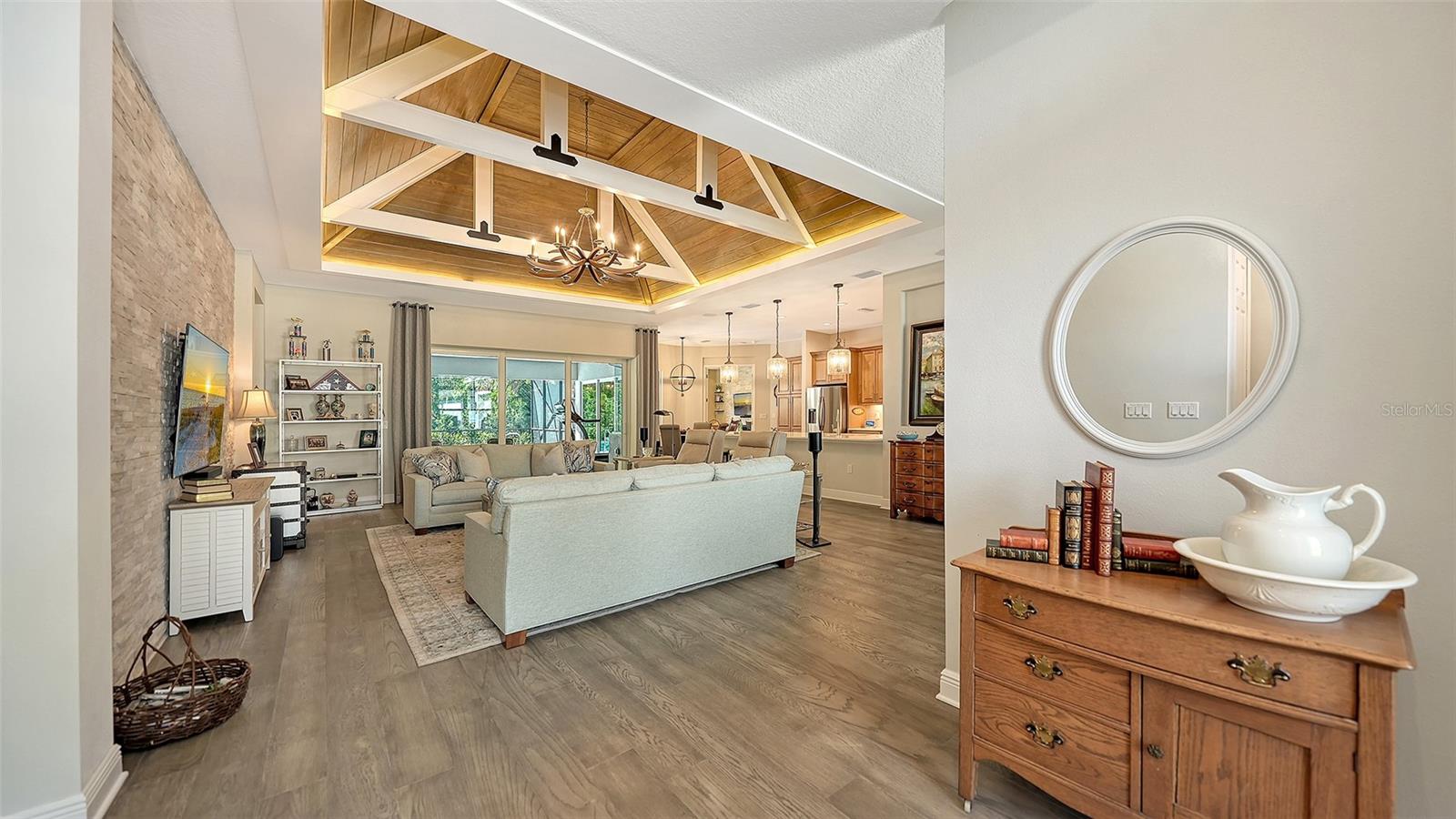 Located in the desirable Waverley neighborhood of Sarasota, this beautifully appointed Medallion Santa Maria floor plan offers the perfect blend of luxury, comfort, and functionality. This 3BR/3BA home features a screened pool with an expansive lanai enclosure overlooking a private wooded backdrop, along with a paver driveway and impressive curb appeal. Inside, the extended gourmet kitchen is designed for both everyday living and entertaining, showcasing solid wood cabinetry, a long center island, and a gas oven range fueled by a dedicated propane tank. The propane system also services the tankless water heaters, clothes dryer, fireplace, pool heater, and outdoor grill. Real wood floors run throughout the home, enhancing its warmth and timeless appeal. The spacious great room features a stunning farmhouse-style vaulted ceiling accented with tongue-and-groove planks, creating an open and airy gathering space. A separate bonus room includes a gas fireplace and wet bar, ideal for entertaining or relaxing. The primary suite offers generous proportions, an ensuite bath, and a walk-in closet with custom built-ins. Both garage bays are air-conditioned, and a whole-home generator provides added peace of mind. Conveniently located near dining, shopping, and everyday conveniences, with easy access to Siesta Key, Downtown Sarasota, and the UTC area, this home delivers exceptional Florida living in a premier Sarasota location.