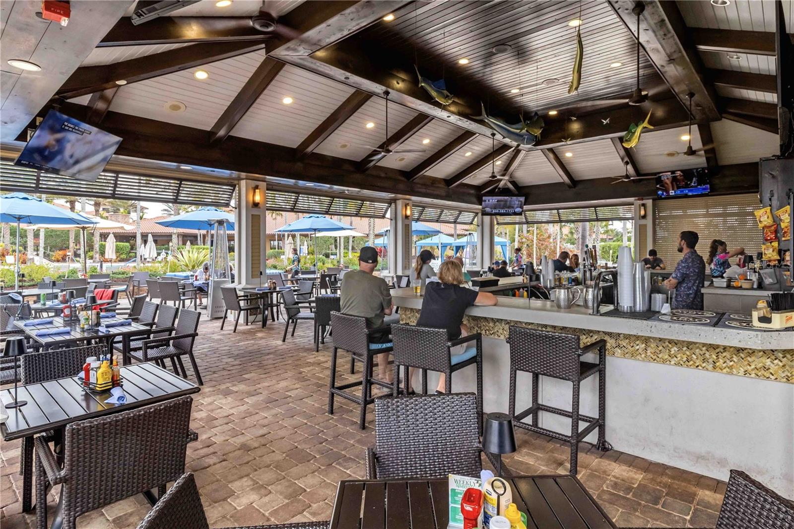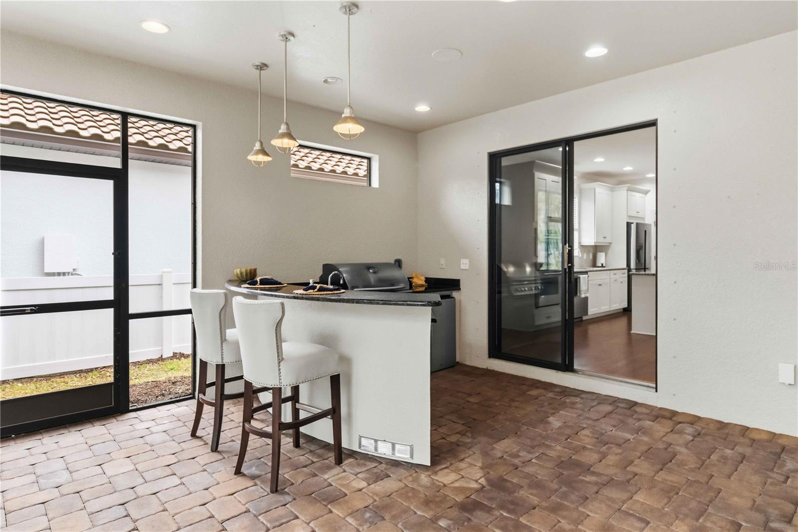 Exterior: Hurricane Shutters, Lighting, Outdoor Grill, Outdoor Kitchen, Sidewalk, Sliding Doors