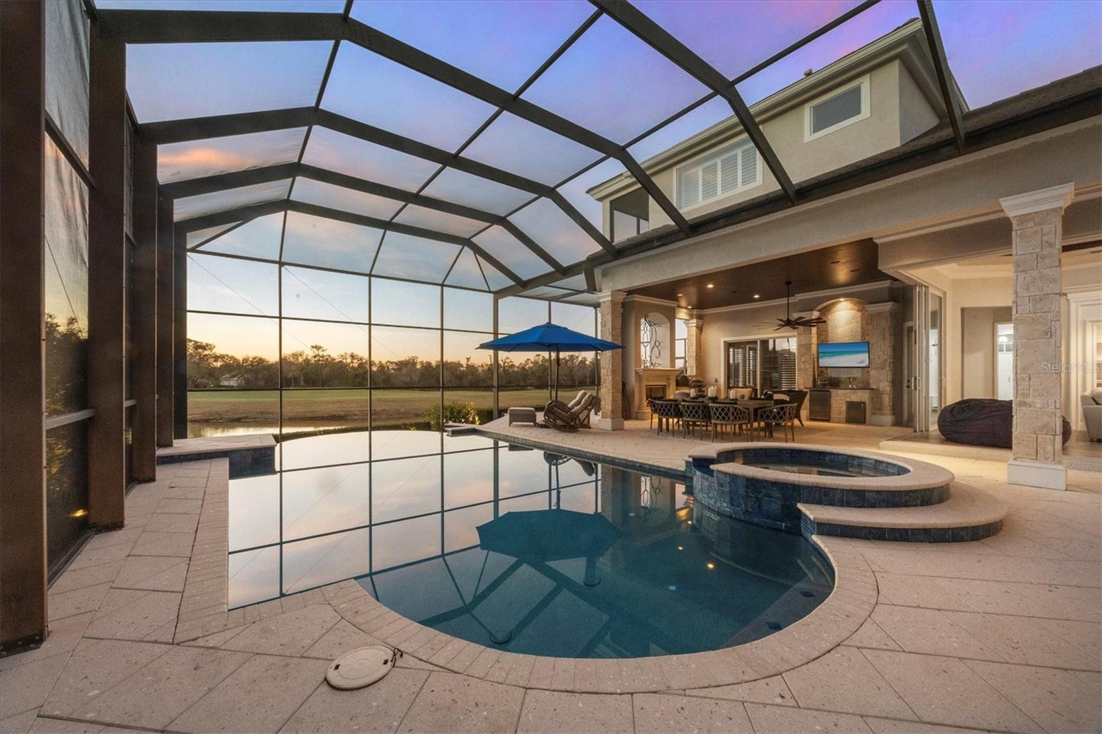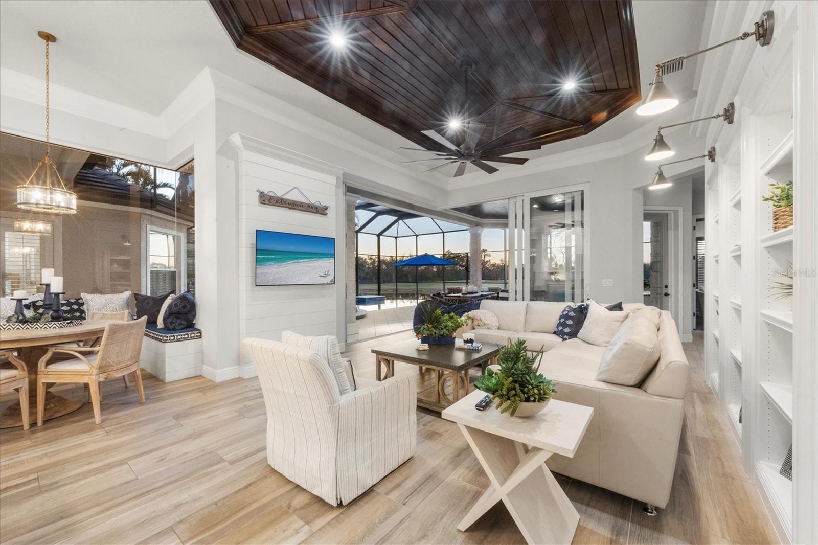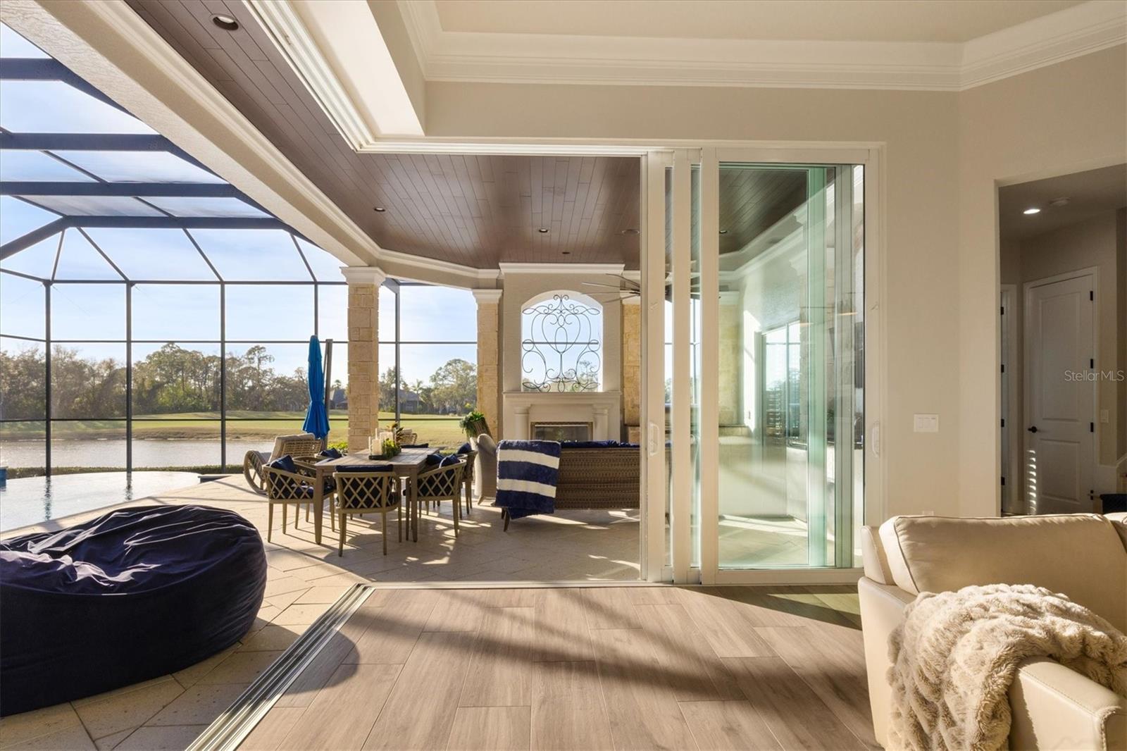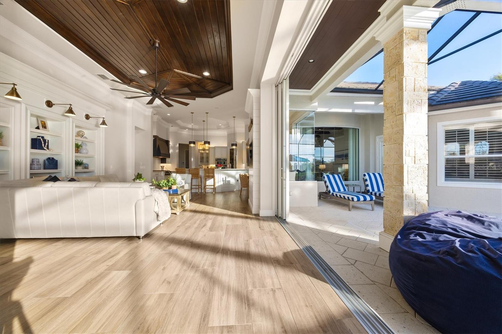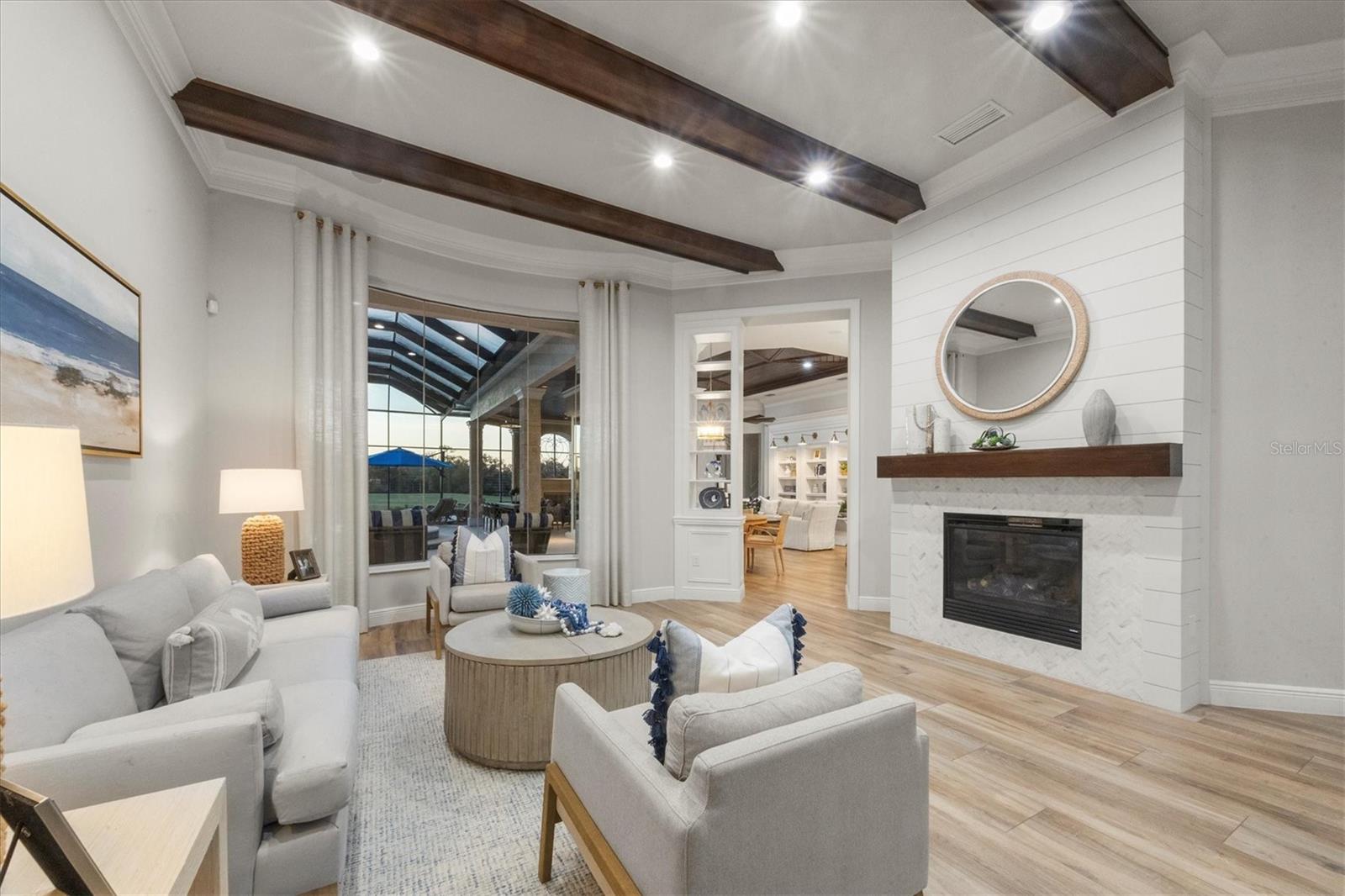 In the prestigious, maintenance-free Greystone enclave of Lakewood Ranch Country Club, this completely remodeled residence offers three bedrooms, four-and-a-half baths, a private office and an expansive upstairs bonus guest retreat, all positioned to capture sweeping, unobstructed golf course views. Meticulous landscaping and a paver driveway create a striking first impression, leading to a welcoming front porch and custom wood entry door. Inside, stunning wood-look plank porcelain tile flows seamlessly throughout the main living areas, complemented by architectural details at every turn with tray ceilings, crown molding, designer lighting and refined millwork that elevate the home with timeless elegance. A formal seating area framed by an aquarium window overlooks the sparkling pool and lush fairways beyond welcome you home. Architectural wood beams accent the ceiling while a gas fireplace with coastal detailing creates a warm focal point. A dedicated formal dining room provides an elegant setting for hosting gatherings intimate and grand. The heart of the home is a beautifully appointed chef's kitchen featuring quartz countertops, updated appliances, a generous prep island, breakfast bar seating, abundant cabinetry and a dry bar with wine refrigerator. An inviting breakfast nook, enhanced by an aquarium window, captures tranquil views of the lanai and golf course. The adjacent family room is rich with character, showcasing warm wood tones in tongue-and-groove planks within the tray ceiling, custom built-ins and disappearing corner sliders that fully open to the lanai, seamlessly blending indoor and outdoor living. The oversized primary suite serves as a private sanctuary, complete with tray ceiling detailing, dual walk-in closets, and a spa-inspired bath offering a soaking tub, walk-in shower and split vanities. Two additional guest bedrooms each feature their own en-suite bath, ensuring privacy and comfort for family and visitors. The bright, oversized office is functional and refined, highlighted by a rich, warm, wood built-in wall with shelving and custom cabinetry, a sophisticated and inspiring workspace. Upstairs, the expansive bonus room with full bar and full bath offers exceptional flexibility as a guest suite, fourth bedroom or entertainment retreat, complete with its private balcony overlooking the picturesque golf course. Outdoor living is nothing short of spectacular. The oversized lanai features a rich wood plank ceiling, gas fireplace, fully equipped outdoor kitchen, and generous spaces for dining, lounging and entertaining. A heated pool and spa are positioned to capture breathtaking panoramic golf course views, creating a private resort-style setting. Residents of Lakewood Ranch Country Club enjoy an elevated country club lifestyle with championship golf courses, tennis and pickleball courts, fitness facilities, resort-style pools, fine and casual dining, and a vibrant social calendar, all within proximity of shopping, dining, top-rated schools and the Gulf Coast's world-renowned beaches.