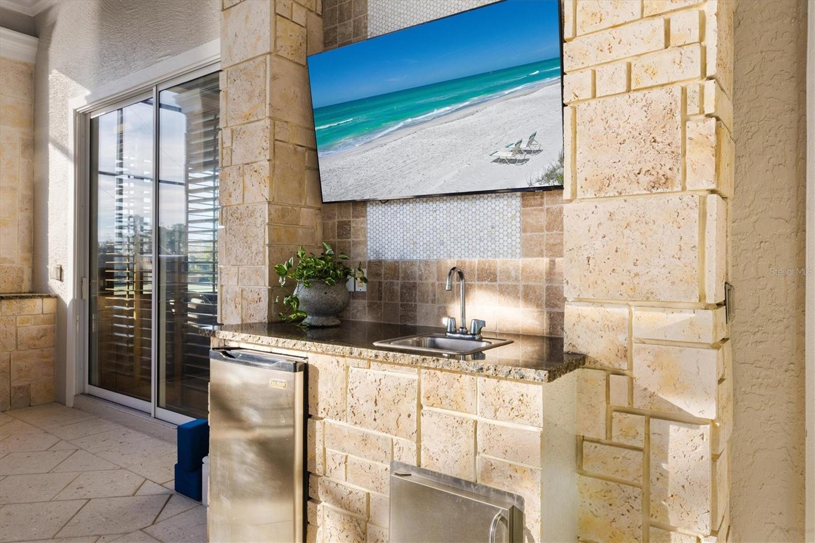Exterior: Lighting, Outdoor Grill, Outdoor Kitchen, Sidewalk, Sliding Doors