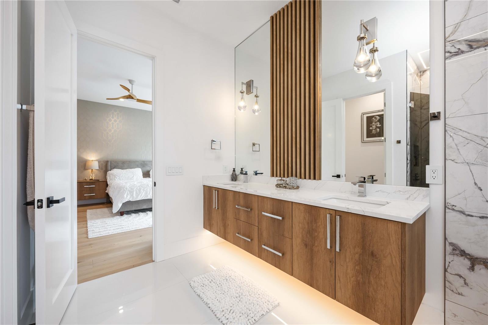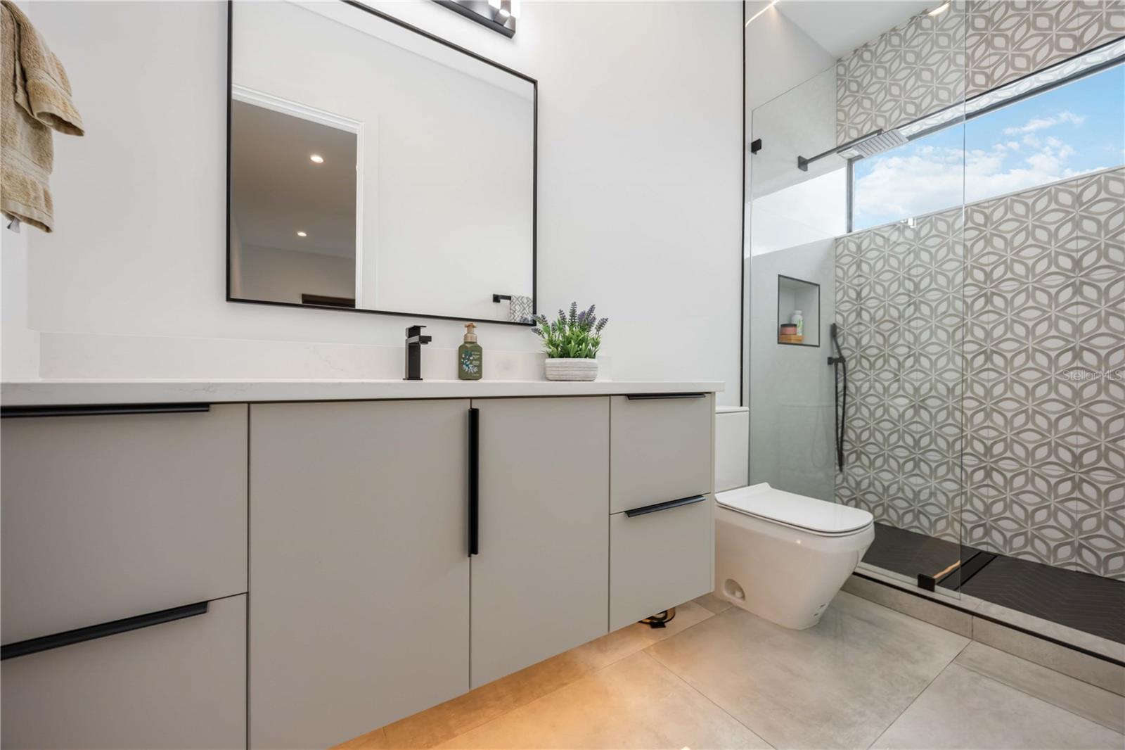 A statement of modern elegance in the heart of Sarasota, this exceptional Arlington Park residence delivers refined luxury, architectural presence, and elevated design at every turn. Offering 5 bedrooms, 5.5 bathrooms, and 3,651 square feet under air, this custom-built home was thoughtfully designed for those who appreciate both sophisticated entertaining and comfortable everyday living. From the moment you enter, soaring 12-foot ceilings and a dramatic staircase create an unforgettable first impression. The main living spaces are open, expansive, and filled with natural light. A designer kitchen anchors the home, showcasing solid wood cabinetry, quartz countertops, an oversized waterfall island, and premium Thermador appliances which are perfectly suited for culinary enthusiasts and elegant gatherings alike. A custom built-in feature wall enhances the living area with both style and function. Sliders seamlessly connect indoor and outdoor spaces, creating effortless Florida living. A private first-floor office offers a quiet retreat for work or study. Upstairs, 10-foot ceilings and rich hardwood flooring continue the home's elevated aesthetic. The owner's suite is a true sanctuary, complete with a private balcony overlooking the backyard, custom vanity, a soaking tub, and an oversized walk-in shower finished with striking designer tile. Each additional bedroom features its own en-suite bath and walk-in closet, ensuring comfort and privacy for family and guests. A spacious second-floor den provides flexible space for a media room, lounge, or game area. The outdoor setting rivals a private resort. The saltwater pool with waterfall and sun shelf is complemented by a spa, outdoor shower, and dedicated pool bath. A modern aluminum pergola adds architectural interest and shaded relaxation, while the lanai invites seamless entertaining year-round. No detail was overlooked: impact-rated windows and doors, epoxy-finished 2.5-car garage, irrigation system, integrated indoor/outdoor speakers, pre-wiring for security cameras, and dual A/C systems for optimal efficiency. Located in highly desirable Arlington Park, this home places you minutes from downtown Sarasota, Sarasota Memorial Hospital, and the area's renowned dining and cultural destinations. World-class beaches including Siesta Key and Lido Key are just a short distance away. This is more than a home...it is a lifestyle defined by quality, design, and distinction. All information provided by the sellers is deemed reliable but is not guaranteed. Buyers are encouraged to verify all information independently.
