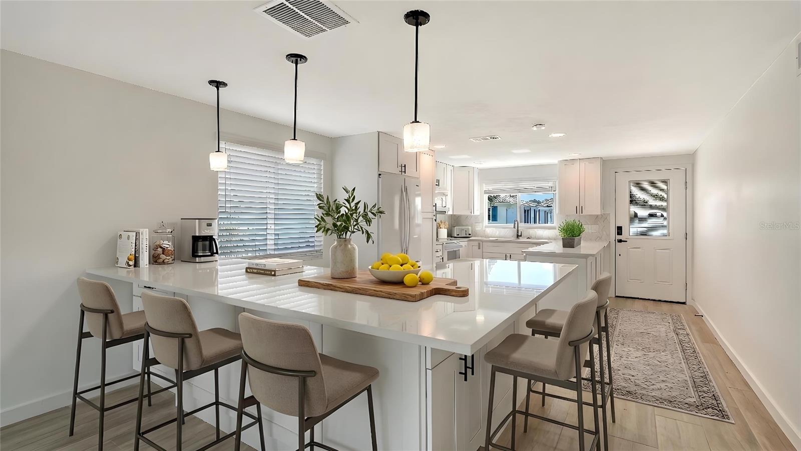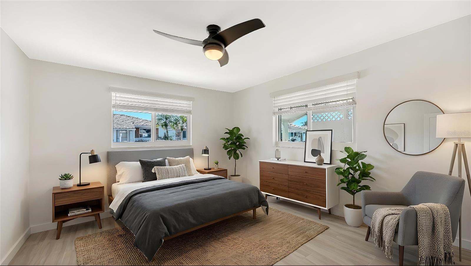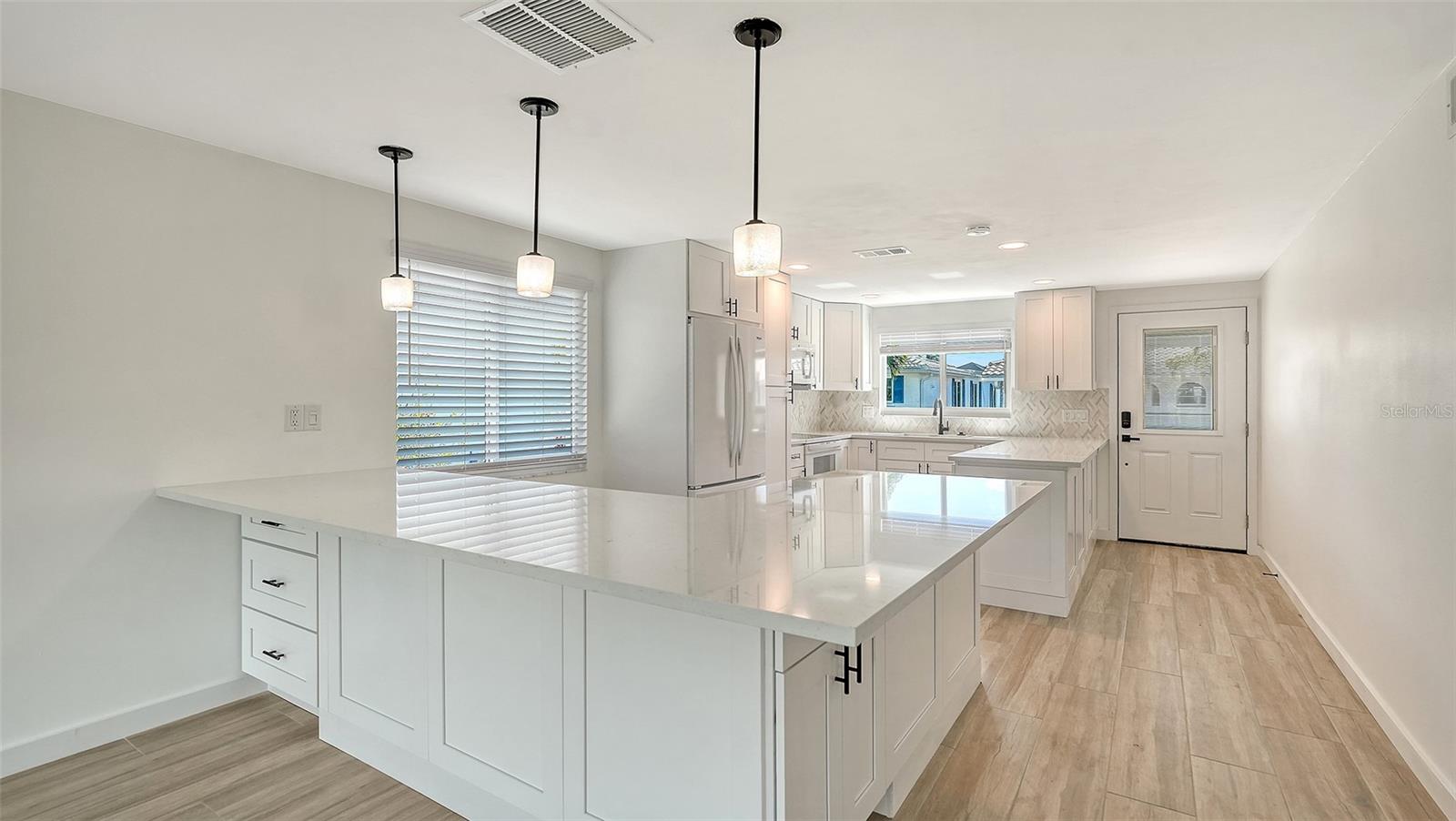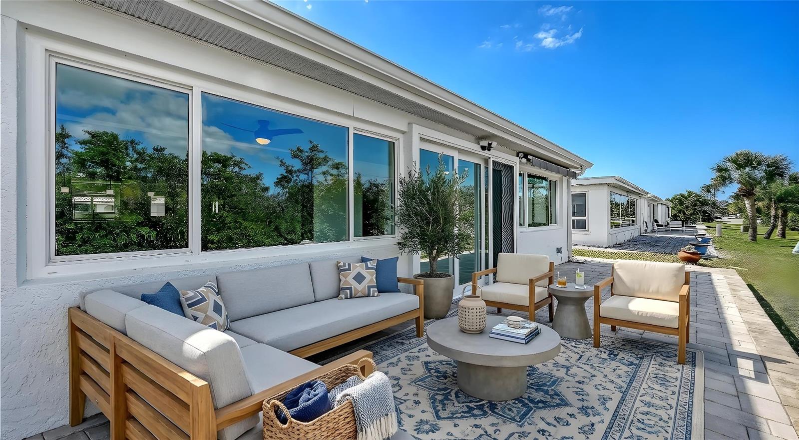 One or more photo(s) has been virtually staged. This gorgeous two-bedroom, two-bath Spanish Main standalone villa is a must-see! The fully complete custom remodel has been beautifully and tastefully appointed with meticulous craftsmanship. So many upgrades. Starting with the neutral tile plank flooring that runs throughout the villa, providing a seamless flow from room to room. The kitchen is a chef's dream. All wood 42-inch cabinets complete the kitchen with tons of storage, slow-close drawers, under-counter sink. Friends and family will love the oversized kitchen with all your new appliances and served on the large quartz counter/island that will easily seat seven barstools. The open floor plan allows for easy social gatherings. The primary bedroom has an en-suite bath with a spacious shower with custom glass frameless shower doors. Double sinks are topped off with beautiful lighting. The walk-in closet provides plenty of storage and is complete with sensor lighting. New double heavy wood and glass doors separate the primary bedroom from the spacious lanai. The lanai is the place to sit and enjoy the view of the lush wetlands that provide privacy and a sense of tropical retreat in your backyard. The expansive lanai can be used as a flex room, such as a dining area, office, reading room, a third sleeping place or workout area. Roof new in 2019 plus all hurricane windows and doors. Go out the hurricane-grade sliders to see the view of the Bay waters and smell the sea air. The Bay view from the lanai and backyard is lovely and definitely an added bonus that adds even more beauty to your backyard paradise. Feel secure with motion sensor lights at back of the home. Electric blinds on the windows provide ease of privacy and light control. A retractable awning will allow you to enjoy your oversized brick paver patio without the warm Florida sun being an issue. Extra outdoor PVC storage room. This vibrant 55-plus community of Spanish Main Yacht Club neighborhood is full of wonderful neighbors, and lots of amenities, shuffleboards, swimming pool, private deeded beach access to the gorgeous Longboat Key beaches and warm Gulf waters. Fishing, boating, cycling and more. Close to St. Armands Circle and downtown Sarasota makes this location ideal for shopping, dining, theater, botanical gardens, airport and more. All 212 units in Spanish Main Yacht Club are under FEMA regulations, guidelines and stringent adherence to rebuild specifications. New owners will receive any balance of insurance funds that are allotted to this villa. Call for details. All FEMA regulations completed, including inspections. Ready to enjoy your piece of paradise. Can be under 55 to purchase. With 1,300 square feet under air since lanai was closed in.