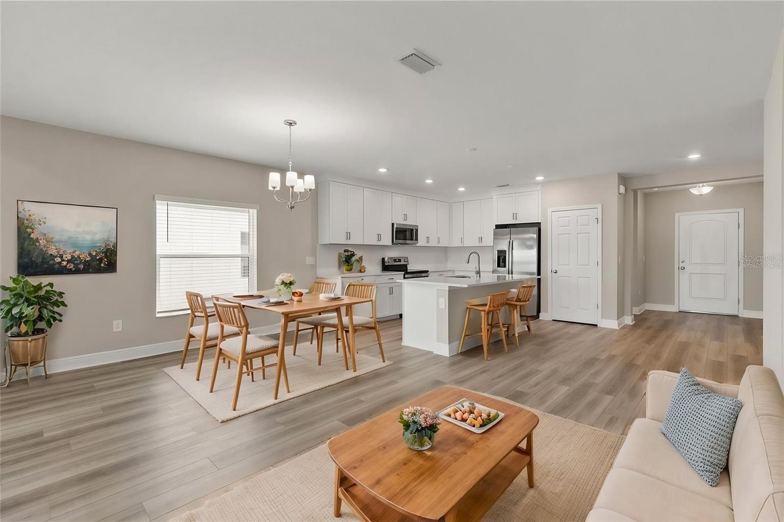Beautiful like-new 4-bedroom, 2-bath home located in the desirable Trevesta community, featuring peaceful water views behind the home and a preserve setting at the front for added privacy. Offers 1% lender credit at closing. Built in 2022, major systems including the roof, AC, and water heater are all 2022 for added peace of mind.The open-concept layout highlights a spacious kitchen with white quartz counter tops, stainless steel appliances, wood cabinetry, and a large center island that flows seamlessly into the main living and dining areas--ideal for entertaining. Ceramic tile runs throughout the main living spaces, while the bedrooms offer comfortable carpeting. The owner's suite includes a generous walk-in closet and a private bath with dual vanities. A screened lanai overlooks the lake, creating a relaxing outdoor space, and the laundry room is conveniently located near the two-car garage.Residents of Trevesta enjoy resort-style amenities including a clubhouse, zero-entry pool with cabanas, fitness center, splash pad, playground, and scenic walking and jogging trails around the lakes. The community is centrally positioned with convenient access to I-75, I-275, US-41, and US-301, making it easy to reach Tampa, St. Petersburg, Bradenton, Sarasota, Lakewood Ranch, and nearby Gulf Coast beaches. Ideal for first-time buyers, seasonal residents, or investors looking for a well-maintained home in a vibrant community.