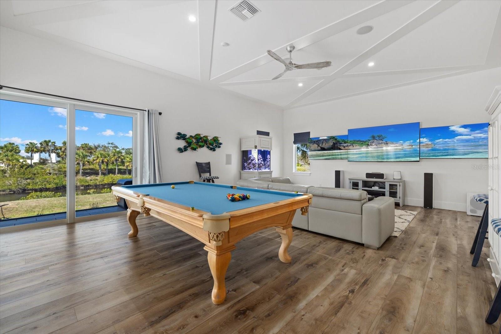 This extraordinary custom waterfront residence with a saltwater pool and spa in the Islands on the Manatee River blends luxury design, cutting-edge technology and direct boating access to the Gulf and Tampa Bay with no locks. Set on a private and nearly acre homesite, the impressive 131-foot-wide estate, completed in December 2024, offers over 4,200 square feet of luxurious living space - with over 7,200 total square feet under roof, including an expansive 8-car garage and large covered lanai space perfect for entertaining and enjoying the stunning water views.The home features 185 feet of waterfront living and a private dock with a 20,000-pound lift, making it a dream property for boating enthusiasts. Inside, the thoughtfully designed and open concept floor plan includes 4 bedrooms with en-suite baths, a den/office, bonus room, half bathroom and storage room, all finished with exceptional craftsmanship including 11-foot ceilings, upgraded LVP flooring throughout, 8-foot solid wood doors with extra wide openings, crown molding, vaulted ceilings, wood accented ceilings, impact-resistant Anderson windows and PGT doors.The chef's kitchen is the centerpiece of the home, showcasing Thermador appliances, a built-in double oven, gas range with griddle and downdraft vent, 60-inch Dacor column refrigerator and freezer, 42-inch shaker style wood cabinetry with upper cabinets, large quartz island, farmhouse sink, hidden walk-in pantry, coffee station, a wet bar with wine refrigerator and additional sink. The adjoining living room features 14-foot vaulted ceilings, custom built-ins, and a dramatic 24-by-10-foot pocket sliding glass door that opens seamlessly to the outdoor living area and pool.Designed for true Florida living, the expansive lanai offers nearly 1,000 square feet of covered entertaining space, highlighted by a saltwater pool and spa with gas heater, panoramic screen enclosure, upgraded pavers, and a fully equipped outdoor kitchen with Blaze grill and cooktop. Additional outdoor spaces include a fire pit, patio and beautifully landscaped yard overlooking the water and bridge. A spacious bonus room with zero-corner sliding impact glass doors, surround sound and water views provides the perfect space for entertaining.The luxurious primary suite features French doors to the lanai, large dual walk-in closets, and a spa-inspired bathroom with freestanding soaking tub, walk-in shower with rain head and dual showerheads and quartz vanities. Built with high-end systems and modern efficiency in mind, the home includes two Navien tankless gas water heaters, a 500-gallon propane tank, whole-house water filtration, reverse osmosis drinking water system, Cat6 wiring throughout, multi-zone surround sound, security system with 4K cameras, powered Roman shades, Wi-Fi irrigation from a private well and automated landscape lighting.The oversized eight-car garage offers exceptional flexibility for car enthusiasts or storage, featuring epoxy floors, insulated hurricane-rated doors, spray foam attic insulation, Wi-Fi LiftMaster openers with built-in cameras, EV charging and rear garage access to the backyard.This remarkable waterfront property offers a rare opportunity to enjoy custom luxury, modern efficiency, and direct Gulf boating access in one of the region's most sought-after waterfront communities. A full feature and upgrade sheet is available detailing the extensive enhancements throughout this exceptional home.