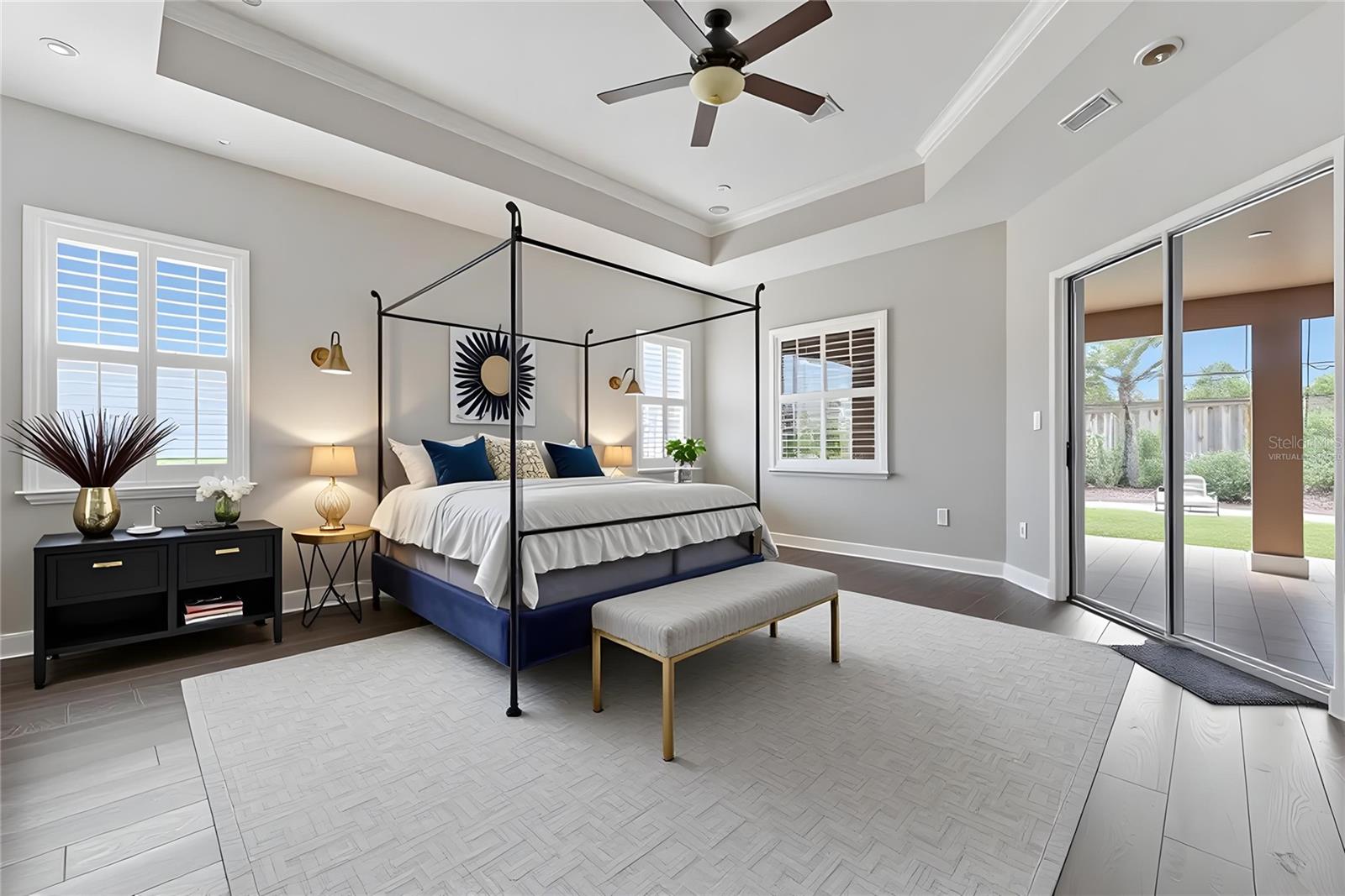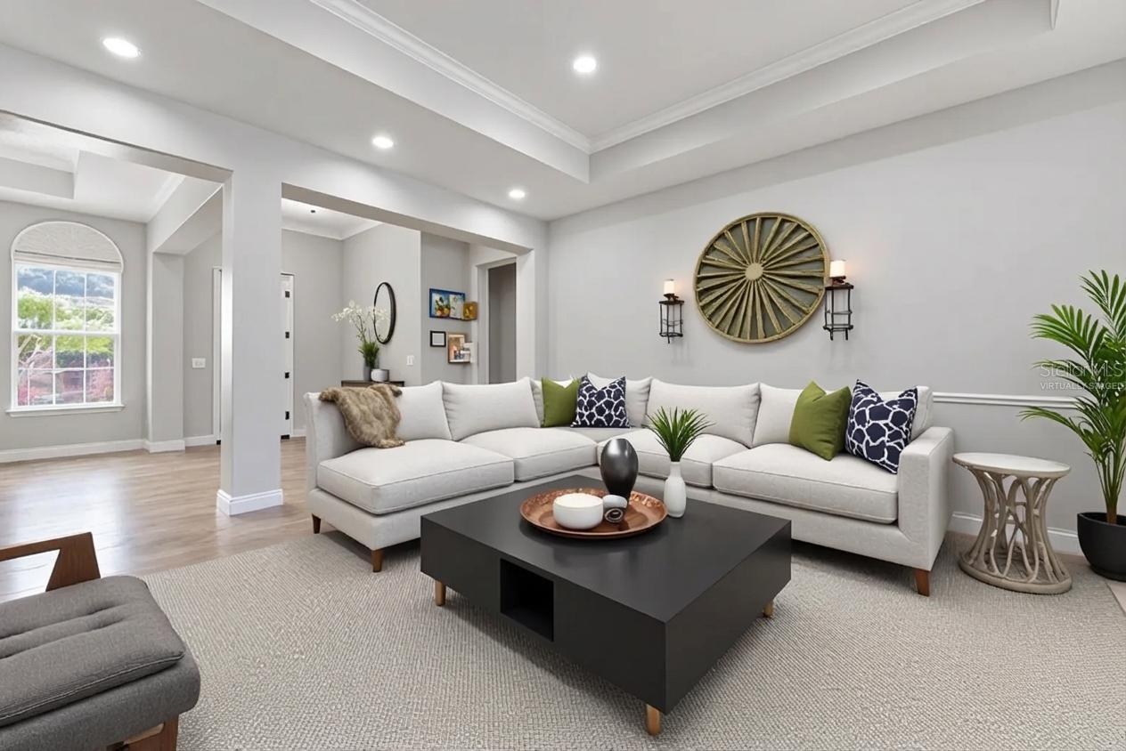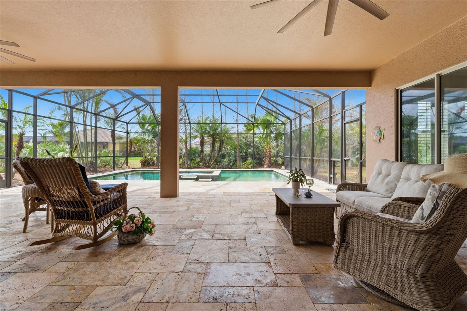 One or more photo(s) has been virtually staged. Well-appointed and upscale , this casually elegant two-story Rye Wilderness home offers nearly 4,000 square feet of thoughtfully designed living space. The layout includes a versatile flex-suite that functions beautifully as a secondary primary bedroom, private guest quarters, or even an au pair unit. Step inside and let me walk you through a home that blends Mediterranean-inspired style with comfortable everyday living.As you enter, you're greeted by an expansive, light-filled living area with a floor plan that introduces the formal dining room, main living room, and a welcoming hallway drawing you into the heart of the home. Generous windows and glass doors invite in soft natural light while preserving comfort, creating a bright, airy feel without harsh heat. Straight ahead, your eye is drawn to the lanai and pool, visible the moment you walk in, setting a relaxed tone.The classic masonry construction, elegant stone accents, and tile roof frame a warm interior centered around a fully equipped kitchen with an eat-in area perfect for daily meals. You'll find ample cabinetry, a built-in pantry, double sink with disposal, and convenient access to the oversized family room. The large family room, anchored by another wall of sliding glass doors, opens to the lanai so you're never far from tranquil views of the pool.The pool has with a gentle beach-entry design that offers a gradual slope into the water and a spa with a waterfall feature that enhances the soothing atmosphere. The expansive, travertine-tiled lanai provides abundant room for lounging, dining, and entertaining, making it an ideal place for everyday relaxation as well as gatherings.A practical first-floor layout places two secondary bedrooms just off the kitchen, with a well-situated bathroom between them--perfect for morning routines or guest use. Storage is a true strength on this level: in addition to the kitchen pantry, there is storage in the laundry room, a hall closet that can serve as a guest or coat closet, and a remarkable under-stairs walk-in storage area accessed from one of the bedrooms.Another comfortable first-floor bedroom with its own private bath and generous closet creates an excellent guest suite, older-child retreat, or private home-office bedroom.At the opposite side of the main living spaces, a more private hallway transitions you into the owner's wing. Just before the primary suite, a flexible room works beautifully as a nursery, office, sitting room, dressing room, or creative studio space. The primary bedroom is spacious and serene, and opens to the lanai and pool, allowing you to enjoy the water and waterfall feature. The primary bath offers a spa-like experience with a large walk-in shower, separate soaking tub, dual vanities, private water closet, and a generously sized walk-in closet.Upstairs, an expansive flex suite opens a world of possibilities. Currently enjoyed as a gym and teen living space, it can easily serve many purposes. With its own full bathroom, two closets. This level functions as a true separate living zone while still feeling connected to the home. Throughout, a thoughtful mix of tile, wood-look plank flooring, carpet, and travertine supports both style and practicality, allowing this floor plan to adapt gracefully to changing seasons of life while maintaining an easy, casually elegant ambiance.