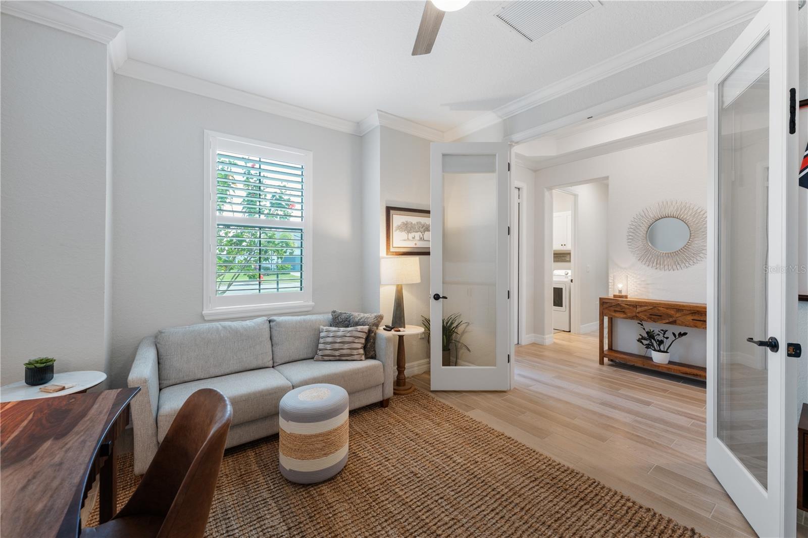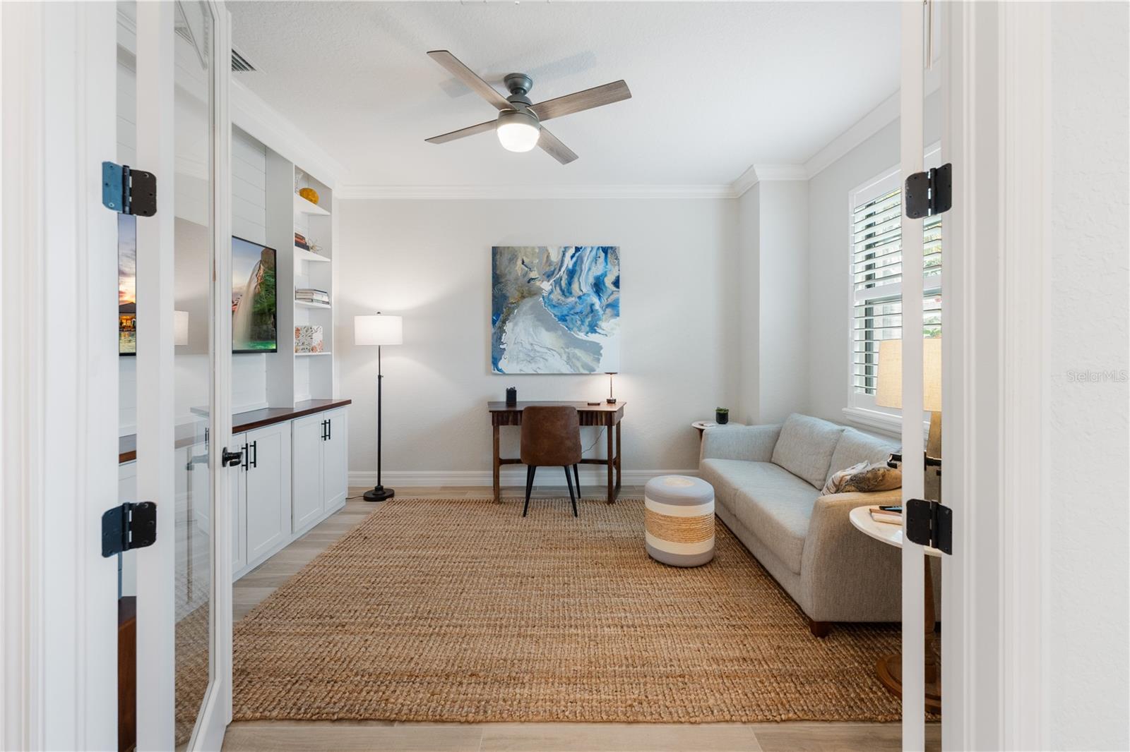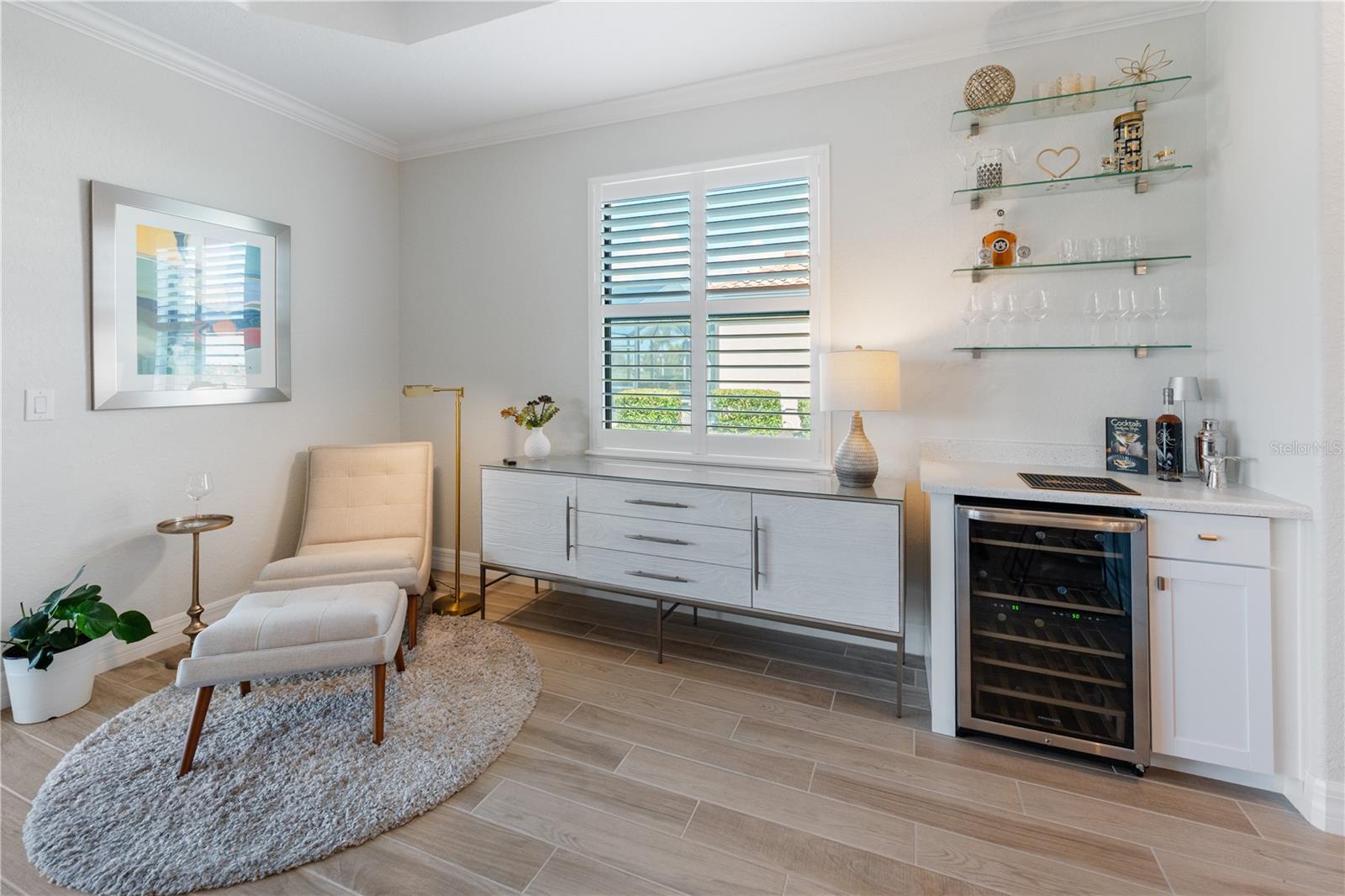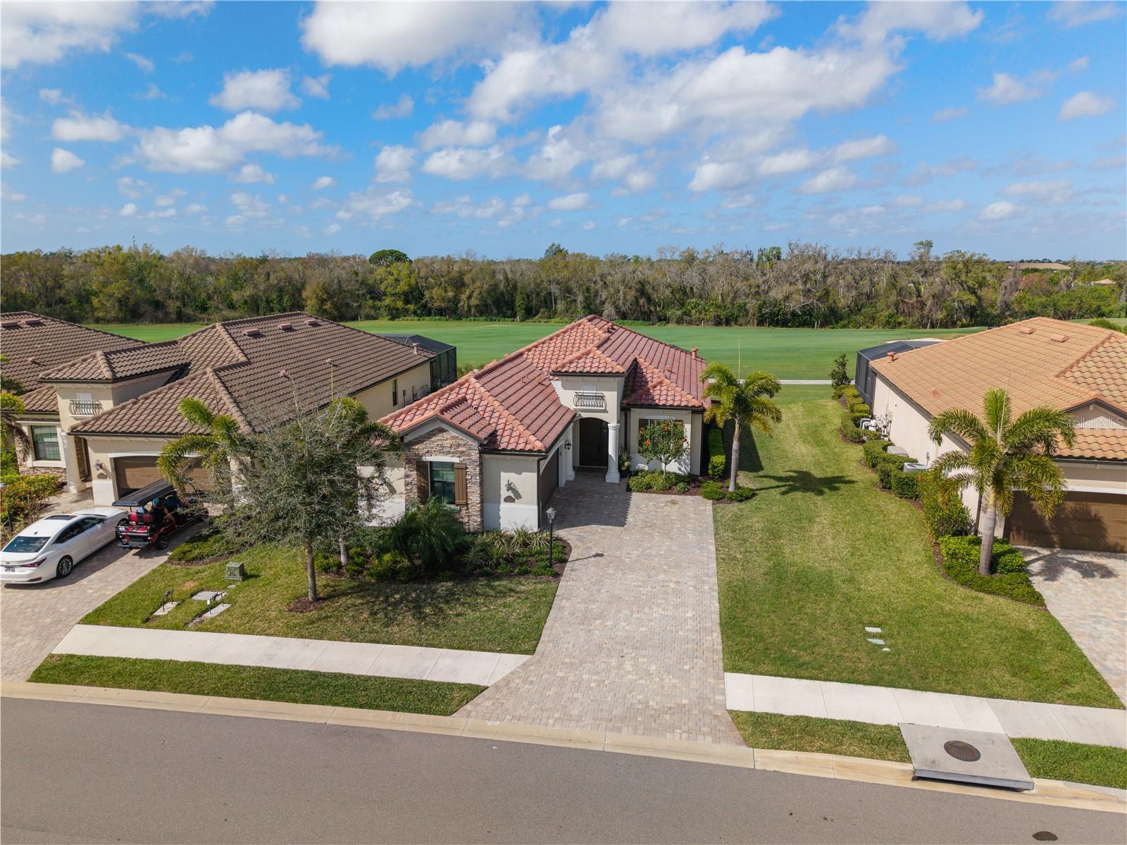Enjoy expansive golf course views and spectacular western sunsets from this beautifully upgraded 2 Bedrooms + Den, 2.5 Bath Victoria model located in one of Lakewood Ranch's most sought-after deeded golf communities, Lakewood National Golf Club. From the moment you arrive, the home offers inviting curb appeal with a widened paver driveway expanded approximately 18 inches on each side, tile roof, impact-rated windows, mature tropical landscaping, and a side-yard easement providing additional space between neighboring homes. Inside, the open-concept layout features tile plank flooring throughout the main living areas, tray ceilings with crown molding, designer lighting, and a spacious great room that flows seamlessly into the kitchen and dining areas. The kitchen showcases white cabinetry, granite countertops, stainless steel appliances, and a spacious center island with seating that anchors the open living space, perfect for everyday living and entertaining. The adjacent dining space is highlighted by a designer chandelier, creating a welcoming setting for gatherings. A custom beverage bar with wine refrigerator and glass shelving adds a stylish touch, while the great room is highlighted by a designer feature wall with shelving. The primary suite offers golf course views, tray ceiling, walk-in closet, and an en-suite bath with dual vanities, soaking tub, walk-in shower, and a private water closet. A spacious private den with glass French doors, privacy shades, and custom built-ins offers an ideal flex space for a home office, media room, or guest retreat, with room to add a Murphy bed. The guest bedroom with plantation shutters is located near a full guest bathroom, offering comfortable accommodations and privacy for visitors. Step outside to the extended 35' x 25' screened lanai with paver deck and upgraded panoramic screen enclosure, designed for true Florida indoor-outdoor living. This impressive space includes multiple seating and dining areas and a fully equipped outdoor kitchen with grill, vent hood, and beverage refrigerator. The panoramic screen enclosure maximizes expansive golf course views and spectacular western sunsets, creating a perfect setting for relaxing or entertaining. A convenient lanai half bath provides easy access for outdoor gatherings, and the outdoor space offers room to add a pool, if desired. Additional highlights include custom electric shades in the living room and primary bedroom, plantation shutters, epoxy garage flooring with overhead storage racks, designer lighting, and thoughtful finishes throughout. Golf membership conveys with ownership. Lakewood National Golf Club is the only deeded golf community in Lakewood Ranch where ownership for all residents includes access to two Arnold Palmer-designed 18-hole championship courses, one of which hosts the annual Korn Ferry Tour event. Residents enjoy a beach-entry heated lagoon pool with waterfalls and lap lanes, six satellite pools, tiki bar, Grand Clubhouse dining, state-of-the-art fitness center with studios and trainer, spa services, Har-Tru tennis courts, pickleball, bocce, practice facilities, scenic trails, and a vibrant community calendar. Completed in 2022, the community is fully established and professionally managed with 24-hour guard-gated entry and roaming security. An exceptional opportunity to enjoy the Lakewood National lifestyle.