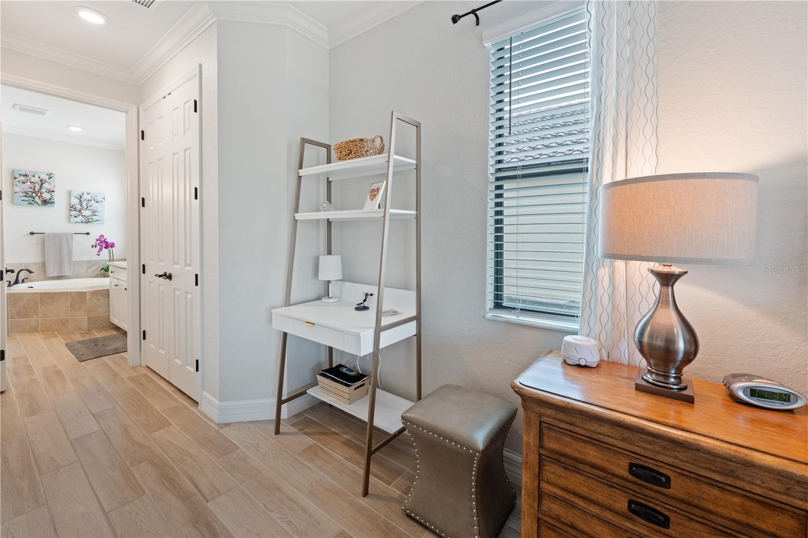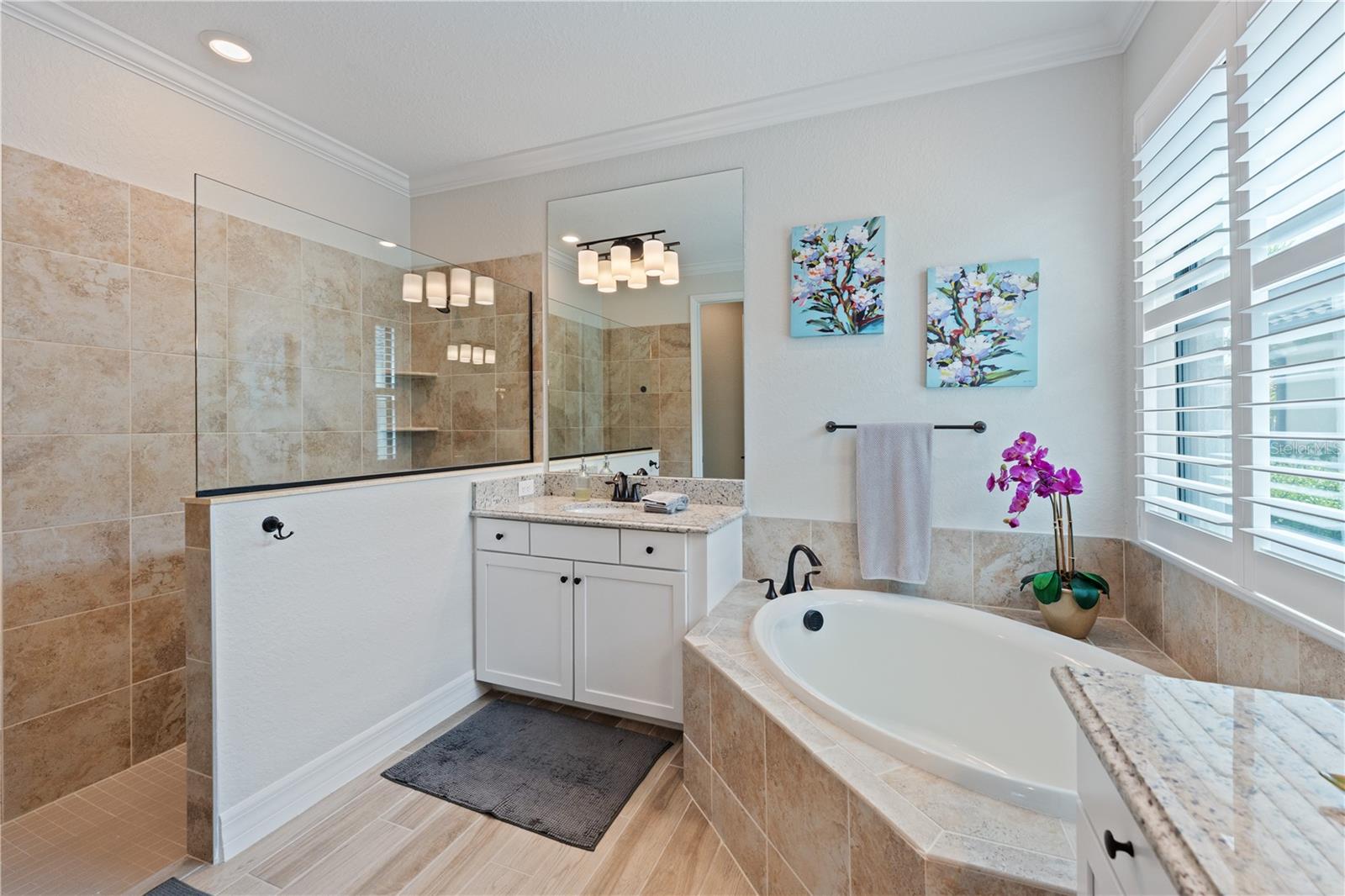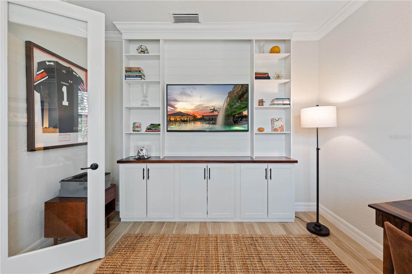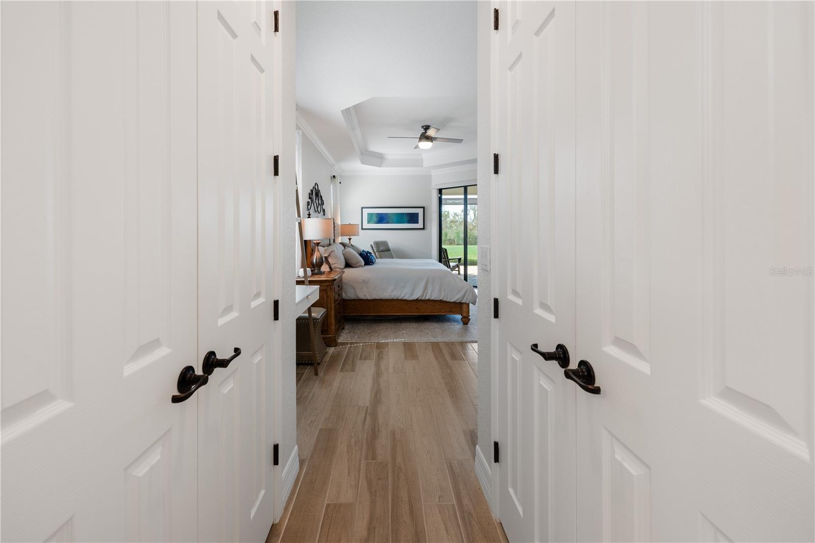 Enjoy expansive golf course views and spectacular western sunsets from this beautifully upgraded 2 Bedrooms + Den, 2.5 Bath Victoria model located in one of Lakewood Ranch's most sought-after deeded golf communities, Lakewood National Golf Club. From the moment you arrive, the home offers inviting curb appeal with a widened paver driveway expanded approximately 18 inches on each side, tile roof, impact-rated windows, mature tropical landscaping, and a side-yard easement providing additional space between neighboring homes. Inside, the open-concept layout features tile plank flooring throughout the main living areas, tray ceilings with crown molding, designer lighting, and a spacious great room that flows seamlessly into the kitchen and dining areas. The kitchen showcases white cabinetry, granite countertops, stainless steel appliances, and a spacious center island with seating that anchors the open living space, perfect for everyday living and entertaining. The adjacent dining space is highlighted by a designer chandelier, creating a welcoming setting for gatherings. A custom beverage bar with wine refrigerator and glass shelving adds a stylish touch, while the great room is highlighted by a designer feature wall with shelving. The primary suite offers golf course views, tray ceiling, walk-in closet, and an en-suite bath with dual vanities, soaking tub, walk-in shower, and a private water closet. A spacious private den with glass French doors, privacy shades, and custom built-ins offers an ideal flex space for a home office, media room, or guest retreat, with room to add a Murphy bed. The guest bedroom with plantation shutters is located near a full guest bathroom, offering comfortable accommodations and privacy for visitors. Step outside to the extended 35' x 25' screened lanai with paver deck and upgraded panoramic screen enclosure, designed for true Florida indoor-outdoor living. This impressive space includes multiple seating and dining areas and a fully equipped outdoor kitchen with grill, vent hood, and beverage refrigerator. The panoramic screen enclosure maximizes expansive golf course views and spectacular western sunsets, creating a perfect setting for relaxing or entertaining. A convenient lanai half bath provides easy access for outdoor gatherings, and the outdoor space offers room to add a pool, if desired. Additional highlights include custom electric shades in the living room and primary bedroom, plantation shutters, epoxy garage flooring with overhead storage racks, designer lighting, and thoughtful finishes throughout. Golf membership conveys with ownership. Lakewood National Golf Club is the only deeded golf community in Lakewood Ranch where ownership for all residents includes access to two Arnold Palmer-designed 18-hole championship courses, one of which hosts the annual Korn Ferry Tour event. Residents enjoy a beach-entry heated lagoon pool with waterfalls and lap lanes, six satellite pools, tiki bar, Grand Clubhouse dining, state-of-the-art fitness center with studios and trainer, spa services, Har-Tru tennis courts, pickleball, bocce, practice facilities, scenic trails, and a vibrant community calendar. Completed in 2022, the community is fully established and professionally managed with 24-hour guard-gated entry and roaming security. An exceptional opportunity to enjoy the Lakewood National lifestyle.