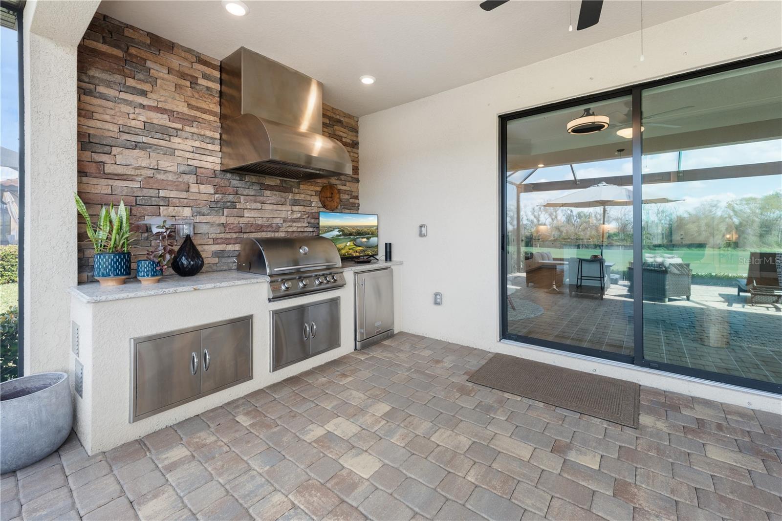 Exterior: Hurricane Shutters, Outdoor Grill, Outdoor Kitchen, Rain Gutters, Sidewalk, Sliding Doors