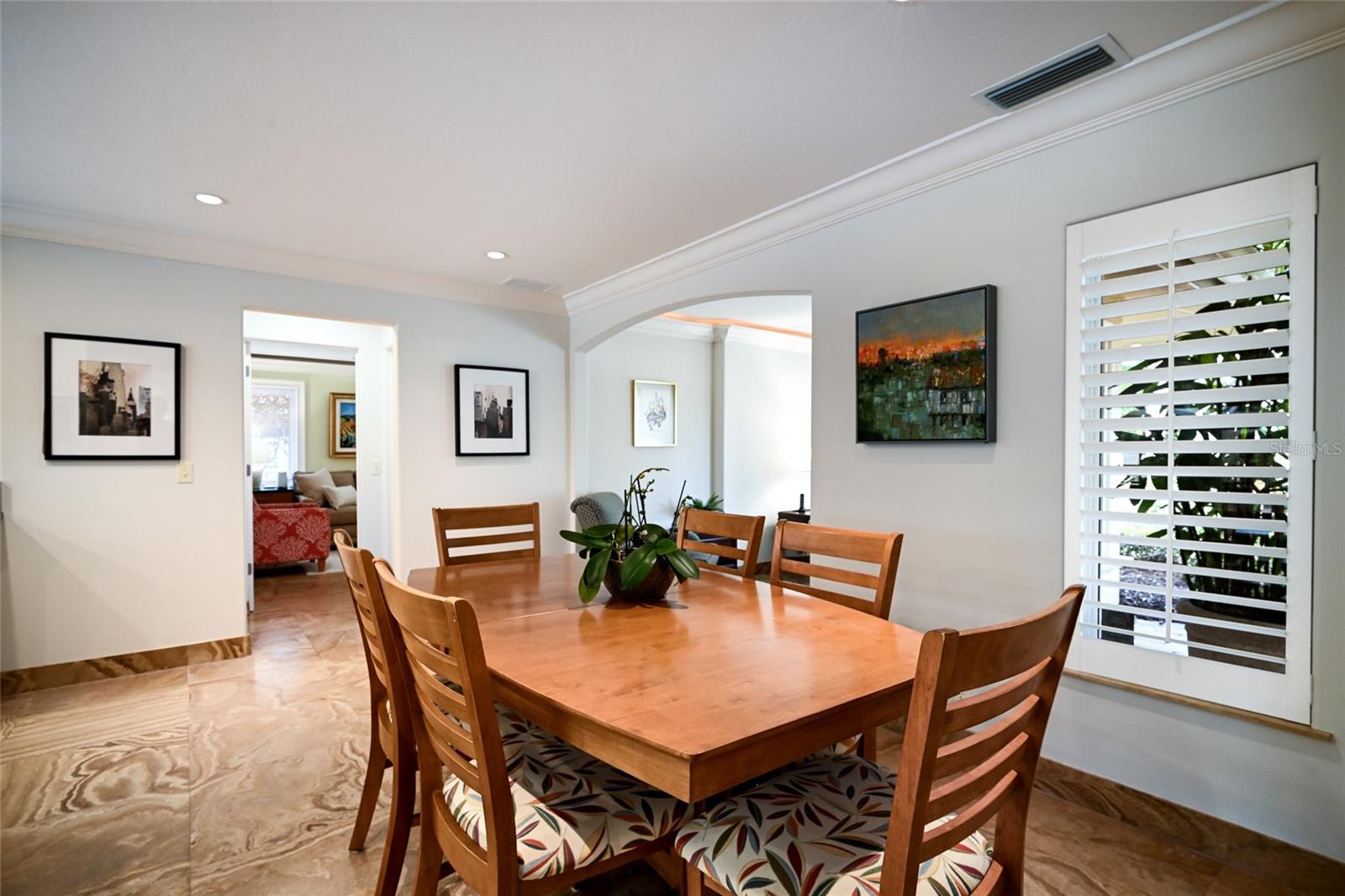 Ideally located on one of Bird Key's most desirable streets, this residence is set on one of the larger garden-home lots in this prestigious neighborhood. Mature landscaping creates exceptional privacy throughout the property with garden pathways, lawn areas, and outdoor dining space adjacent to the large, recently resurfaced pool and lanai with retractable screens. Inside, custom travertine floors flow throughout the home. The living room features an elevated ceiling with cove lighting and custom built-in cabinetry and seating, while a wall of glass doors open to the pool terrace, seamlessly connecting the indoor and outdoor living spaces. The kitchen, featuring a large granite center island, custom cabinets, and natural gas stove, opens to the dining area and a comfortable sitting nook perfect for relaxing with your morning coffee. The primary suite includes extensive custom built-ins and generous storage. All three bedrooms offer en-suite bathrooms and fully appointed walk-in closets, while a fourth bathroom serves as a convenient pool bath with shower. Additional features include two air-conditioning systems, impact windows, tankless gas hot water, a full-house generator, whole house water filtration system, security system, and an irrigation well that maintains the landscaping. Bird Key offers an outstanding location just minutes from downtown Sarasota, the shops and dining of St. Armands Circle, and Lido Beach. The Bird Key Yacht Club is currently undergoing a full rebuild and is anticipated to reopen in 2026 as one of Sarasota's premier destinations for boating, dining, tennis, and social events.