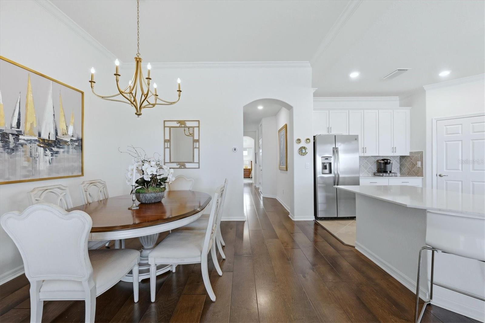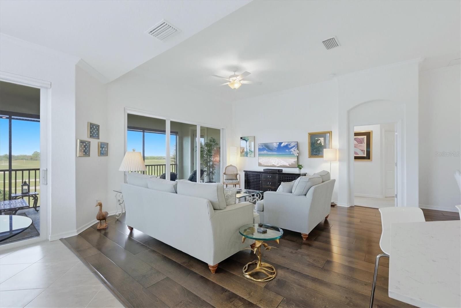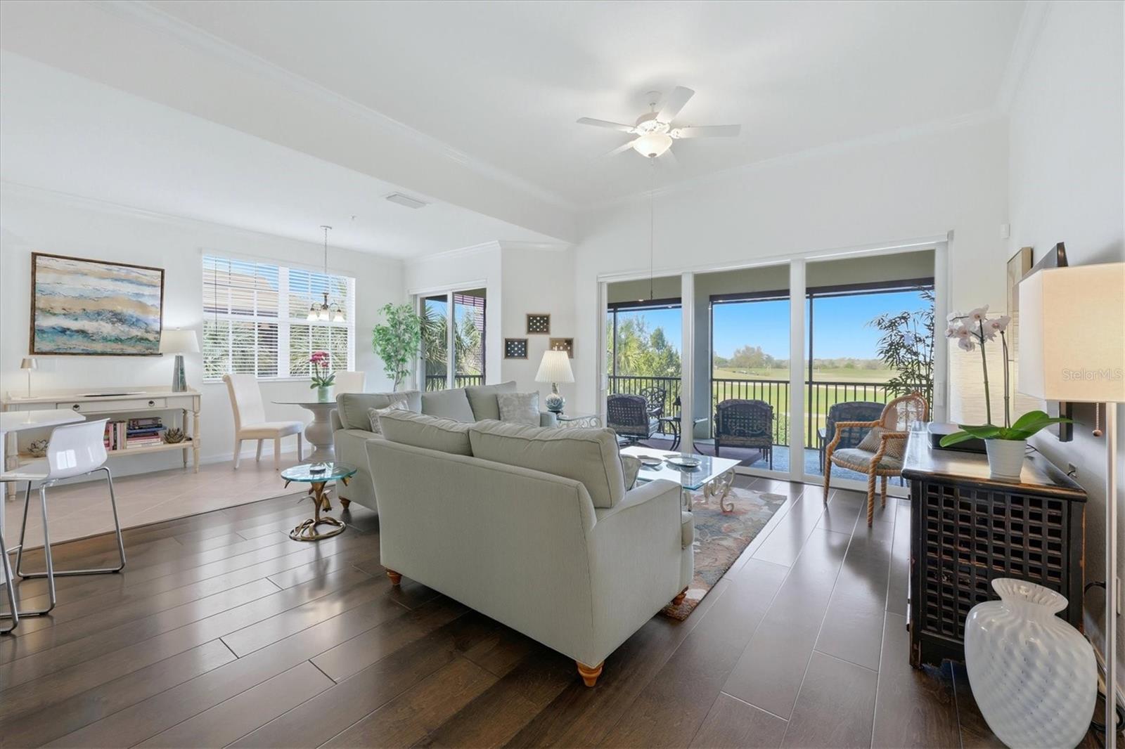 Fantastic, Immaculately Clean, Meticulously Maintained 2nd Floor 3 Bedroom, Den, 2 Bath SPACIOUS coach home Clubside in Country Club East of Lakewood Ranch. SPECTACULAR LONG RANGE GOLF COURSE VIEW! THIS VIEW IS A WOW! Gated, and Private Guard House Entrances into your upscale and well kept community. Beautifully decorated Great Room living space with engineered hardwood floors and crown molding. Tall Ceilings, Hunter Douglas Blinds and Plantation Shutters enhance the decor. Hurricane Impact Triple and Double sliders with access to the extra wide lanai with extra comfy seating to enjoy the amazing backdrop. Light and Bright! Open concept Kitchen with 42" tall white cabinetry and white quartz countertops, stainless steel appliances and a gas range. Huge One level Island to gather round when entertaining! Dining area can accommodate a large table and additional eating area for a smaller table. Primary Bedroom suite with same golf course view, Crown Molding, Coffered ceilings, ensuite Bath with dual sinks, quartz counters, large linen closet, walk in closet, and a frameless shower enclosure. Guest Bedrooms split plan in the front of the unit with a full guest bathroom in between. Comfy Den/Study across from Guest bedrooms. Plenty of closet space and oversized attached two car garage. Never run out of hot water with a Tankless Gas Water Heater. All Windows and Doors are Hurricane Impact rated. The Retreat is an amazing upscale Clubhouse for residents and their guests only. Gorgeous Pool, Fitness Center, and Patio Situated on The Royal Lakes Golf Course offering beautiful Golf Course and Lake vistas. The Lodge and several Golf courses Require an additional Country Club Membership. Lakewood Ranch is an award-winning master-planned community with glorious weather, top-rated schools, and a perfect inland location. Enjoy proximity to world-renowned beaches (Siesta Key, Lido, Longboat, and Anna Maria), public golf courses, boating, fishing, biking, walking trails, UTC Mall, and countless restaurants. Downtown Sarasota and Bradenton offer vibrant dining, rooftop bars, arts, and cultural venues. Multiple international airports within an hour. Welcome to the Gulf Coast lifestyle!