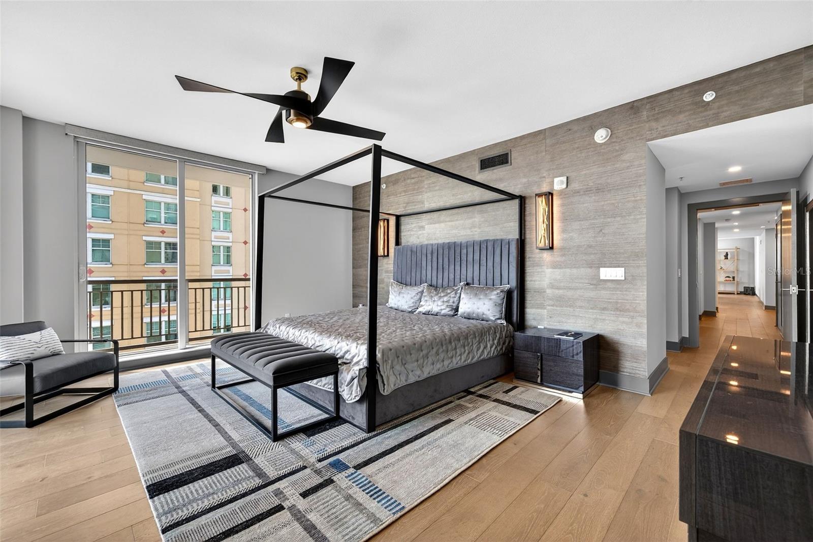 Exterior: Balcony, Lighting, Outdoor Grill, Sidewalk, Sliding Doors