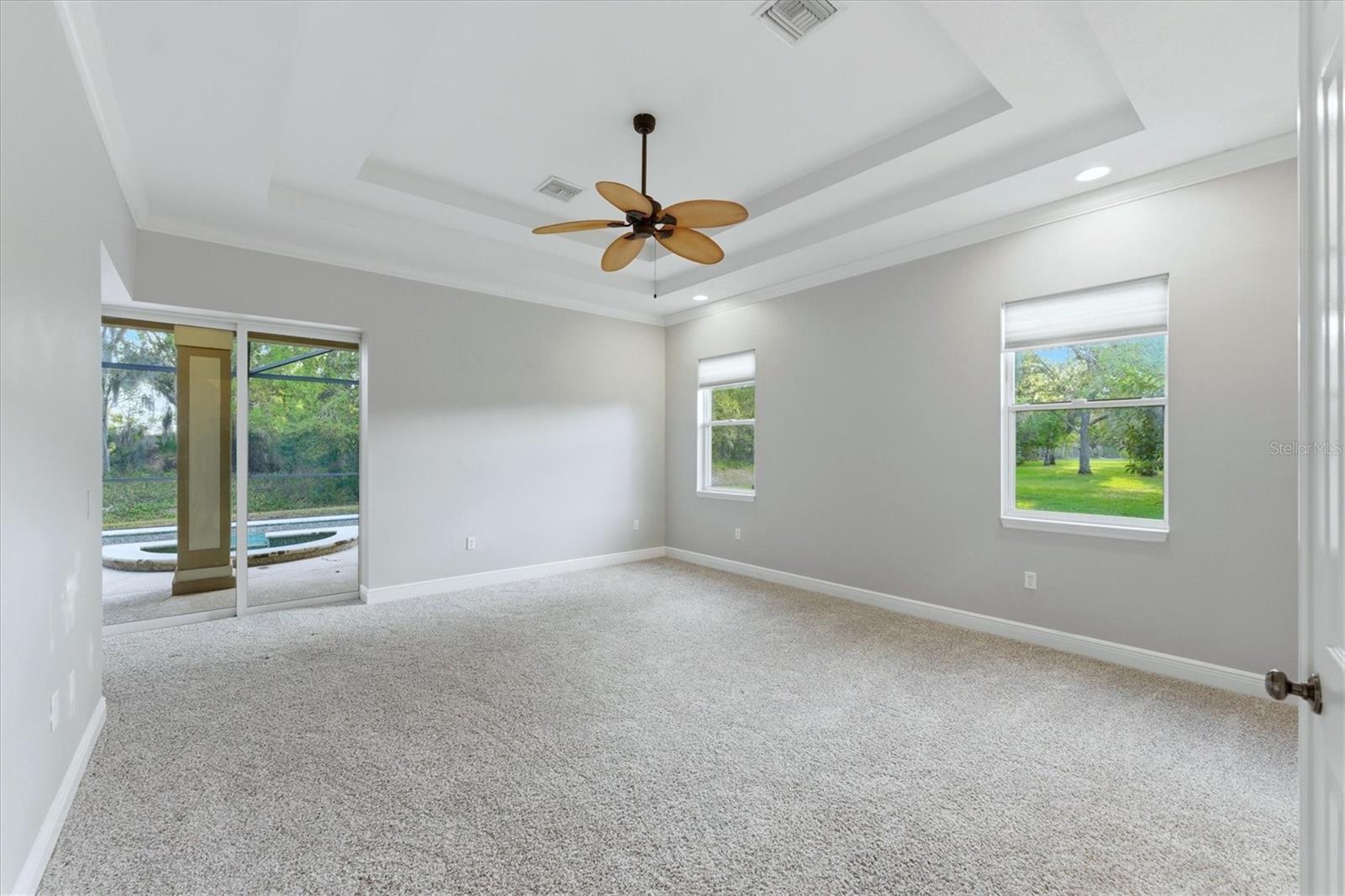 One or more photo(s) has been virtually staged. PRICE IMPROVEMENT!! Elegant executive-style home in Mill Creek offering 3,257 sq ft of living space with 4 bedrooms, 3 full baths, and a den in a desirable split floor plan. Situated on a private -acre lot, this home features tray ceilings, formal living and dining rooms, and a spacious family room with pocket sliders opening to the screened lanai and pool, creating seamless indoor-outdoor living.The gourmet kitchen showcases custom cabinetry, stainless steel appliances, a large island, breakfast bar, and sunny breakfast nook. A striking disappearing corner slider enhances both the family room and the primary suite, which offers a step-up garden tub and oversized walk-in shower. Additional highlights include custom built-ins in the dining room and den, a large laundry room, and a 3-car garage. The private backyard provides a peaceful setting for relaxing or entertaining.