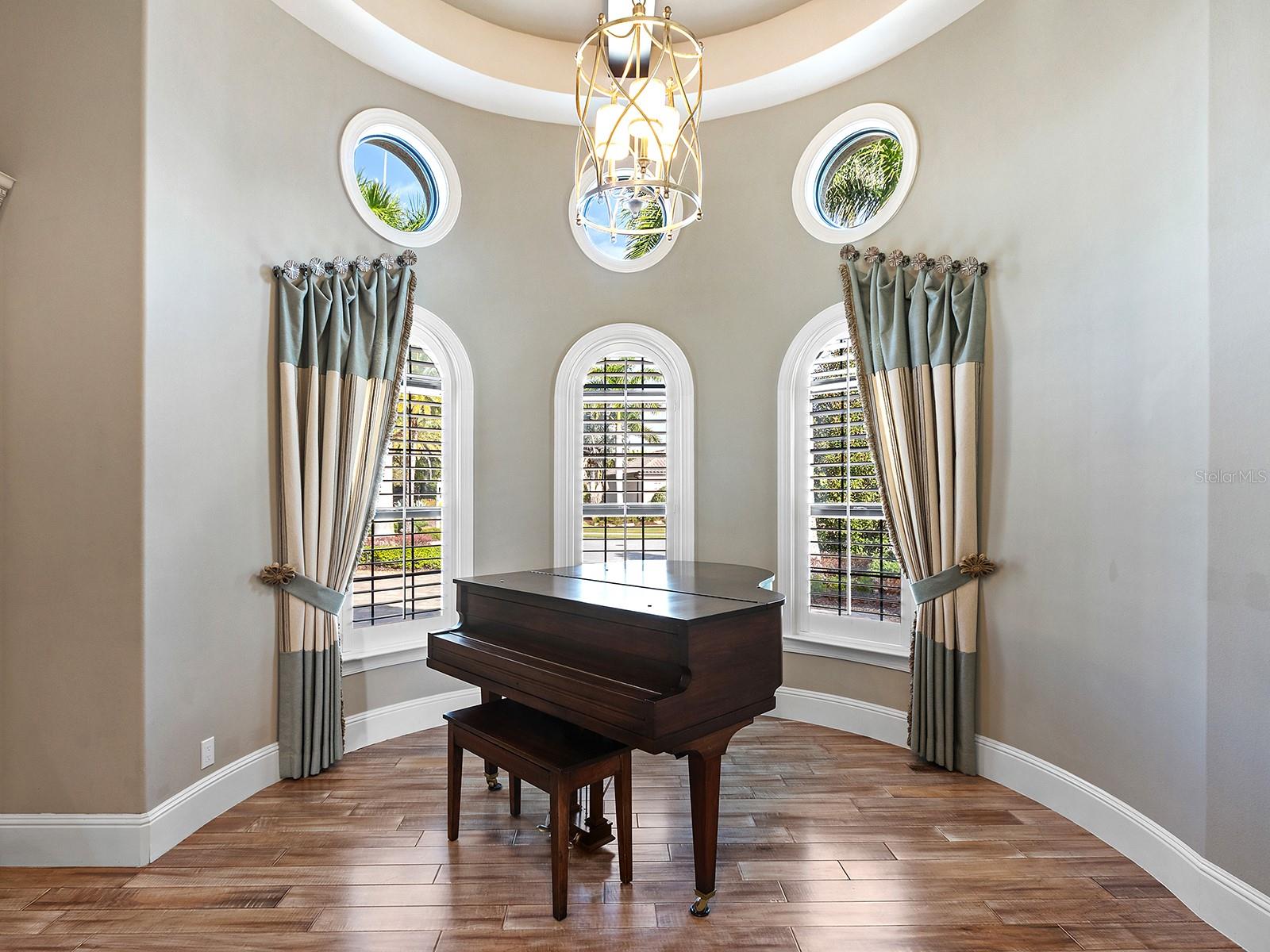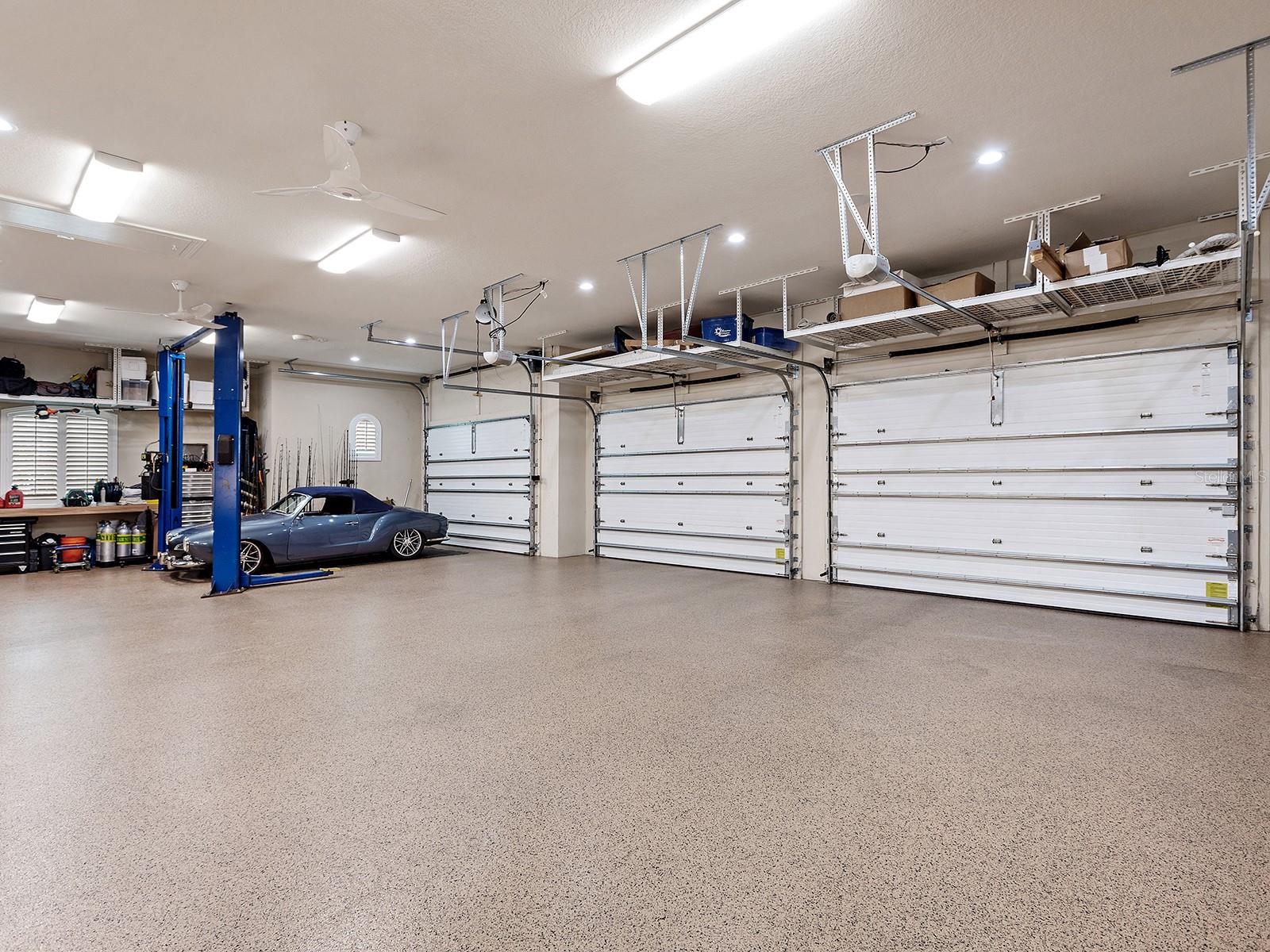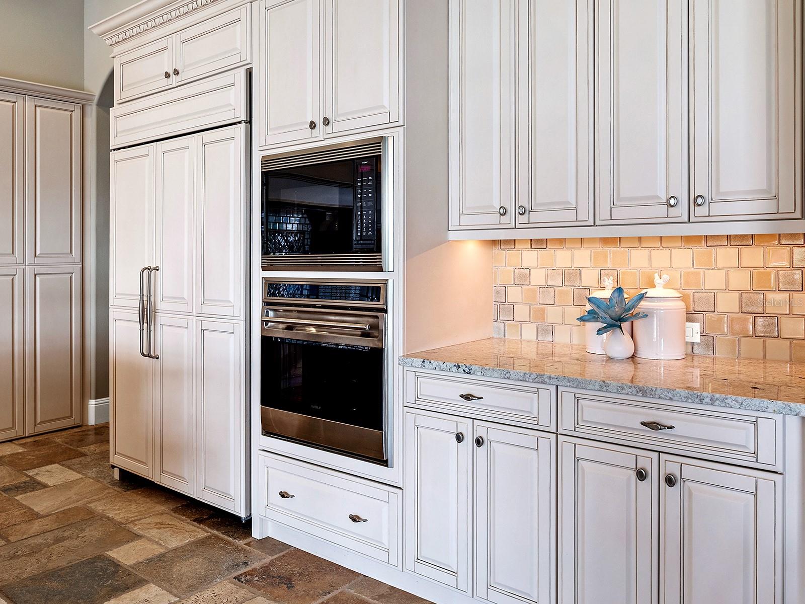 Set within the gates of Country Club East, this highly customized, green-certified residence is distinguished by its architectural details and elevated finishes. Mature landscaping frames the home, complemented by lighting, an expansive side yard, and a paver driveway. Inside, the home establishes a sense of craftsmanship and scale. A striking entry with tongue-and-groove ceiling detail and arched iron double doors opens to a cathedral-ceiling foyer, where architectural archways guide the transition into the main living spaces. Throughout the home, upgrades such as solid wood arched doors, crown molding, 7-inch baseboards, Icynene spray foam insulation, and a blend of stone flooring with Dura Shield coating and engineered wood create both visual continuity and performance-driven comfort. The great room is designed with soaring 14-foot ceilings accented by faux wood beams and a recessed media wall with stacked stone detailing. Sliding glass doors open fully to the lanai, drawing in natural light and framing unobstructed views of the pool, lake, and golf course beyond. The kitchen and dining areas strike a balance between functionality and style. Custom cabinetry with glass-front uppers and integrated LED lighting pairs with a full suite of Sub-Zero and Wolf appliances, including a wine cooler and additional refrigeration. A vast floating island with hidden outlets and storage anchors the space, while a walk-in pantry with wood shelving and thoughtful details, such as spice pull-outs and concealed trash storage, enhances everyday usability. Adjacent dining spaces are elevated by layered ceiling treatments, designer lighting, and zero-corner sliders that emphasize the indoor-outdoor lifestyle. A detailed office offers dual workstations, extensive built-ins, a circular tray ceiling with intricate woodwork, and shiplap accent detailing. The primary suite is privately positioned, featuring tray ceilings with cove lighting, a sitting area, lanai access, and dual custom walk-in closets. The spa-like bath includes a Kohler soaking tub with stone surround, two vanities, and a walk-in shower with multiple showerheads, travertine finishes, and architectural window detailing. Three guest suites are equally refined, offering spacious closets, plantation shutters, and access to well-appointed bathrooms featuring custom tilework, granite surfaces, and a shower and/or tub. A standout bonus space, currently configured as a golf simulator room, features a barrel-vaulted ceiling, professional-grade flooring, and direct lanai access. The outdoor living experience is designed as a private resort setting. The lanai features a tongue-and-groove ceiling, recessed lighting, and multiple seating areas overlooking a saltwater pool and spa, complete with iridescent tile and a sun shelf. A fully equipped outdoor kitchen boasts Monogram appliances, marine-grade cabinetry, and granite countertops, all set against tranquil views of the golf course and water. Functionality is further enhanced by a well-equipped laundry room, a thoughtfully designed drop zone and mudroom entry from the garage, and extensive storage throughout. The oversized garage, which holds 6 cars, is equipped with epoxy flooring, built-in cabinetry, overhead storage, a utility sink, and a 7,000lb car lift. Ideally located in Lakewood Ranch, residents are just minutes from Waterside Place, UTC shopping and dining, Nathan Benderson Park, SRQ Airport, downtown Sarasota, and the renowned Gulf beaches.