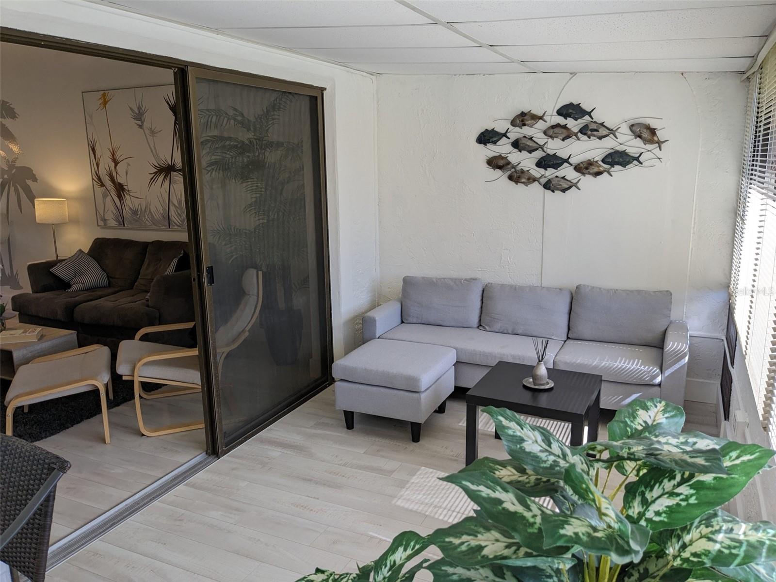 Welcome to this beautifully landscaped 55+ community. Move in ready south facing home with lots of bright sunlight and full privacy with no properties straight across from you looking in. Remodeled in 2024, kitchen has stainless steel appliances with low profile range, stainless hood and undermount kitchen sink, high-end quartz countertops with a ceramic backsplash. Led lighting throughout the home, luxury vinyl plank flooring and base moldings throughout the home. Spacious vaulted ceilings in the dining and living rooms. Large bedroom with lots of closet space. Large double glass patio sliders from living room to the air conditioned and window enclosed large lanai. Dedicated private covered parking spot also included. Community amenities include pool, ponds, fountain, tennis and pickleball courts, shuffleboard courts, a library, and a card room, ensuring there's always something to enjoy and all close to restaurants, beaches and amenities.