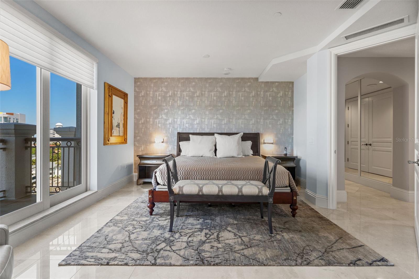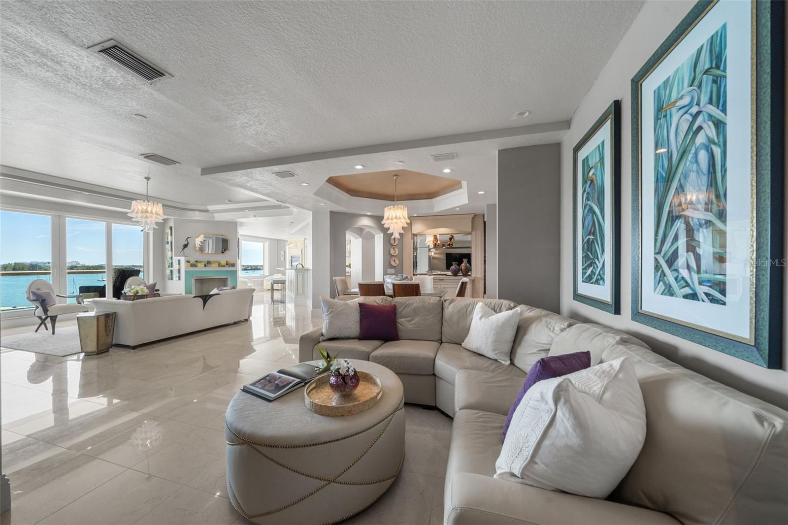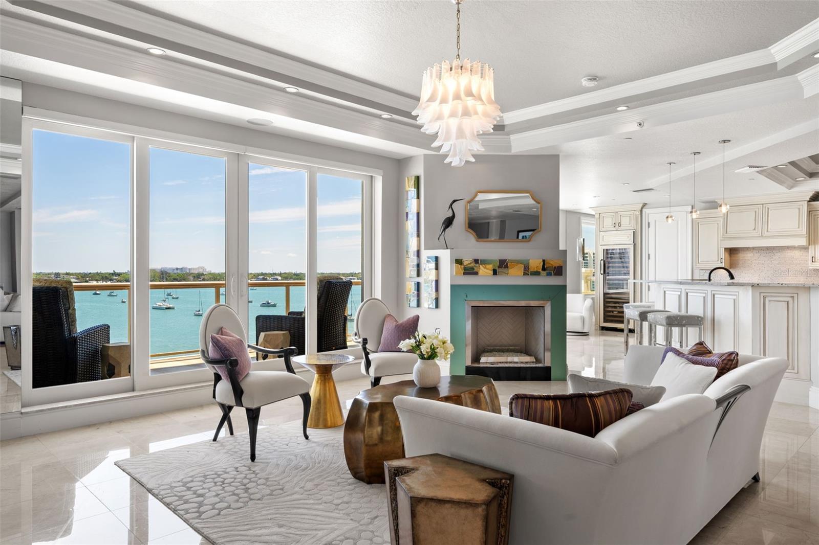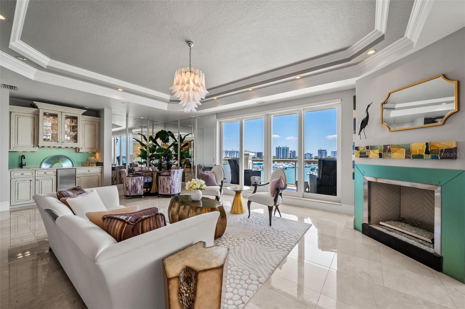 Commanding breathtaking panoramas of Sarasota Bay, the downtown skyline, and the barrier islands beyond, this exceptional 3-bedroom, 4.5-bath residence at La Bellasara enjoys a rare 7th-floor vantage point on coveted Golden Gate Point. Encompassing over 3,490 square feet and finished with neutral marble floors throughout, the residence lives like a private waterfront home--blending expansive interiors, refined design, and effortless access to the heart of downtown Sarasota. The primary suite is a true retreat, distinguished by two completely separate his-and-hers bathrooms, offering an uncommon level of space and privacy. A private elevator opens to an elegant entry foyer, setting the tone for interiors defined by high ceilings, crown molding, and a light, coastal palette. Walls of glass frame sweeping water and city views while filling the open-concept living and dining areas with natural light. The spacious great room flows seamlessly to expansive bayfront terraces, creating an ideal setting for both entertaining and everyday living. The gourmet kitchen is thoughtfully appointed with a large center island, breakfast bar, custom cabinetry, and premium appliances including a 6-burner Dacor gas range, Sub-Zero refrigeration, Wolf oven and warming drawer (new in 2025), and convection microwave. Designed to connect effortlessly with the main living areas, it offers both function and style for casual dining or hosting. The primary suite enjoys direct terrace access along with dual walk-in closets and the rare distinction of two separate full bathrooms, creating a true private retreat. Two additional guest suites, each with en-suite baths and access to private terraces, provide comfort and privacy for family and visitors alike. Outdoor living is equally compelling, with multiple terraces that capture panoramic bay and skyline views. A summer kitchen and built-in gas grill enhance the experience, offering the perfect backdrop for sunset gatherings or quiet evenings overlooking the water. La Bellasara is an intimate, gated waterfront community of just 28 residences, offering the privacy of a single-family home with the ease of luxury condominium living. Residents enjoy a full suite of amenities including concierge services, a bayfront heated pool and spa, fitness center, theater and social rooms, and a courtesy day dock. Each residence includes a private two-car garage, and specific to this residence a deeded boat slip. Ideally located just moments from downtown Sarasota, St. Armands Circle, and the area's renowned beaches, this is a rare opportunity to enjoy refined waterfront living in one of Sarasota's most sought-after bayfront communities.