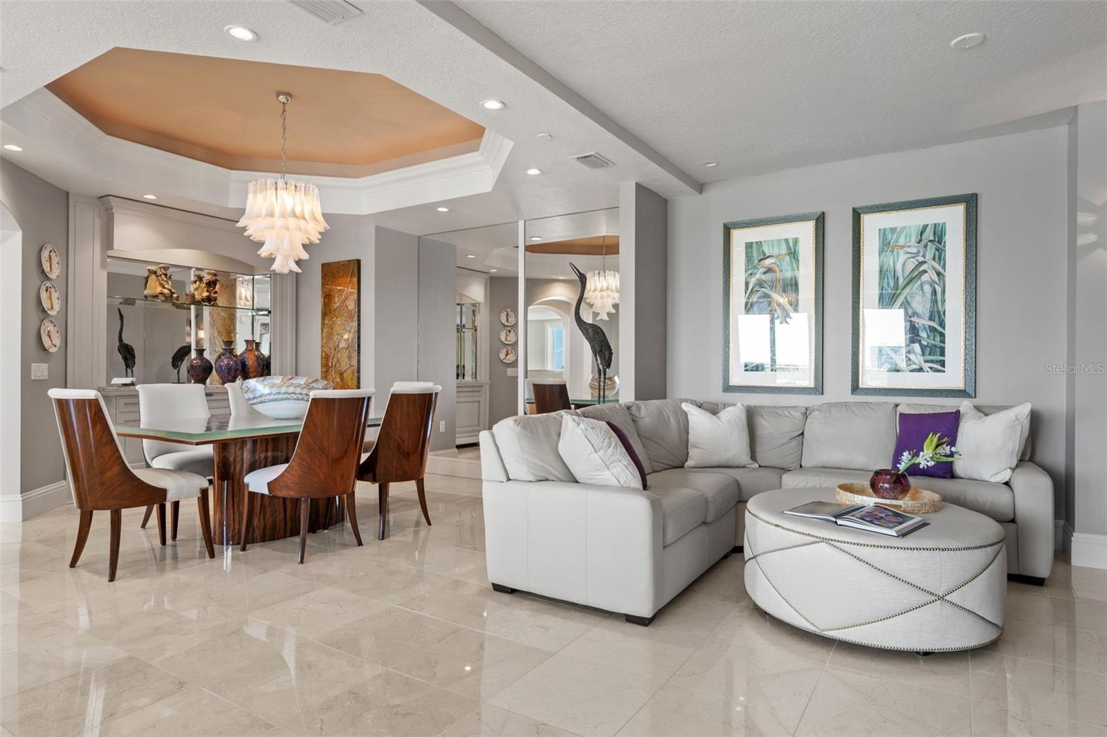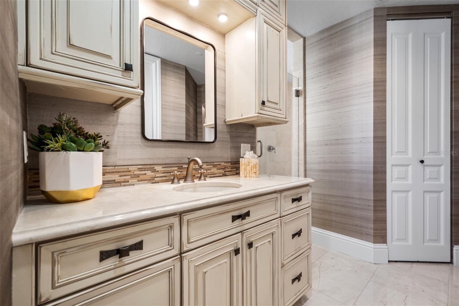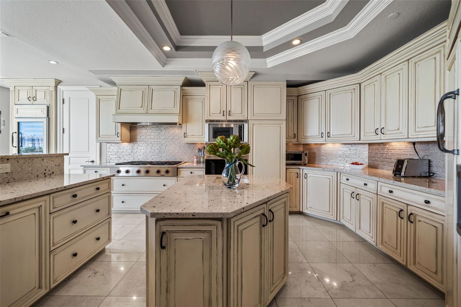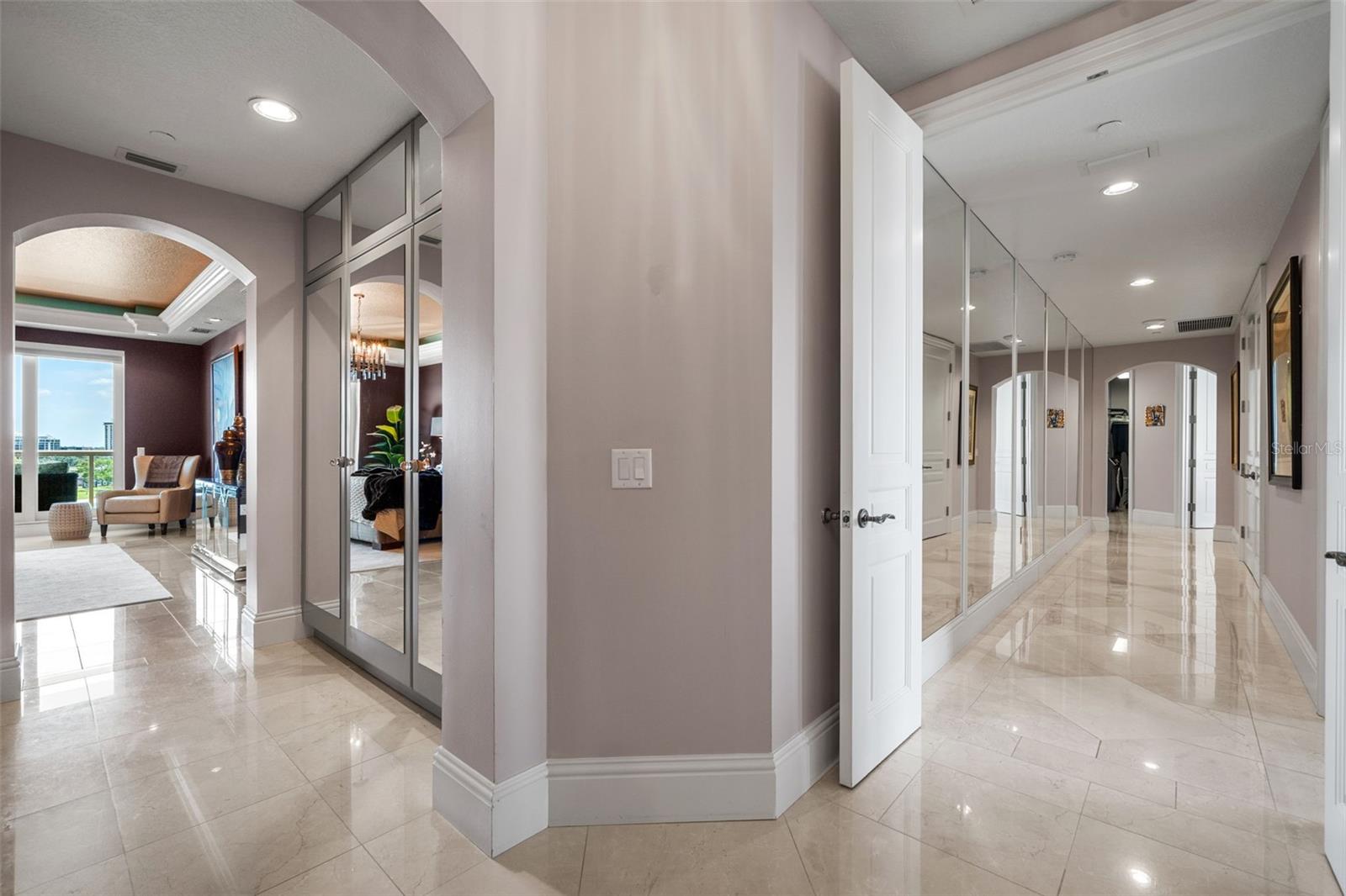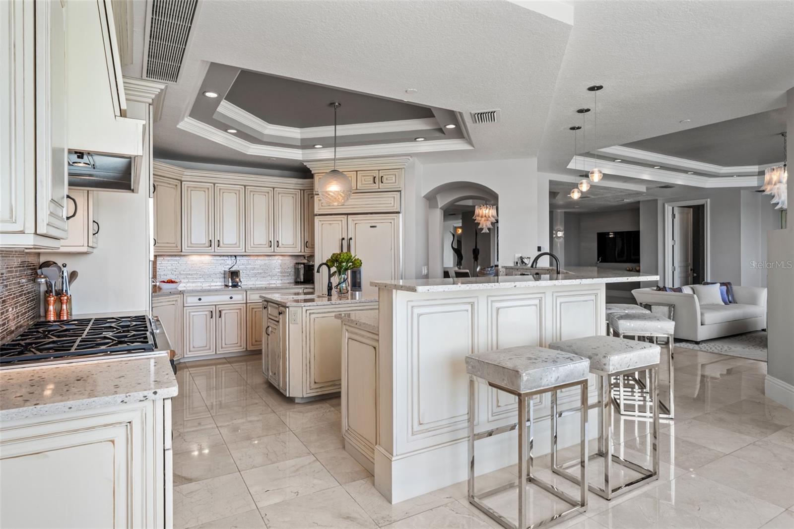 Commanding breathtaking panoramas of Sarasota Bay, the downtown skyline, and the barrier islands beyond, this exceptional 3-bedroom, 4.5-bath residence at La Bellasara enjoys a rare 7th-floor vantage point on coveted Golden Gate Point. Encompassing over 3,490 square feet and finished with neutral marble floors throughout, the residence lives like a private waterfront home--blending expansive interiors, refined design, and effortless access to the heart of downtown Sarasota. The primary suite is a true retreat, distinguished by two completely separate his-and-hers bathrooms, offering an uncommon level of space and privacy. A private elevator opens to an elegant entry foyer, setting the tone for interiors defined by high ceilings, crown molding, and a light, coastal palette. Walls of glass frame sweeping water and city views while filling the open-concept living and dining areas with natural light. The spacious great room flows seamlessly to expansive bayfront terraces, creating an ideal setting for both entertaining and everyday living. The gourmet kitchen is thoughtfully appointed with a large center island, breakfast bar, custom cabinetry, and premium appliances including a 6-burner Dacor gas range, Sub-Zero refrigeration, Wolf oven and warming drawer (new in 2025), and convection microwave. Designed to connect effortlessly with the main living areas, it offers both function and style for casual dining or hosting. The primary suite enjoys direct terrace access along with dual walk-in closets and the rare distinction of two separate full bathrooms, creating a true private retreat. Two additional guest suites, each with en-suite baths and access to private terraces, provide comfort and privacy for family and visitors alike. Outdoor living is equally compelling, with multiple terraces that capture panoramic bay and skyline views. A summer kitchen and built-in gas grill enhance the experience, offering the perfect backdrop for sunset gatherings or quiet evenings overlooking the water. La Bellasara is an intimate, gated waterfront community of just 28 residences, offering the privacy of a single-family home with the ease of luxury condominium living. Residents enjoy a full suite of amenities including concierge services, a bayfront heated pool and spa, fitness center, theater and social rooms, and a courtesy day dock. Each residence includes a private two-car garage, and specific to this residence a deeded boat slip. Ideally located just moments from downtown Sarasota, St. Armands Circle, and the area's renowned beaches, this is a rare opportunity to enjoy refined waterfront living in one of Sarasota's most sought-after bayfront communities.