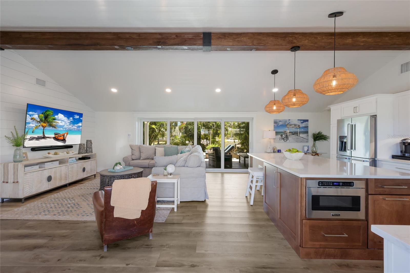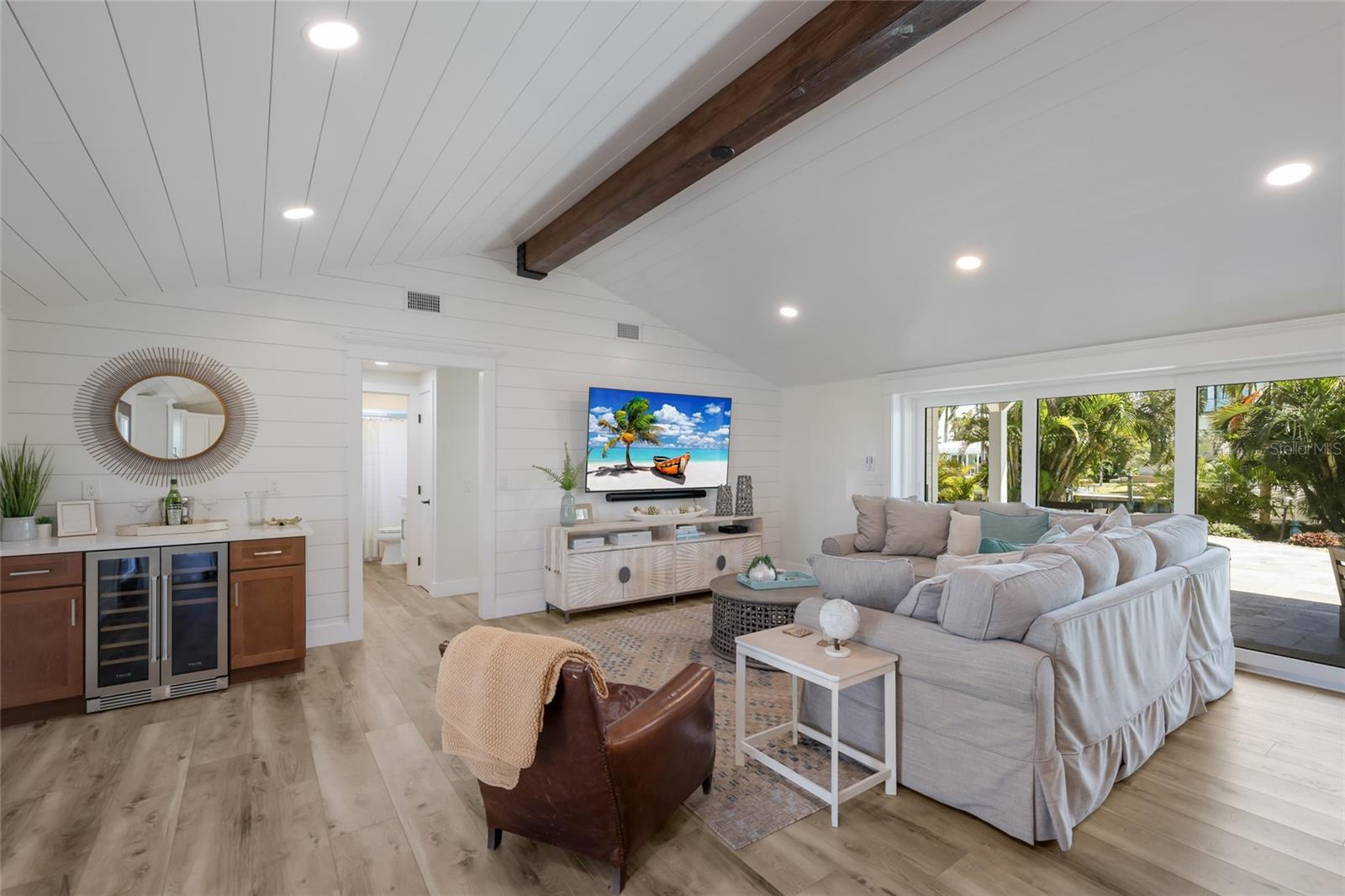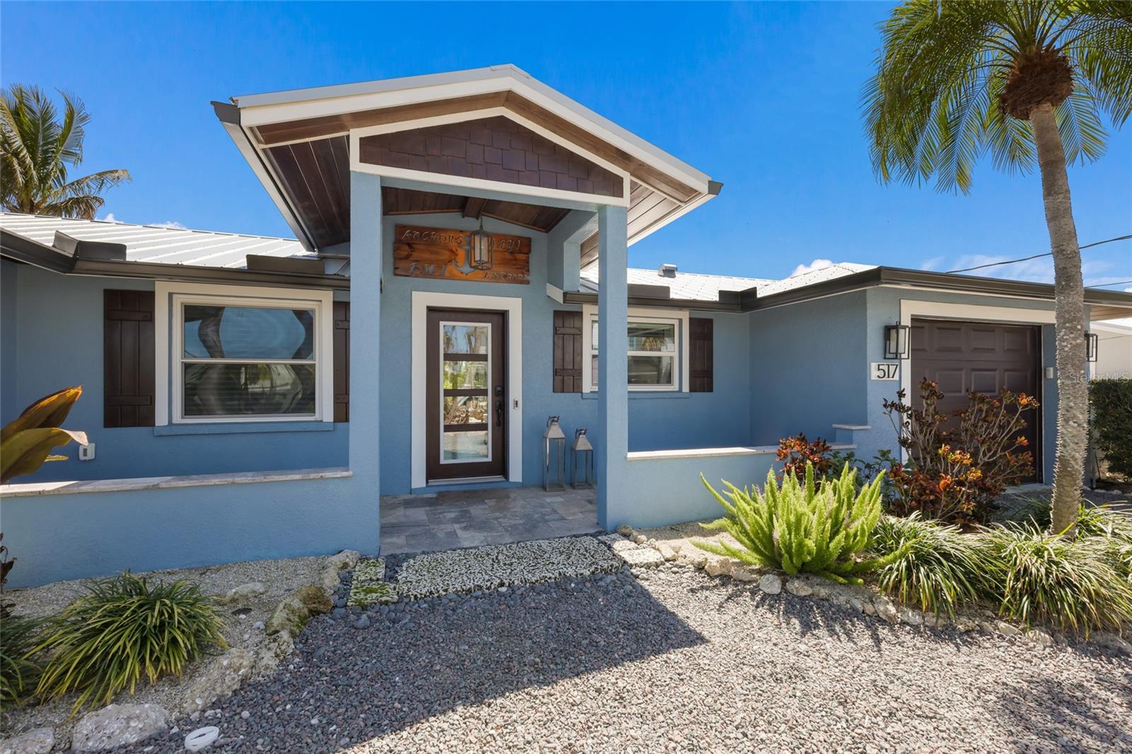 Nestled on a quiet canal in the heart of Holmes Beach this waterfront, turnkey furnished 3BD/3BA home brings together thoughtful design and the relaxed pace of island living. From the moment you step inside, the main living space feels open and welcoming, with vaulted ceilings, exposed beams, and shiplap walls that add warmth and character throughout the home. The kitchen is designed to be part of the conversation, centered around a spacious island with seating and plenty of room to gather, along with a dry bar that makes entertaining simple. This split bedroom plan features two en suites as well as a spacious third bedroom and hall bath. Natural light fills the space and large sliding doors connect the living area to the outdoor oasis where the setting truly comes to life. Features include a covered patio offering extending living/dining space that sits along the sparkling free form pool, beautiful exterior lighting elements, hot/cold outdoor shower all surrounded by tropical landscaping that adds privacy and a true island feel. An oversized dock features a 10,000 lb lift, snook lights and sitting area over the waters edge. This home has also been a successful monthly rental so you can also enjoy having the option of rental income too! Comfortable, inviting, and perfectly suited for life on the island, this canal front home offers a wonderful place to enjoy all that Anna Maria Island has to offer.