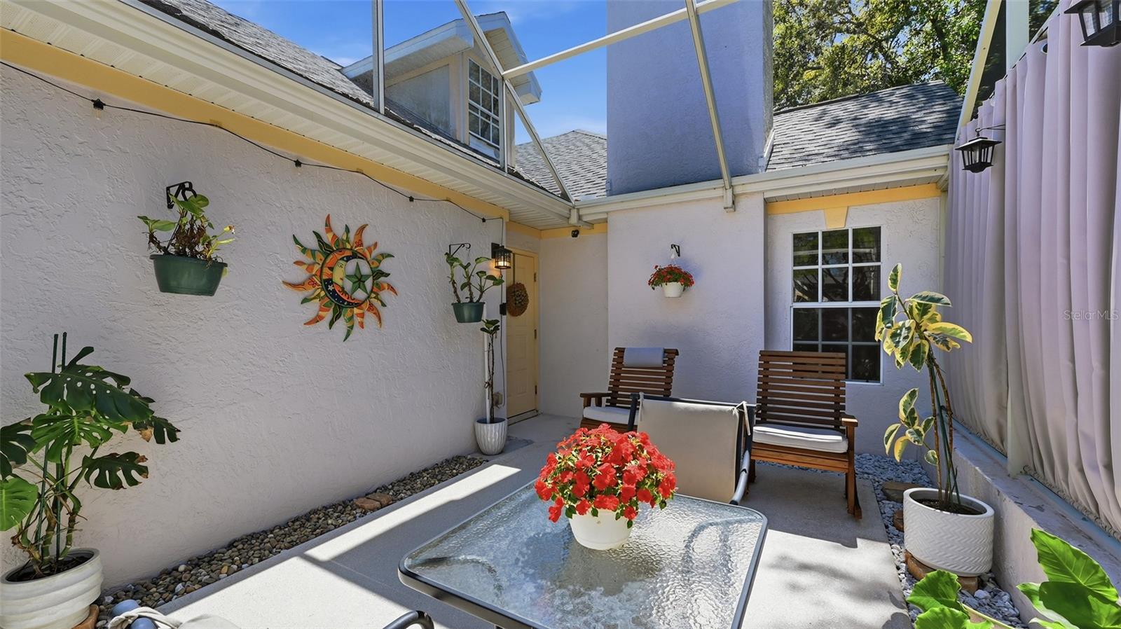 LUXRY PLUS LIFESTYLE RETREAT VILLA - Beautiful interior finishes and positioned on a premium corner lot in an intimate maintenance-free enclave community of only 66 homes. This elegant yet warm and inviting villa offers 2 bedrooms plus a den, 2.5 baths, and an oversized 2-car garage with two new garage door openers (2024). The home is thoughtfully updated with new appliances (2025), new A/C (2024), plush carpeting (2023), new window screens (2024), and finished with deluxe window shades. The floor plan has spacious rooms and an abundance of storage closets and garage storage space as well. A vaulted, screened lanai creates seamless indoor-outdoor living, filled with natural light throughout the day, while a cozy fireplace in the living room adds warmth and charm -- creating a true Florida sanctuary. The main level includes a private primary suite, a versatile office/den, and a convenient half bath. The beautifully designed slate-gray kitchen opens to the expansive dining and living areas, ideal for both everyday living and entertaining. Upstairs, a second bedroom with en suite bath and walk-in closet provides comfort and privacy for guests. Just steps away, enjoy the community's heated pool overlooking a tranquil pond, a clubhouse with full kitchen, and a fitness room. Ideally located with easy access to I-75 and just minutes from shopping, dining, parks, The Legacy Trail, Home Depot, hospitals and award-winning Siesta Beach!