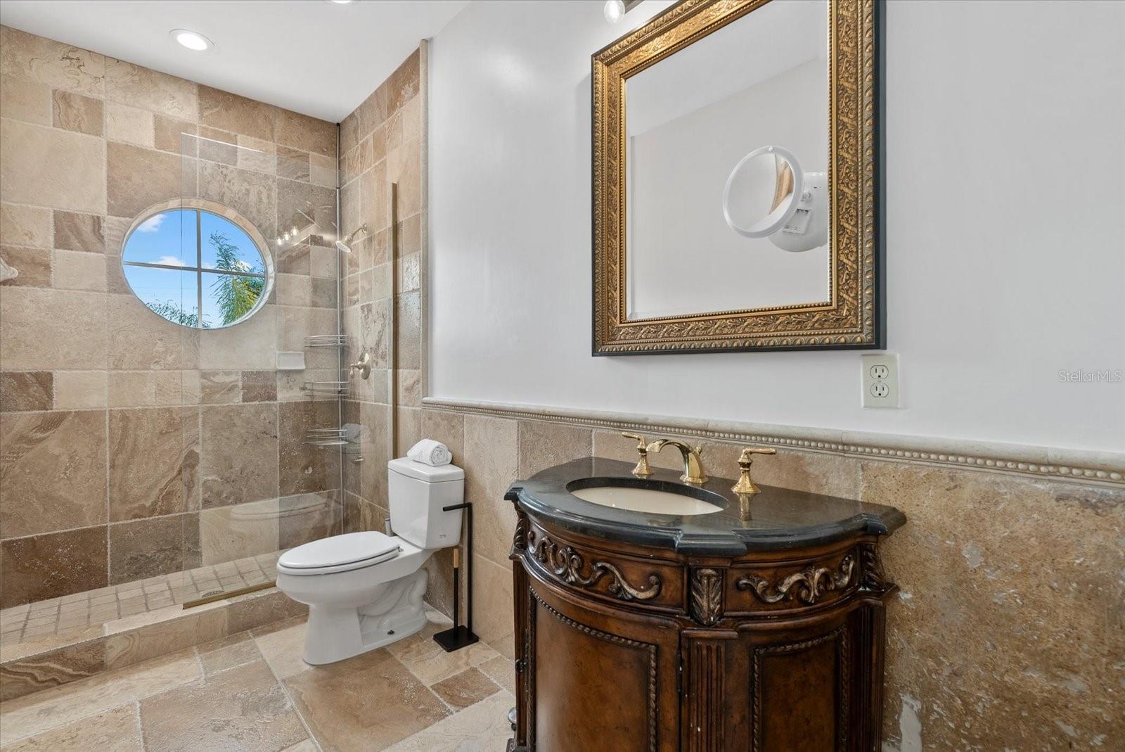 Exterior: Balcony, French Doors, Hurricane Shutters, Lighting, Outdoor Grill, Outdoor Kitchen, Outdoor Shower, Private Yard, Rain Gutters