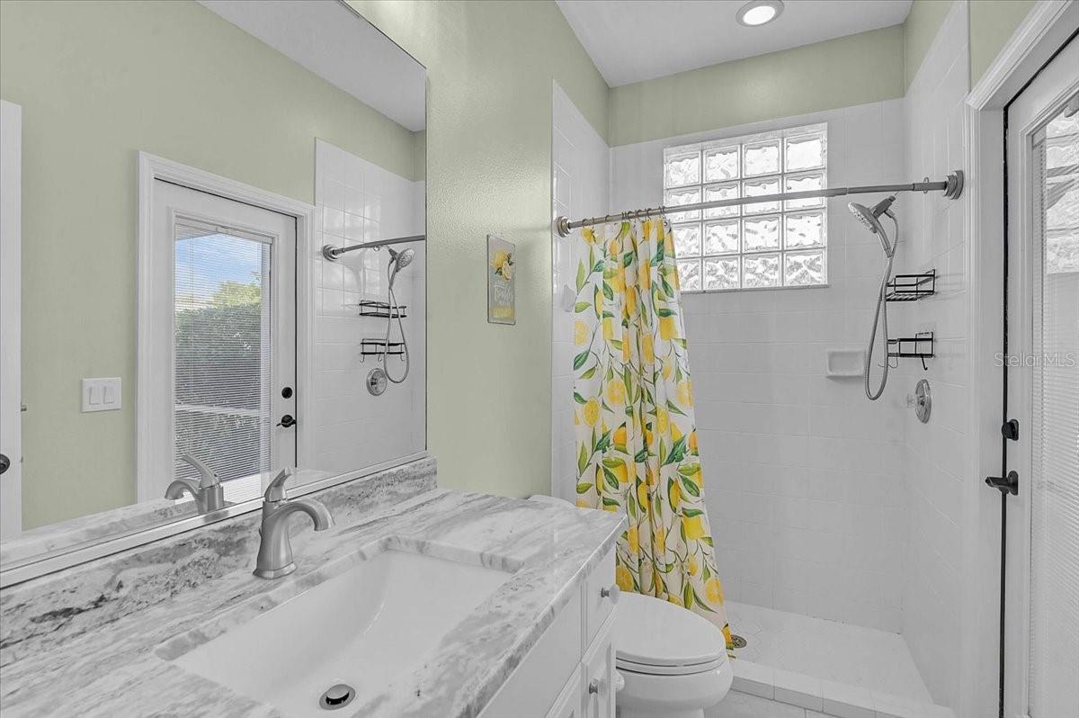 Exterior: French Doors, Lighting, Outdoor Shower, Rain Gutters, Sidewalk, Sliding Doors