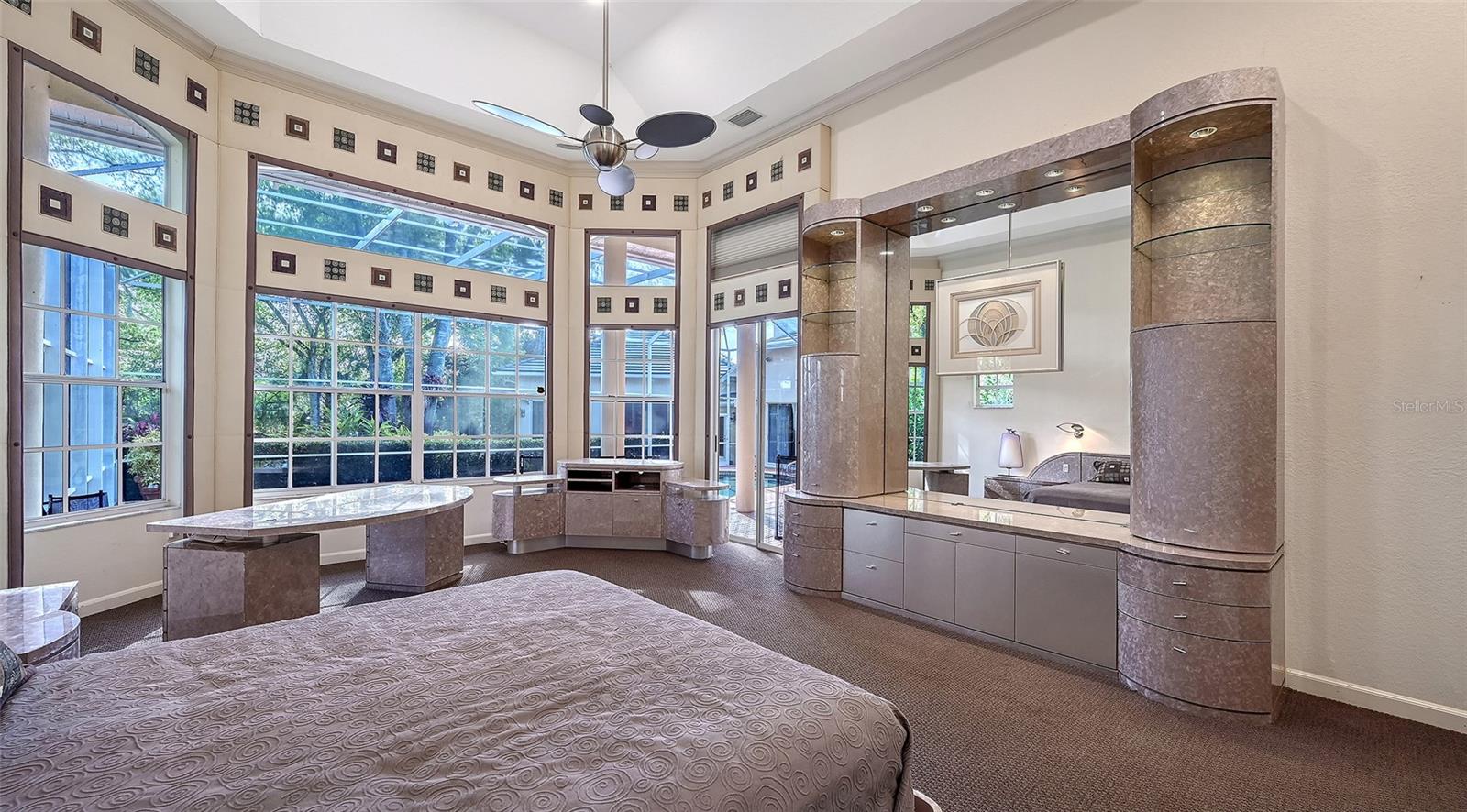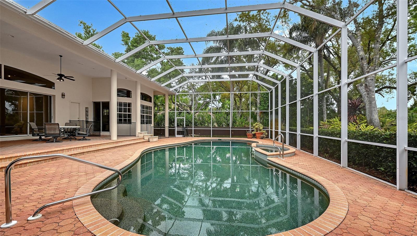 Nestled amongst stately trees you will discover the coveted community of Ashley. Privacy galore and estate sized homes where each are individually designed to offer sophistication without being overstated. This expansive 4 Bedroom, 2.5 Bath (with addition totaling 6 Bedrooms, 4.5 Baths), offers 5154 sq ft and sits on nearly an acre, creating a true private mini estate. Set back from the road, the home features a long paver driveway and lush landscape that enhance its grand curb appeal. Inviting leaded doors open to an enormous living room with volume ceilings, quadruple sliders overlooking the patio and pool area, seamlessly blending indoor and outdoor living. The formal dining room is elevated by a stunning Murano glass chandelier, and throughout the home you will appreciate the sellers' collaboration with interior designer Anne Folsom Smith, reflected in the thoughtful details and refined finishes. The heart of the home is the well-appointed kitchen, featuring a center island with sink and instant hot water, extensive stone countertops, island cooktop, stainless appliances including double oven, warming drawer and Sub-Zero refrigerator, along with designer cabinetry. An adjoining built-in breakfast nook easily accommodates gatherings of any size. Just steps away, the family room offers a warm and inviting space with propane gas fireplace and custom designer built-ins - perfect for everyday living and entertaining. The primary suite is a true retreat and a statement in design, featuring an oversized jetted tub, custom multi-head shower, instant hot water system, dual vanities, and 2 walk-in closets. All secondary bedrooms are generous in size, including the fourth bedroom, which is currently utilized as a den/office with custom built-ins, offering flexibility to suit your needs. Enhancing the home's versatility is a newer addition featuring a 2-bedroom, 2 bath suite complete with kitchenette and its own washer/dryer. This unique space offers two separate entrances - double doors off the family room that allow it to function as a seamless extension of the living area, as well as a private exterior entrance for added independence and privacy - ideal for multigenerational living, guests, or flexible lifestyle needs. Impact windows on the addition add to this special area. The enclosed pool area provides a serene outdoor escape with a shaded seating area and oversized lanai, perfect for year-round enjoyment. Additional features include a whole house water filter and softener system, central vacuum, 4 HVAC systems (including garage), irrigation system with new tank, electric pool heater, propane generator, 3 garbage disposals, 2 dishwashers, and a new roof installed in 2020. Conveniently located near shopping, dining options, I-75, A-rated schools, golf, and Gulf beaches, this exceptional property is a rare opportunity offering space, privacy, and flexibility in a highly desirable setting.