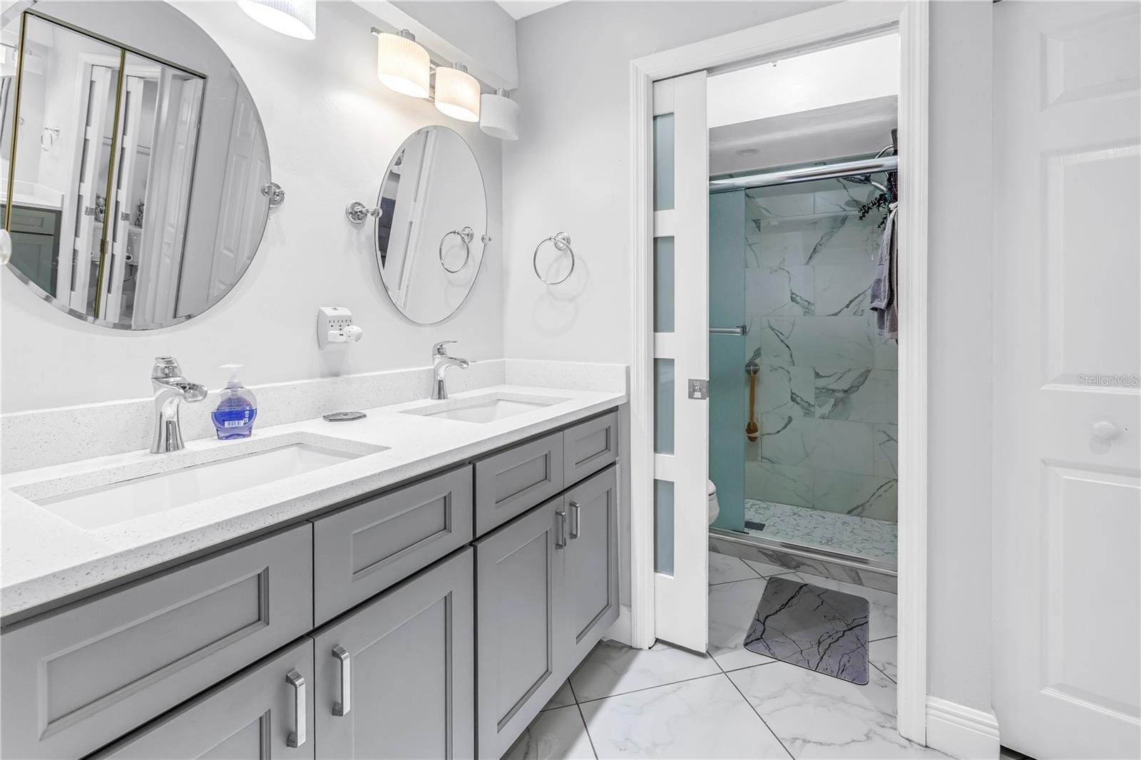 Welcome to popular Spring Lakes a dedicated bird and wildlife sanctuary evidenced as you meander through the lushly landscaped neighborhood. This ground level home is uniquely different from most other floor plans in that the updated kitchen is large enough for a sizeable dining table in addition to a darling coffee station and full-size washer and dryer. Updates include deep quartz sink and counter tops, pull out pantry drawers, soft close 42" upper cabinets and drawers and attractive tile backsplash complimented by ambient lighting. The split plan provides for maximum privacy with bedrooms separated by the living/dining rooms. No mismatched floors in this continuously tiled on the diagonal floors throughout the entire home, complimented by updated baseboards and crown molding in the living/dining room. Both baths have been updated with quartz counters on the newer vanities and safety grab bars installed in the showers with the primary bath having plenty of closet space including a walk in. It is offered fully furnished and, most importantly, all windows have been replaced with expensive storm rated windows and sliding doors maximizing efficiency and noise reduction. You will enjoy the view and sitting on the private 22X10 beautifully pavered patio overlooking more Florida fauna. This phase of Spring Lakes is also one of the few if not only, that has been granted permission for pickup trucks and the roofs were replaced in 2025 and is completely paid for. The AC and water heater were replaced in 2025 so all of the big-ticket items have been accounted for. This lovely Florida landscaped neighborhood offers several pools and spas as well as tennis and pickleball courts that many of the residents enjoy daily. The location is the best of the best being 5 to 20 minutes from everything Manatee County has to offer including our wonderful white sandy beaches, golfing, boating, groceries, retail shopping, medical facilities, houses of worship, live and on screen theaters, museums, tons of sport venues, shop till you drop at UTC Mall and famous St Armands Circle, Downtown Bradenton's River Walk, and last but not least, Sarasota Bradenton International Airport. Come make this special home yours before it is gone.