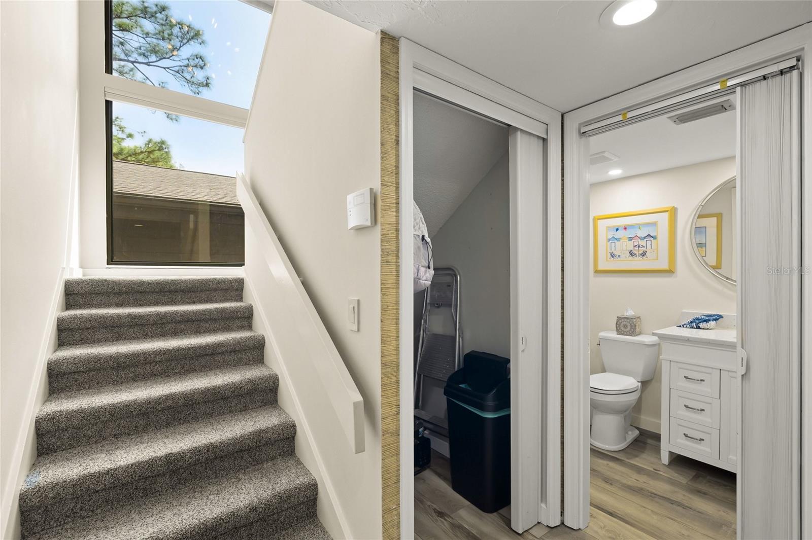 Welcome to Chandlers Forde in The Meadows--a neighborhood surrounded by mature trees and the peaceful feel of an enchanted forest. This beautifully renovated villa-style condo with 2 car garage offers ultimate privacy with a wooded view and a glimpse of the golf course beyond. This 2-bedroom, 2.5-bath home with a den (which can easily be converted into a third bedroom) has been tastefully updated from top to bottom. The home has a cozy yet elegant feel, with soaring ceilings and a grand double-sided stone fireplace that serves as the centerpiece of both the living and dining rooms. The living room is extra spacious, with tranquil views of the trees--an ideal space for hosting or simply relaxing by the fire. The kitchen was completely redesigned in 2023-2024, featuring leathered granite countertops, solid wood cabinetry, some premium Bosch appliances, and an oversized chef's prep sink. A custom coffee counter and the addition of a dry bar with wine fridge between the dining room and living room make the space perfect for entertaining. Just off the living room and primary suite is a Florida room--perfect for al fresco dining, morning coffee, or relaxing after a long day. With electric already in place, it's ready for your new hot tub. The main-floor primary bedroom is expansive and elegant, featuring a walk-in closet with custom built-ins for maximum organization. The ensuite bath feels like a private spa, offering quartz countertops, a walk-in shower with custom glass door, and serene finishes throughout. The main floor also includes a renovated half bath (2024) and a laundry area with washer and dryer hookups for convenience. Upstairs is illuminated by an elegant mid-century modern chandelier and large hurricane-impact windows that invite in an abundance of natural light. The open den/office space w/ built-in closet can easily serve as a third bedroom. A guest bedroom with vaulted ceilings overlooks the trees, an updated guest bath with quartz countertops, a tub-shower combination, and extra closet space rounds out the second floor. Beyond the beauty, this home offers peace of mind. All windows and exterior sliders are hurricane-impact rated. The waste pipes have been replaced with PVC, and electrical hookups have been added for the included generator. Additional upgrades include a Kinetico reverse osmosis system at the kitchen sink and refrigerator, a whole-house water softener, two new AC units (2018) with duct cleaning in 2024, and GE front-loader washer and dryer (2023) and the roof was replaced in 2022. In Chandlers Forde, residents enjoy two private pools, while The Meadows offers a lifestyle unlike any other in Sarasota with 14 miles of walking and biking trails winding through over 1,650 acres of mature landscaping, ponds, and natural preserves. For a small fee there is access to a state-of-the-art fitness center, JR Olympic pool, golf, tennis, and 10 pickleball courts. The community also includes a dog park and an active social calendar hosted by the community center. Ideally located between downtown Sarasota and University Town Center, The Meadows places you 5 minutes from UTC, Benderson Park, the new Mote Marine campus, fine dining, and shopping, 15 Minutes to Sarasota's downtown cultural offerings--including the symphony, opera, ballet, and locally owned restaurants and 20 minutes to St Armands circle and award winning beaches. This stunning home combines luxury, comfort, and nature--truly a place to call home.