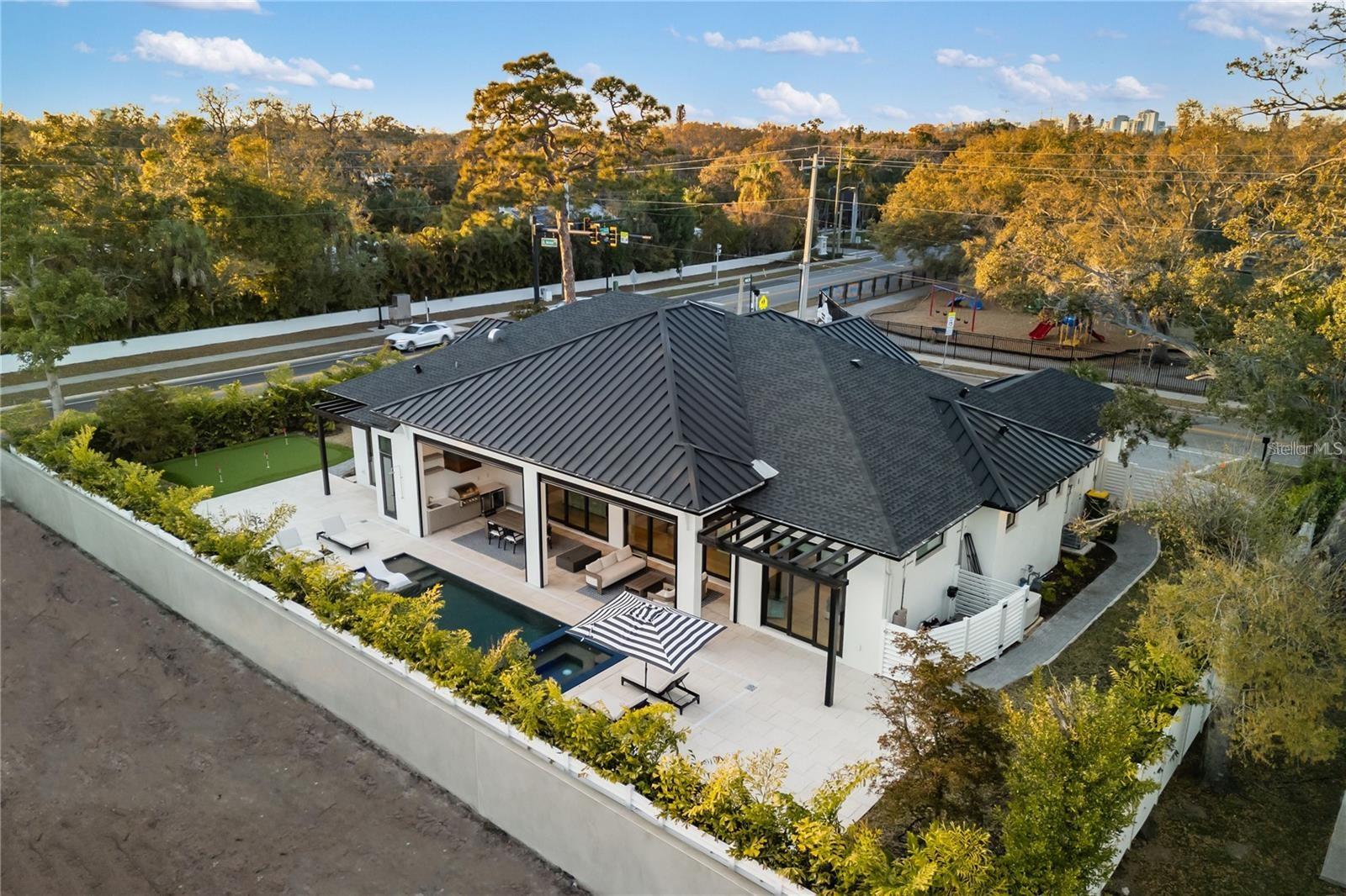 Nestled in the heart of West of the Trail, this luxury single-story estate represents the pinnacle of modern living. Encompassing 3,262 square feet, the home features 4 bedrooms, 4 full bathrooms, and 2 half baths, all thoughtfully designed for both comfort and functionality. Set on an expansive 15,930-square-foot lot, the residence offers tranquility just moments from the shops and dining of Southside Village. Enjoy the convenience of a circular driveway with a custom paver design and garage space for three cars. With striking architecture, impeccable craftsmanship, and beautiful, thoughtfully curated finishings--showcasing detailed trim work and refined design throughout--this residence delivers sophistication and all-inclusive resort-style living in one of the area's most desirable locations.Inside, soaring 18-foot vaulted ceilings and custom tray ceilings enhance the open-concept layout, while 12-foot full pocket sliders seamlessly connect indoor and outdoor living spaces. The living room is anchored by a sleek fireplace, creating a warm yet modern focal point. The chef's kitchen is equipped with professional-grade gas appliances, a waterfall-edge quartz island, custom cabinetry, and an expansive butler's pantry for effortless entertaining. A glass-enclosed wine display and tray ceiling details add dramatic appeal. The primary suite features 14-foot ceilings and a spa-inspired bath with a freestanding soaking tub, dual vanities, and a luxurious walk-in shower. All bedrooms include custom California Closets. A designated large office, spacious laundry room, and private gym complete the interior amenities. The home also has a full security system installed.Outdoors, the resort-style backyard showcases a heated saltwater pool and hot tub spa with elegant water features. The back patio, finished with a Brazilian hardwood ceiling, is enhanced with remote-controlled mosquito blinds for year-round comfort, as well as a full sound system that can be app controlled. A fully equipped outdoor kitchen, fire pit, and outdoor SunBrite TV create the ultimate entertaining space, while a private putt-putt golf course adds a one-of-a-kind touch to this exceptional property.Please let us know how we can help and give us a call to set up a tour of this beautiful home. Thank you.