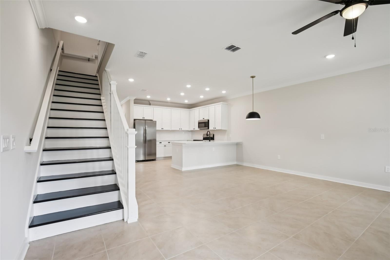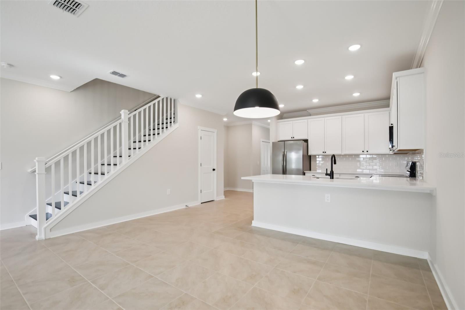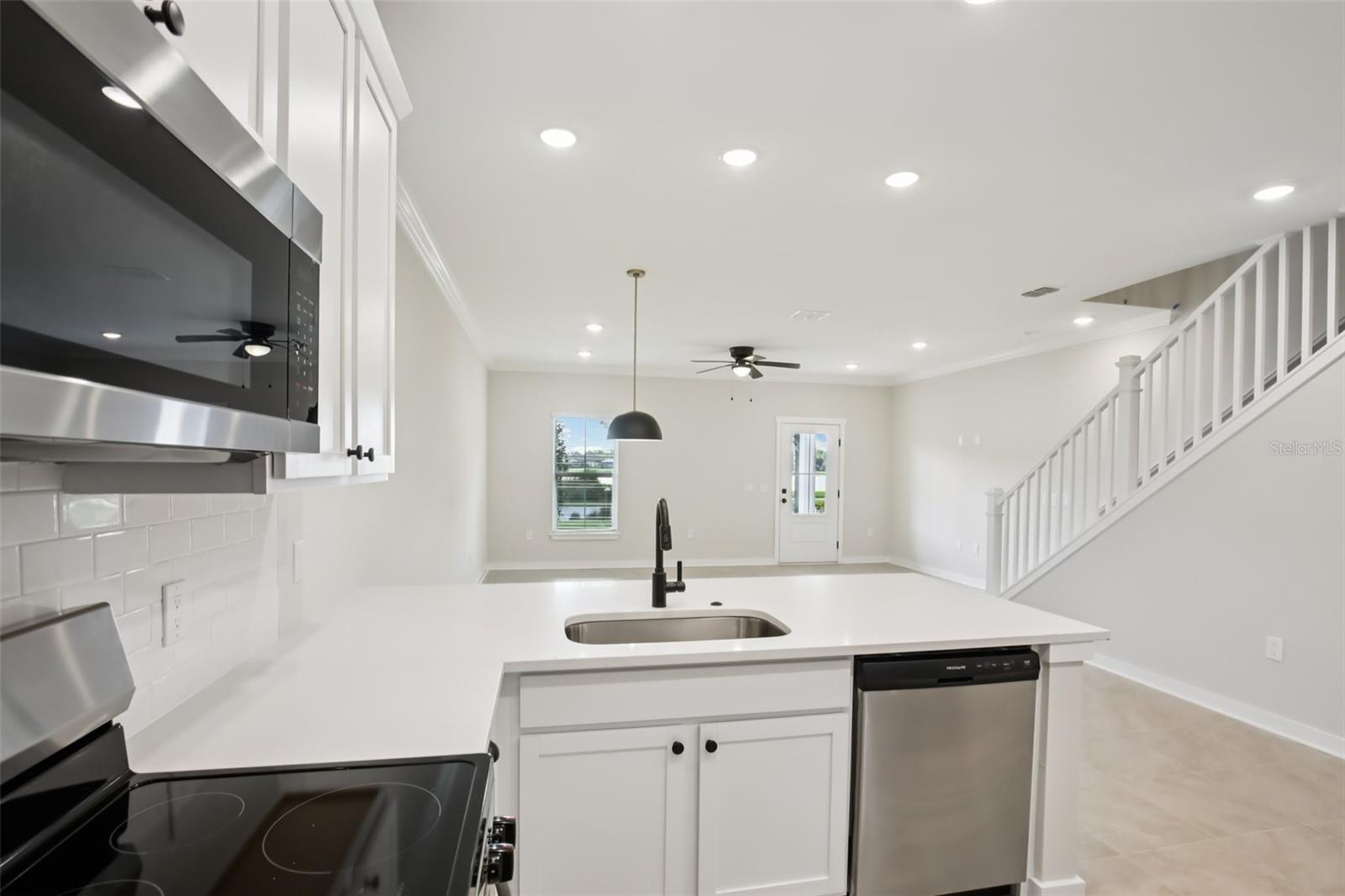 **When using builders preferred lender builder will contribute up to $24,000 towards buyers closing cost or rate buy down** Welcome Home, to your Sanctuary. Beautifully appointed townhome featuring 42" white cabinets with crown molding, black hardware, quartz countertops, subway tile backsplash, stainless steel appliances, and a farmhouse-style single basin sink. Designer lighting and 12x12 cream tile flow throughout the main living areas, with a hardwood staircase and open railing adding a modern touch. Both bathrooms include floor-to-ceiling tiled showers and dual vanities. Impact glass windows and doors provide added efficiency and peace of mind. Enjoy a tranquil water view in this thoughtfully designed, low-maintenance home blending modern finishes with coastal inspired living.