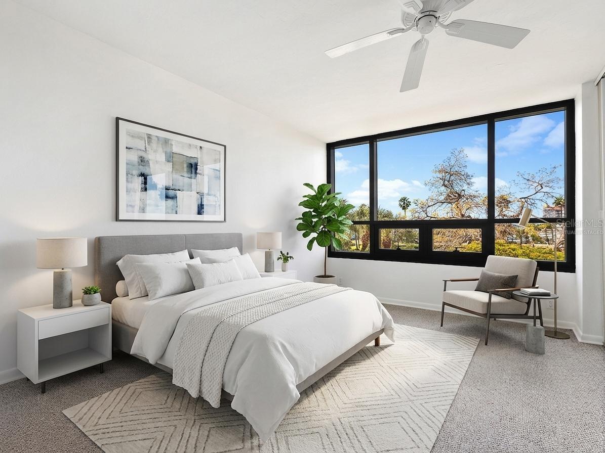One or more photo(s) has been virtually staged. Refined downtown living awaits at Bay Plaza, a premier address along Gulfstream Avenue and one of Sarasota's most established and distinguished buildings -- designed by the celebrated architect Tim Siebert. This exceptional second-floor residence offers something increasingly rare in urban living: a genuine connection to nature and neighborhood, with tree-lined street views below and partial marina glimpses that shift beautifully with the light and seasons.Perfectly positioned, this is a home that places you at the center of Sarasota's most vibrant cultural tapestry -- steps from fabulous restaurants, the iconic Opera House, art galleries, charming coffee shops, live theatre, boutique shopping, and the beloved Saturday morning Farmer's Market. Yet despite this enviable proximity, the residence itself feels like a quiet retreat, grounded and peaceful above the gentle rhythm of the street.The well-executed split floor plan creates a natural sense of privacy and balance, with thoughtfully separated bedroom suites ideal for both full-time living and hosting guests. The living and dining areas are designed for effortless entertaining and everyday comfort, while a crisp, light-filled interior aesthetic is elevated by natural light and a seamless flow leading to a private covered balcony. Impact-resistant glass throughout the residence enhances safety and peace of mind, allowing you to enjoy the natural light and views with confidence. The kitchen anchors the living space with a practical and functional layout, offering considerable storage and a wine and beverage refrigerator -- a thoughtful touch for those who love to entertain.The primary suite is a peaceful sanctuary, framed by large picture windows that sit among the treetops, filling the space with natural light and a serene connection to nature and the water. A generous walk-in closet with custom built-ins provides organization and ample storage. The en-suite bath is thoughtfully appointed with wood cabinetry, dual sinks, and granite countertops, complete with a soaking tub and separate shower.Bay Plaza residents enjoy a full-service lifestyle that is second to none -- including 24-hour concierge, 24/7 valet service, EV charging stations, a resort-style pool and spa, and a state-of-the-art fitness center complete with sauna and steam room. The beautifully appointed lobby -- a hallmark of Siebert's vision -- showcases a grand piano, a library and media room, and elegant entertaining spaces for gathering with friends and fellow residents.This is a rare opportunity to own a home that offers timeless appeal, privacy, and effortless access to everything that makes Sarasota one of Florida's most coveted destinations. One or more photos has been virtually staged.