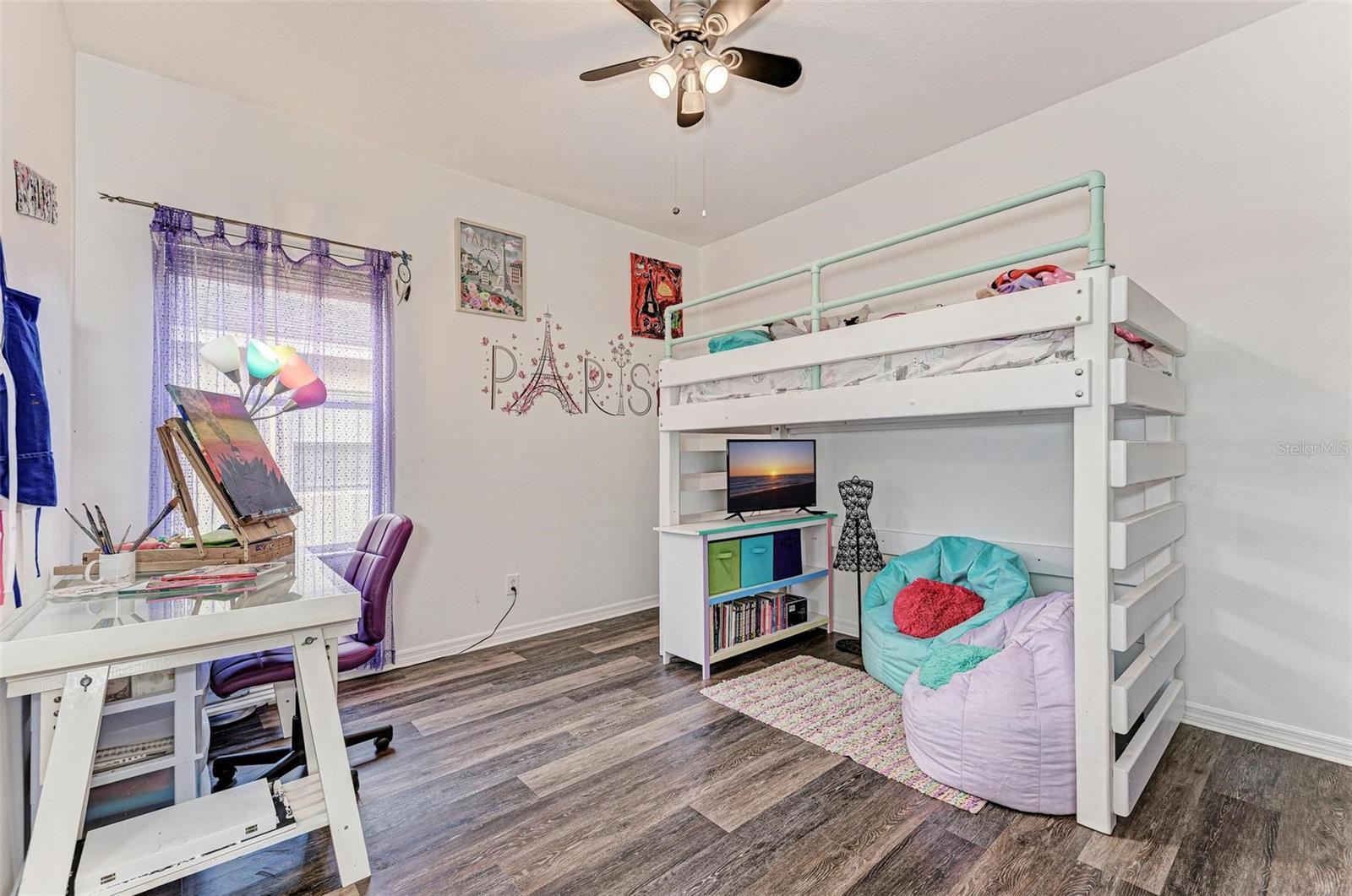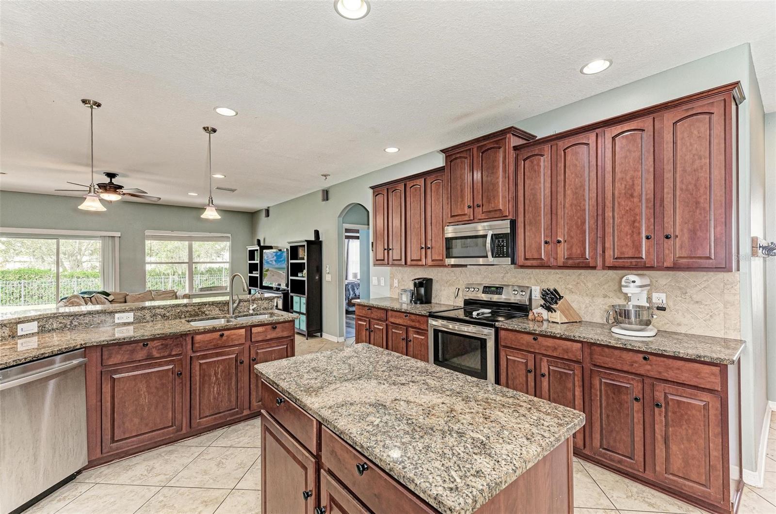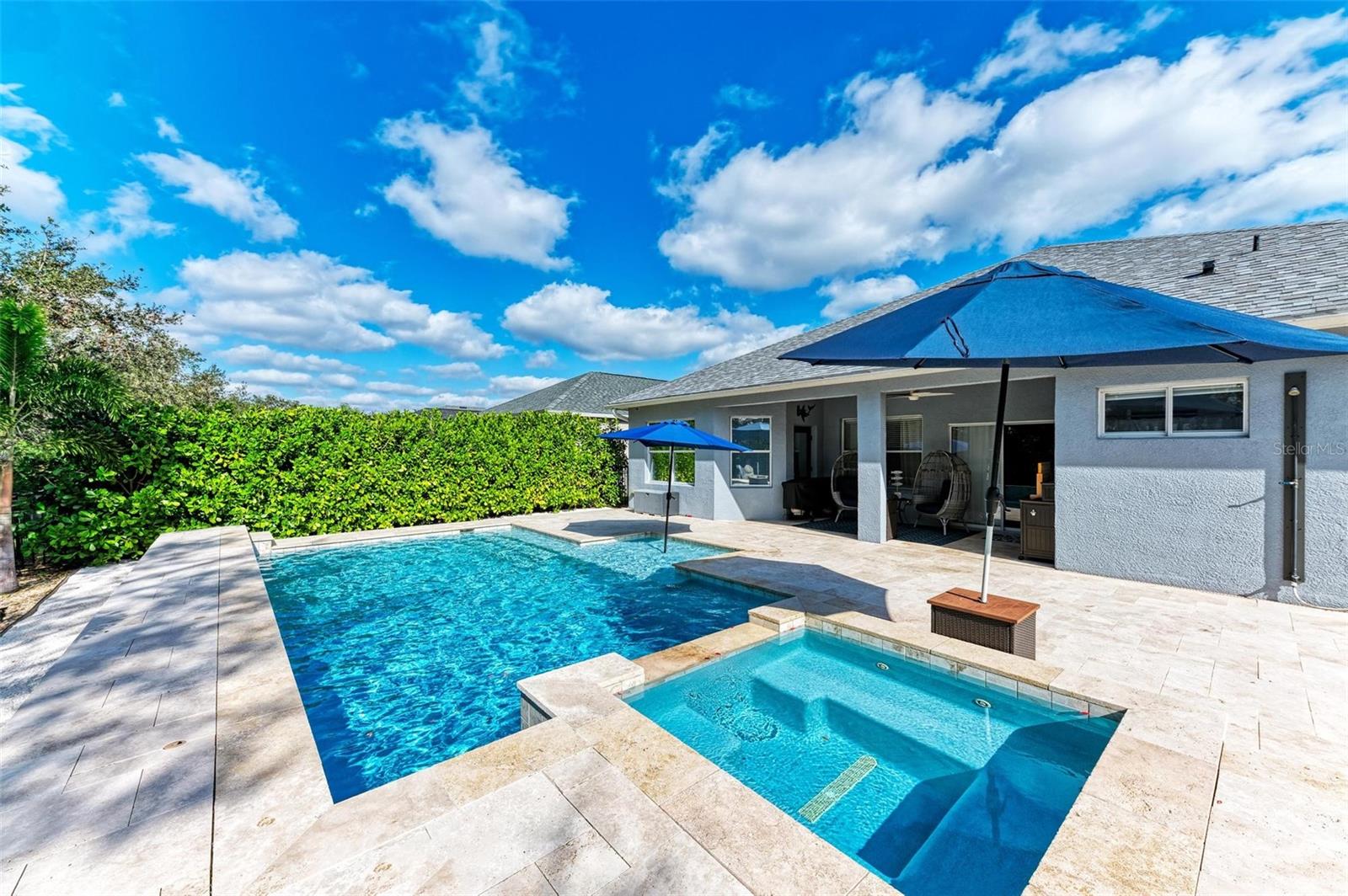 4 bedroom, 3 bath pool home with office (optional 5th bedroom) and 3-car garage in River Plantation. New roof 2023, new water heater 2025, AC is 2020 and this home is not located in a flood zone! Features include functional split floorplan with multiple flexible living spaces, including a formal dining room that can be used as a den, playroom, or additional living area. The central kitchen includes granite countertops, prep island, breakfast bar seating, reverse osmosis system, and ample cabinetry, with direct views of the pool and backyard. The primary suite overlooks the pool and includes a tray ceiling, dual vanities, garden tub, separate shower, and large walk-in closet. Three additional bedrooms are located on the opposite side of the home, along with an updated guest bathroom (new vanity and quartz counter) and a full pool bath with direct outdoor access. The backyard is designed for low-maintenance outdoor living with a heated saltwater pool, sunshelf, spa with jets, travertine deck, outdoor shower, and fire pit area. Additional features include gutters, irrigation system, laundry room with sink and storage cabinets, and a storage shed. River Plantation offers a low HOA with access to a community pool, clubhouse, basketball court, pickleball courts, playground, 2-mile nature trail, and canoe/kayak launch.