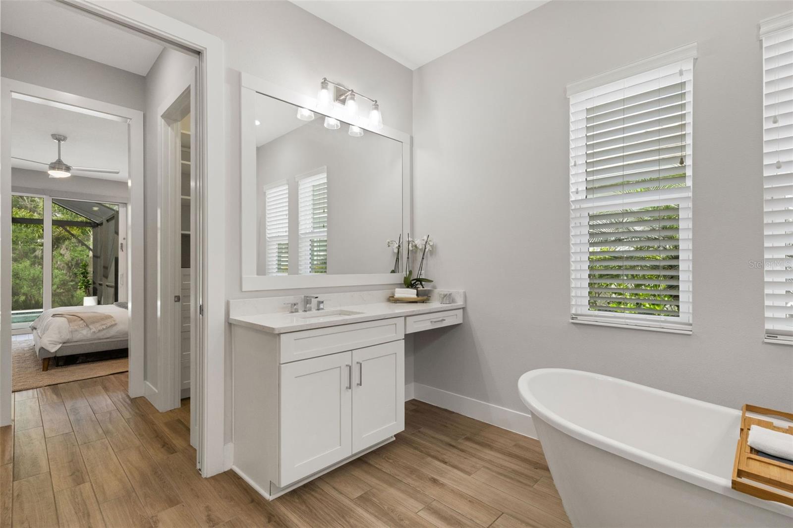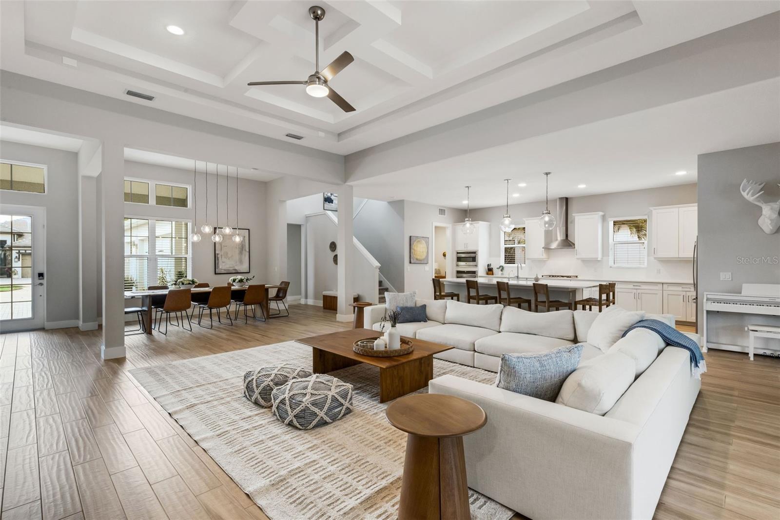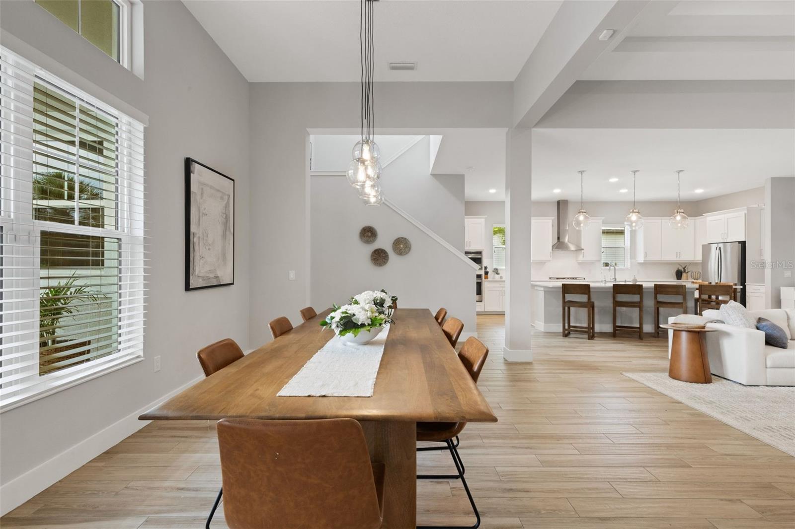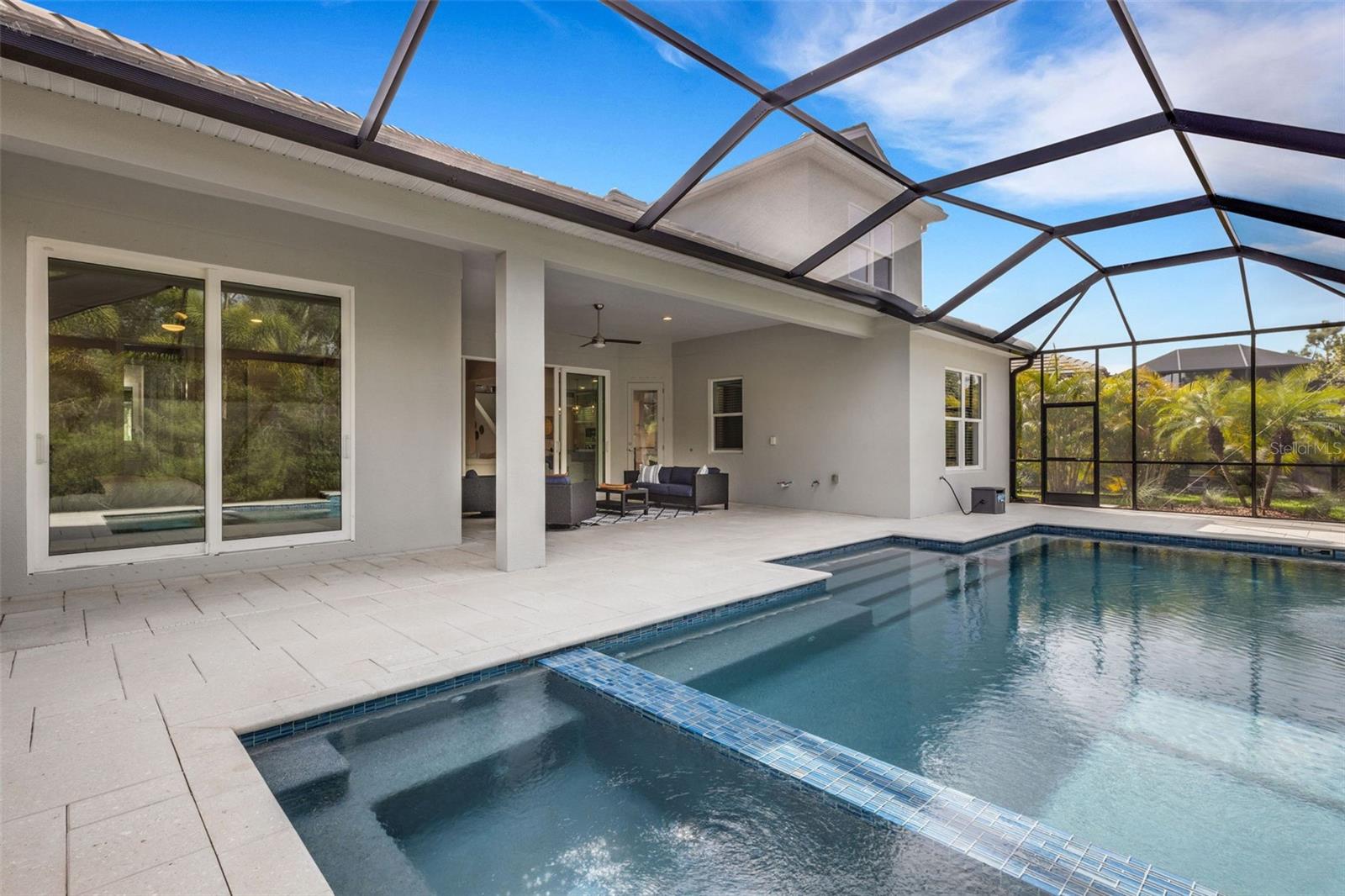 Striking coastal elegance and exceptional upgrades define this beautifully designed Tideland model, set on a PRIVATE PRESERVE homesite in the highly sought-after Lakehouse Cove at Waterside. With 3 bedrooms, 3 baths, a dedicated office, and an EXPANSIVE SECOND FLOOR BONUS SUITE, this home offers a rare combination of sophistication, space, and versatility.From the moment you arrive, the inviting front porch, manicured landscaping, and SIDE-FACING THREE CAR GARAGE create a polished first impression. Inside, soaring ceilings, 8-foot doors, and wood-look tile flooring throughout establish a light, airy feel, while the open-concept design flows effortlessly from one space to the next. The great room is a true centerpiece, featuring a COFFERED CEILING, custom FEATURE WALL, glass shelving, and a sleek marble-accented electric FIREPLACE.The GOURMET KITCHEN n is both stunning and highly functional, anchored by a LARGE QUARTZ ISLAND WITH SEATING FOR SIX, and complemented by a new gas cooktop, new refrigerator, walk-in pantry, tile backsplash, and abundant cabinetry--perfect for entertaining or everyday living.The primary suite offers a luxurious retreat with a FREE-STANDING SOAKING TUB, spacious walk-in shower, dual vanities with built-in seating, and custom closets. Two additional bedrooms, a private office with double doors and serene preserve views, and a well-designed laundry room complete the main level. Upstairs, a generous bonus area with full bath provides ideal space for guests, hobbies, or a private getaway.Step outside and experience resort-style Florida living at its finest. The HEATED SALTWATER POOL AND SPA and generously-sized lanai overlook a lush, private preserve, while the expansive shellstone paver lanai creates a seamless indoor-outdoor lifestyle designed for both relaxation and entertaining.Additional highlights include a whole-house generator, tankless gas water heater, water softener system, custom closets throughout, and a functional mudroom/drop zone.Located in one of Waterside's premier communities, Lakehouse Cove residents enjoy a lakeside clubhouse, resort-style pool and spa, fitness center, pickleball courts, scenic trails, and water taxi access to Waterside Place--offering dining, shopping, and entertainment just minutes from home.